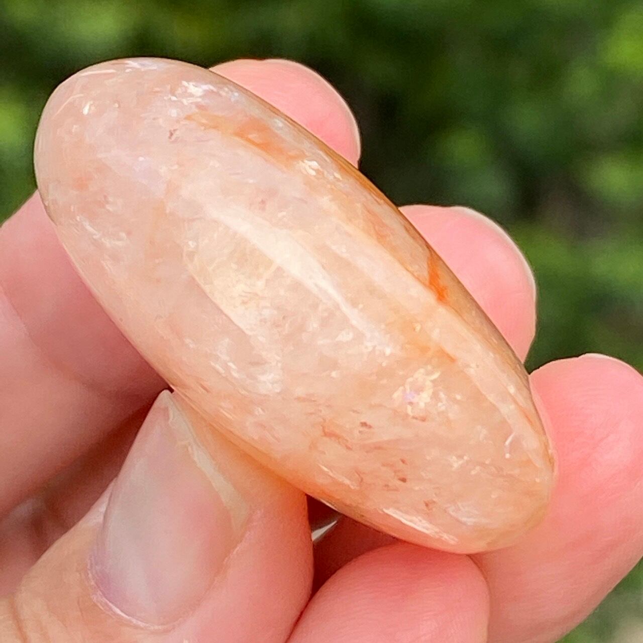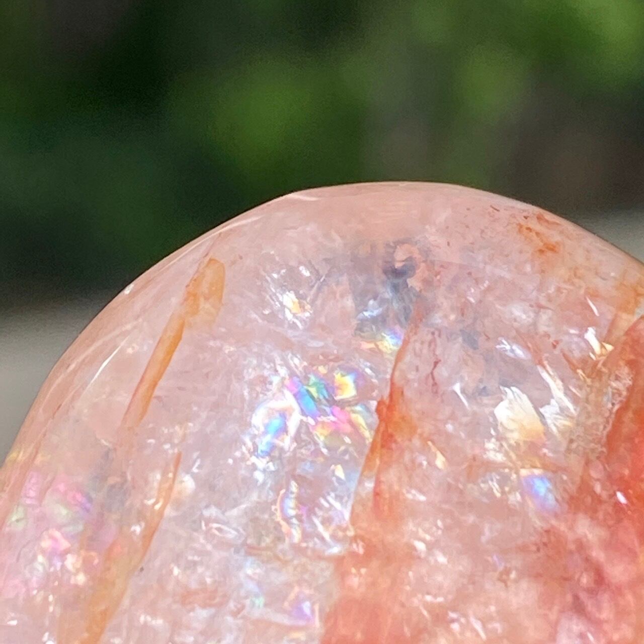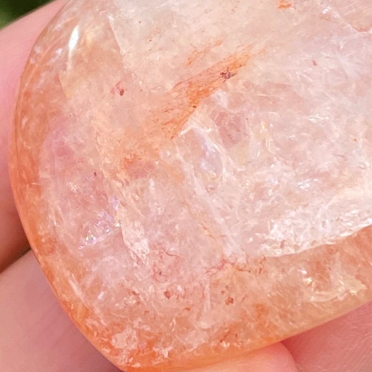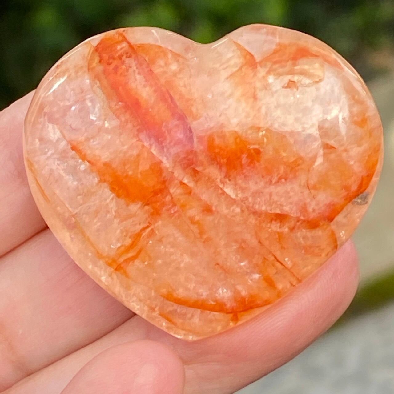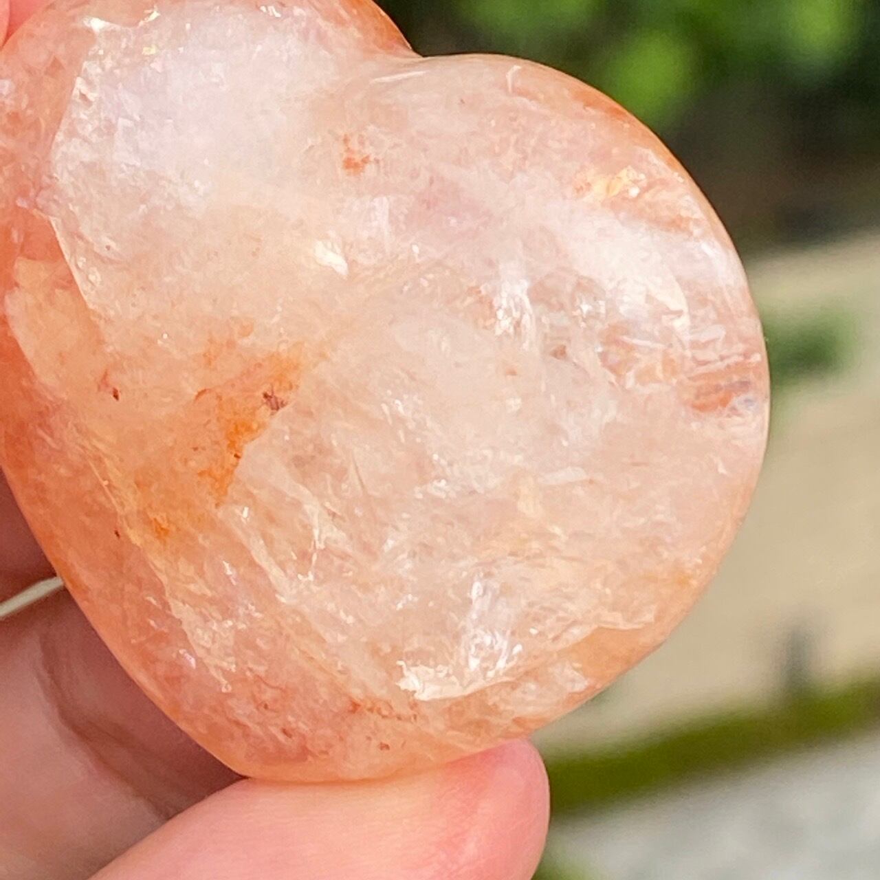 今回のファイアークォーツのハートの中で最も全体的に輝いていてラメ感に富んだ、虹入りの子です。裏側は赤いインクルージョンは少なく、2wayで楽しめます。