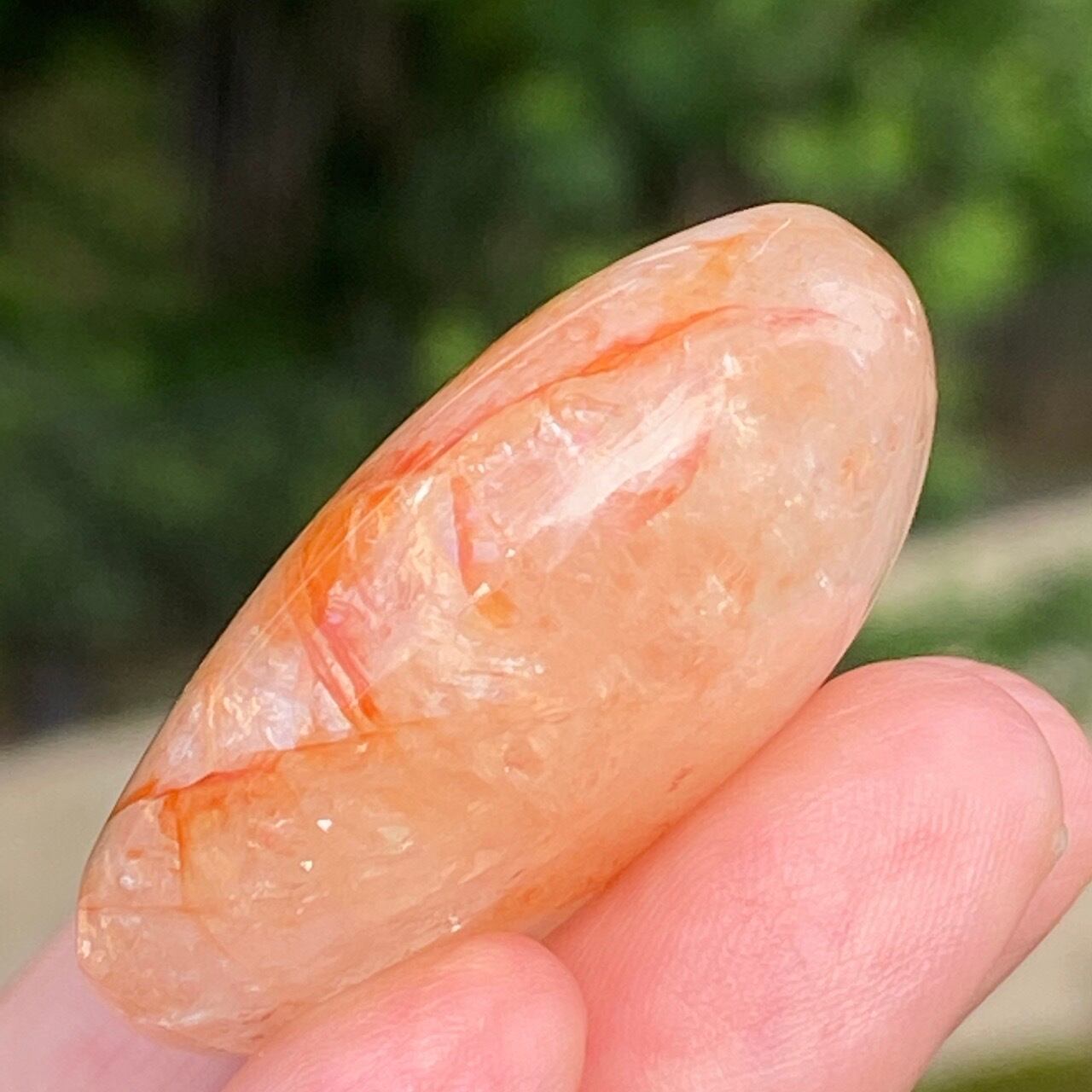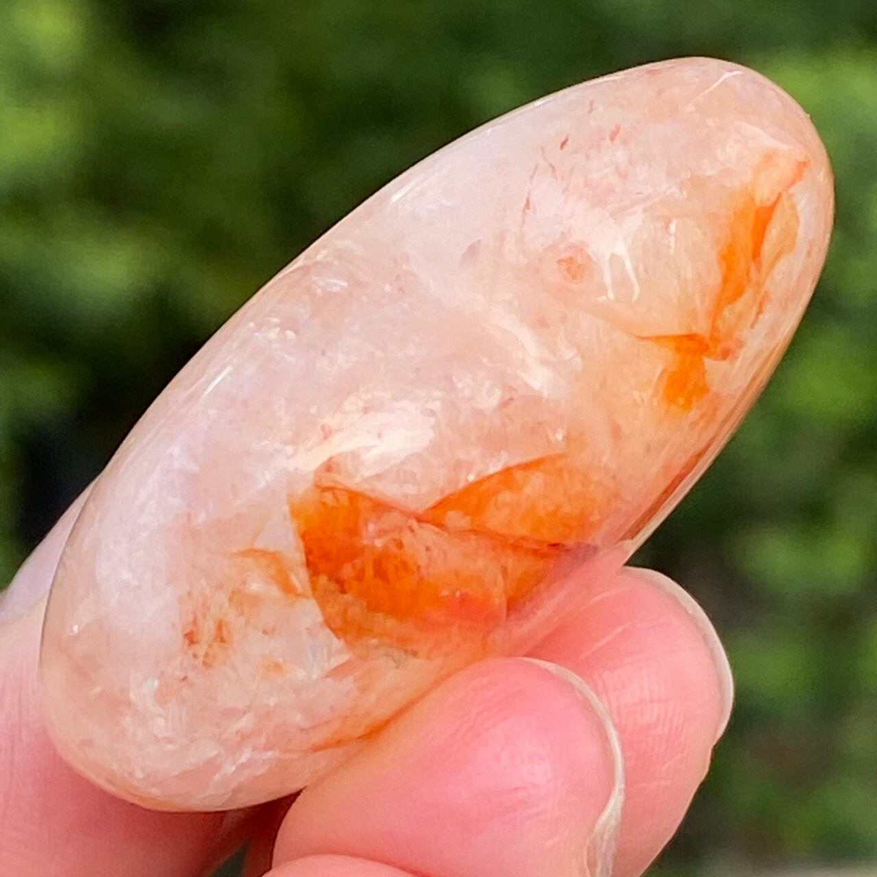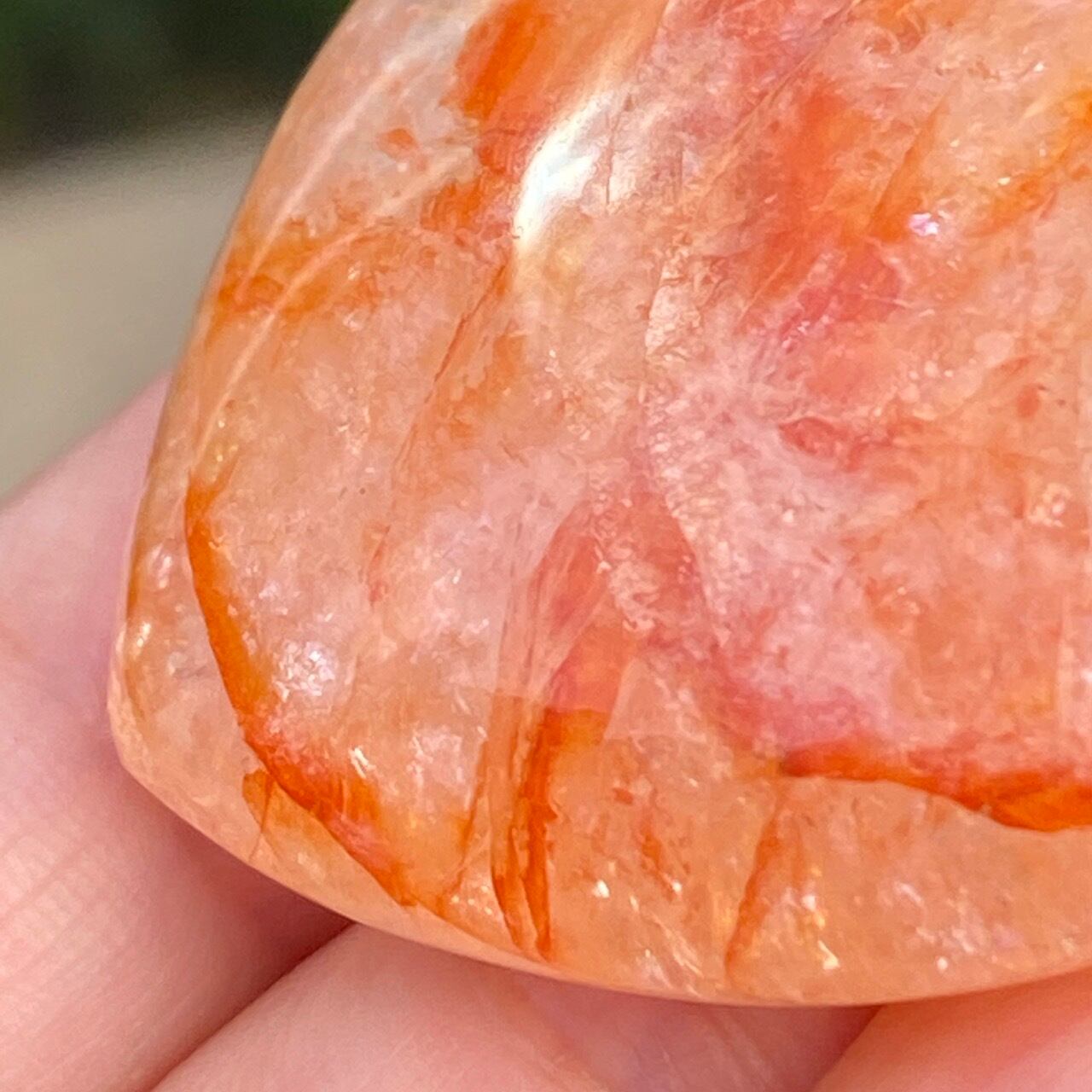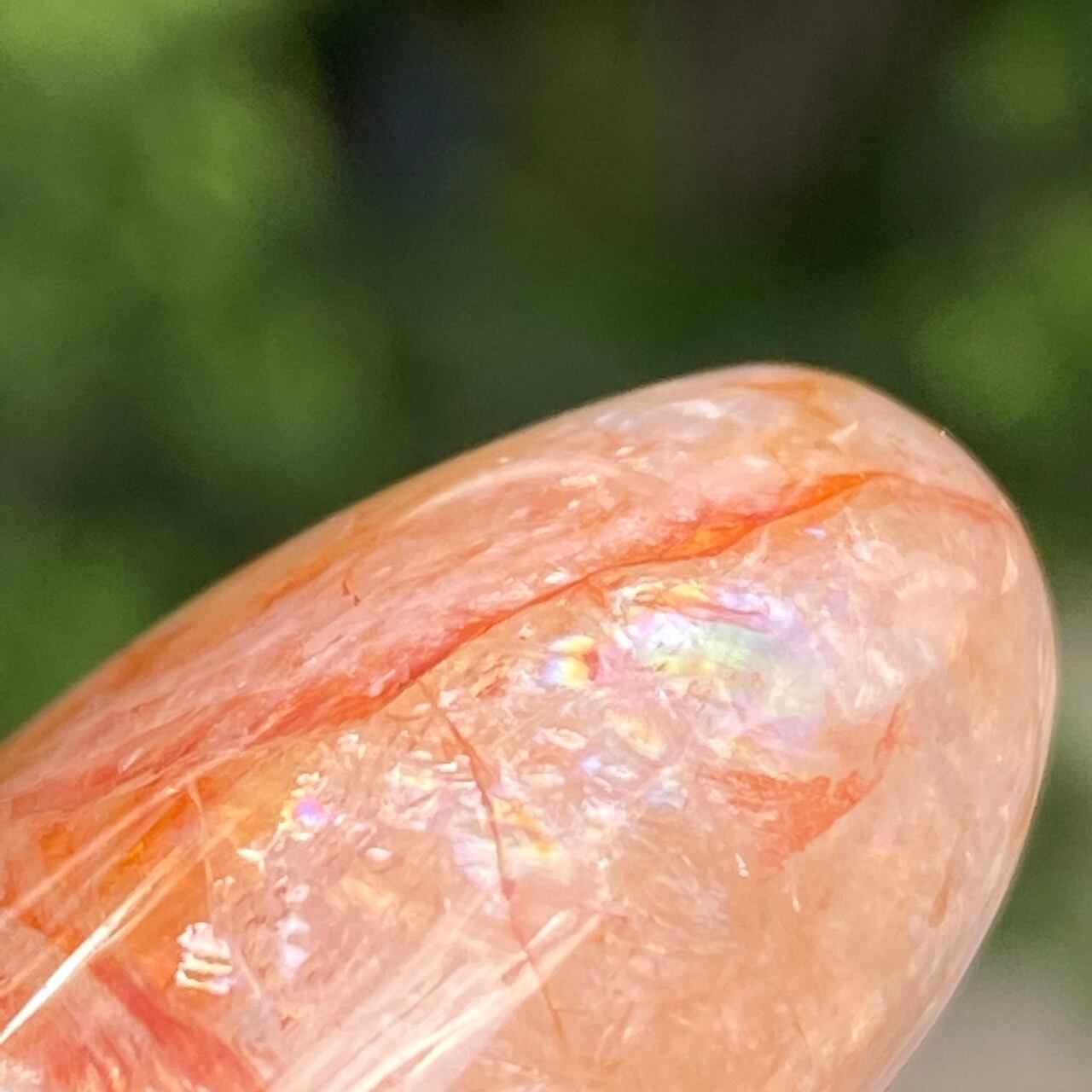 この石の特徴である内部および表面に見られる複雑なクラックとレピドクロサイトのインクルージョンがあいまって、色々な角度から表情やを楽しむ事ができます。