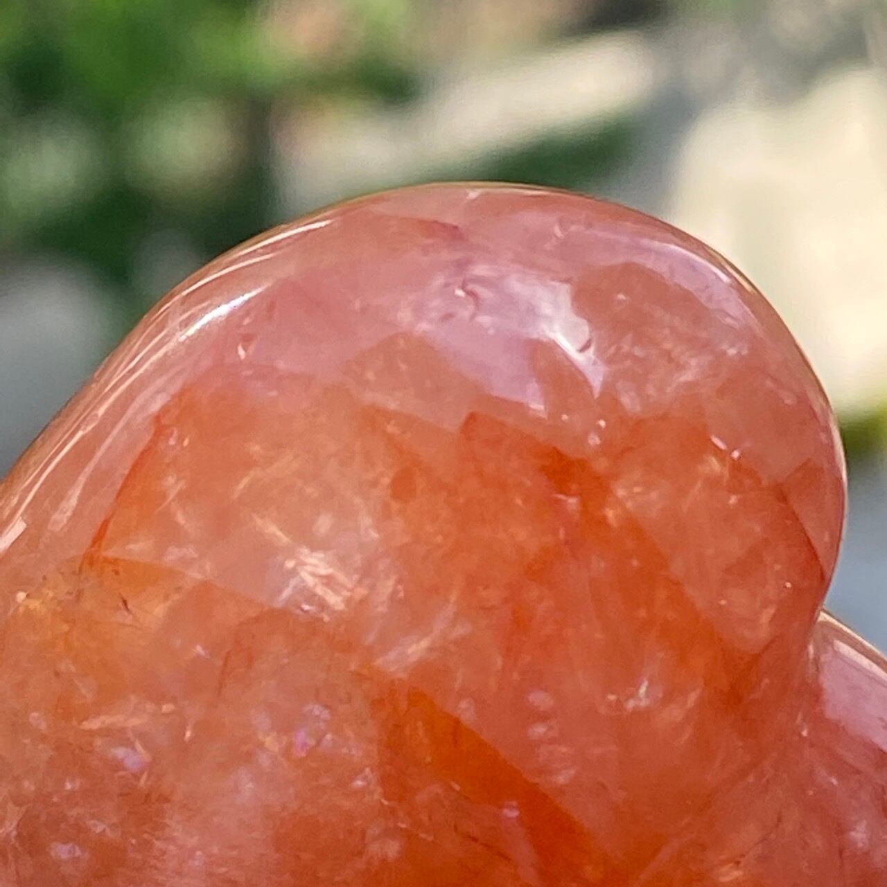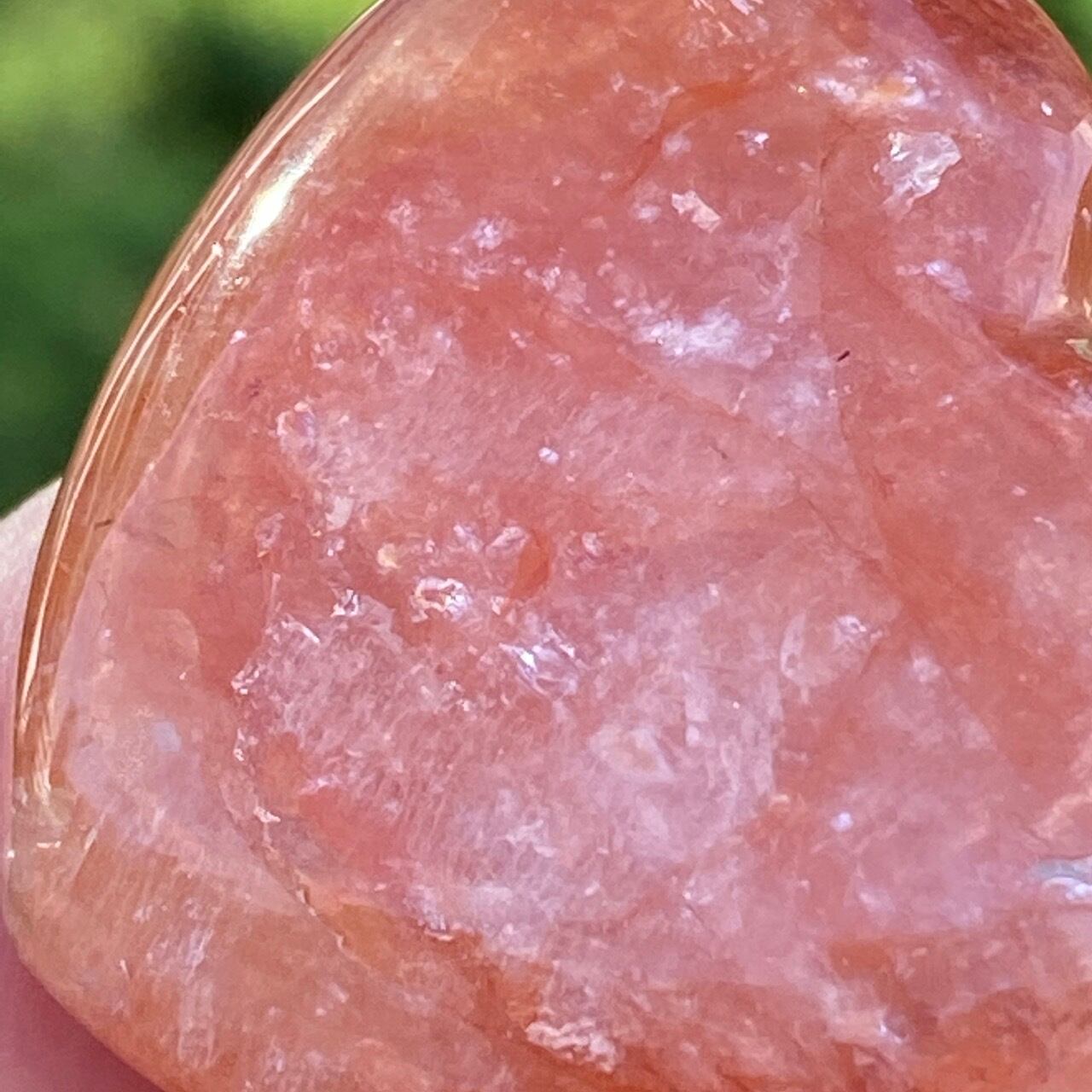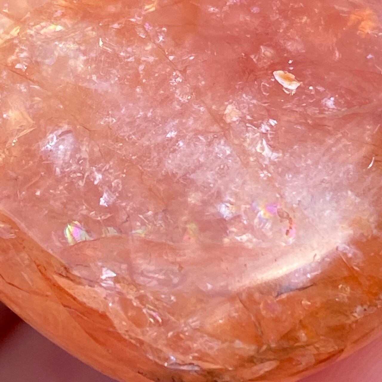 この石の特徴である内部および表面に見られる複雑なクラックとレピドクロサイトのインクルージョンがあいまって、色々な角度から表情や煌めきを楽しむ事ができます。