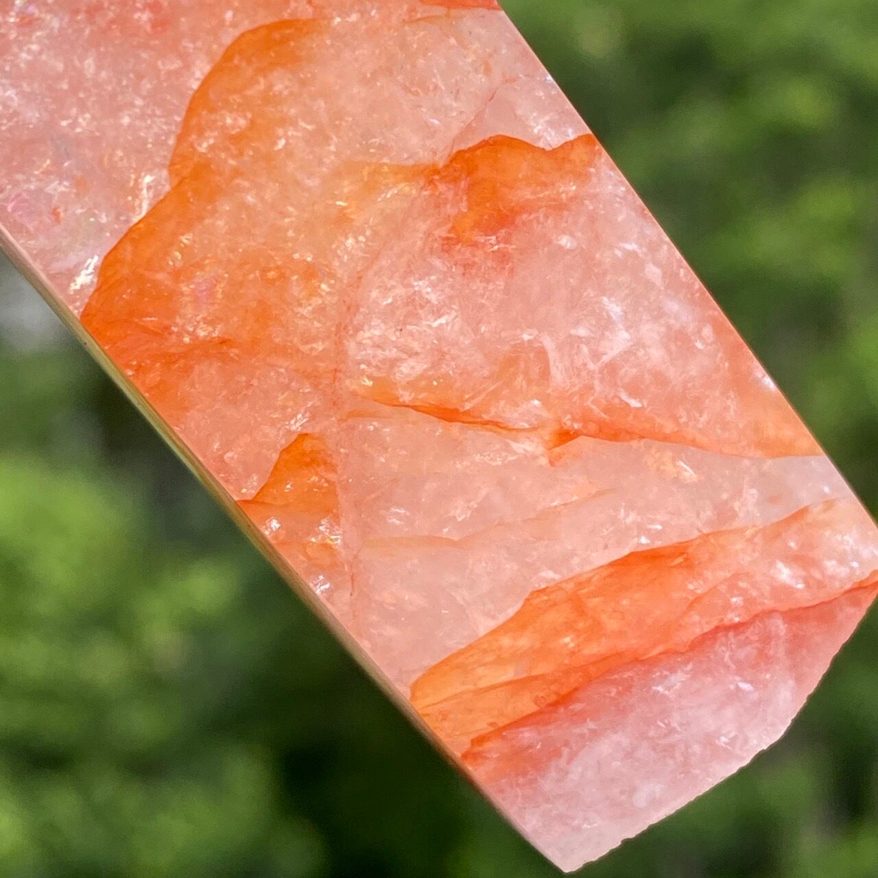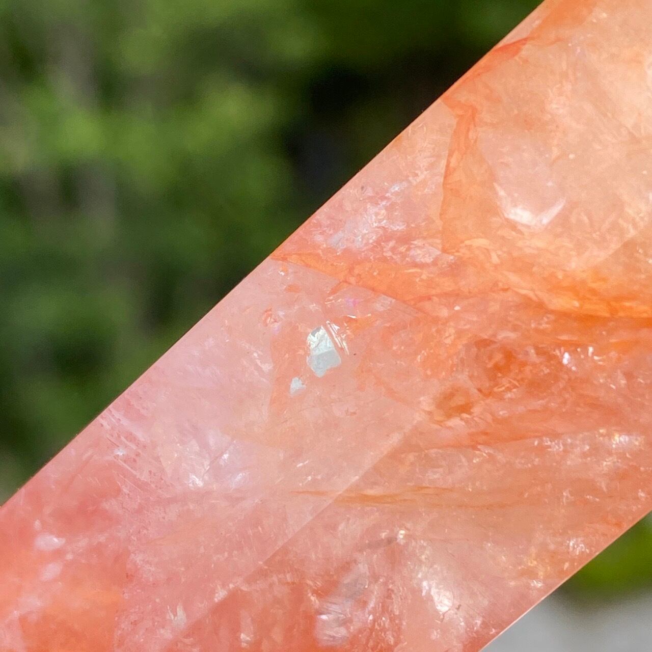 この石の特徴である内部および表面に見られる複雑なクラックとレピドクロサイトのインクルージョンがあいまって、色々な角度から表情や煌めきを楽しむ事ができます。