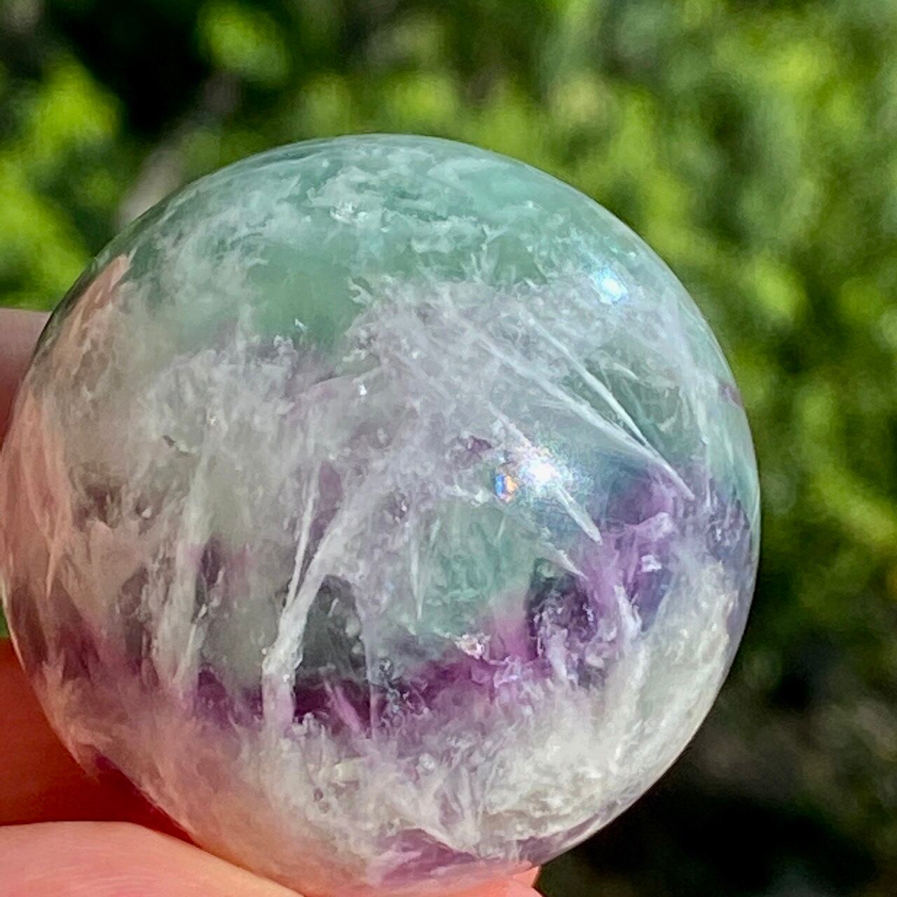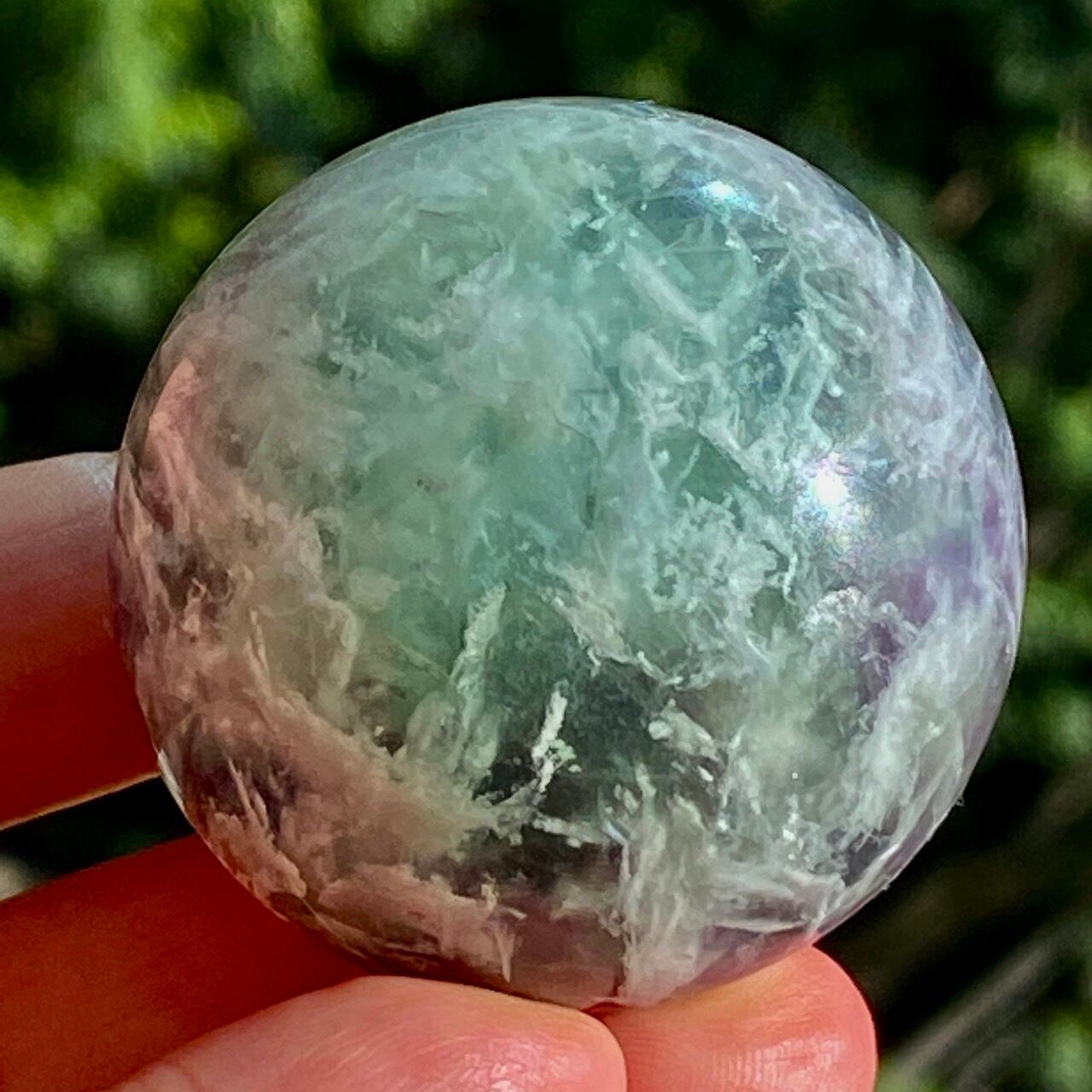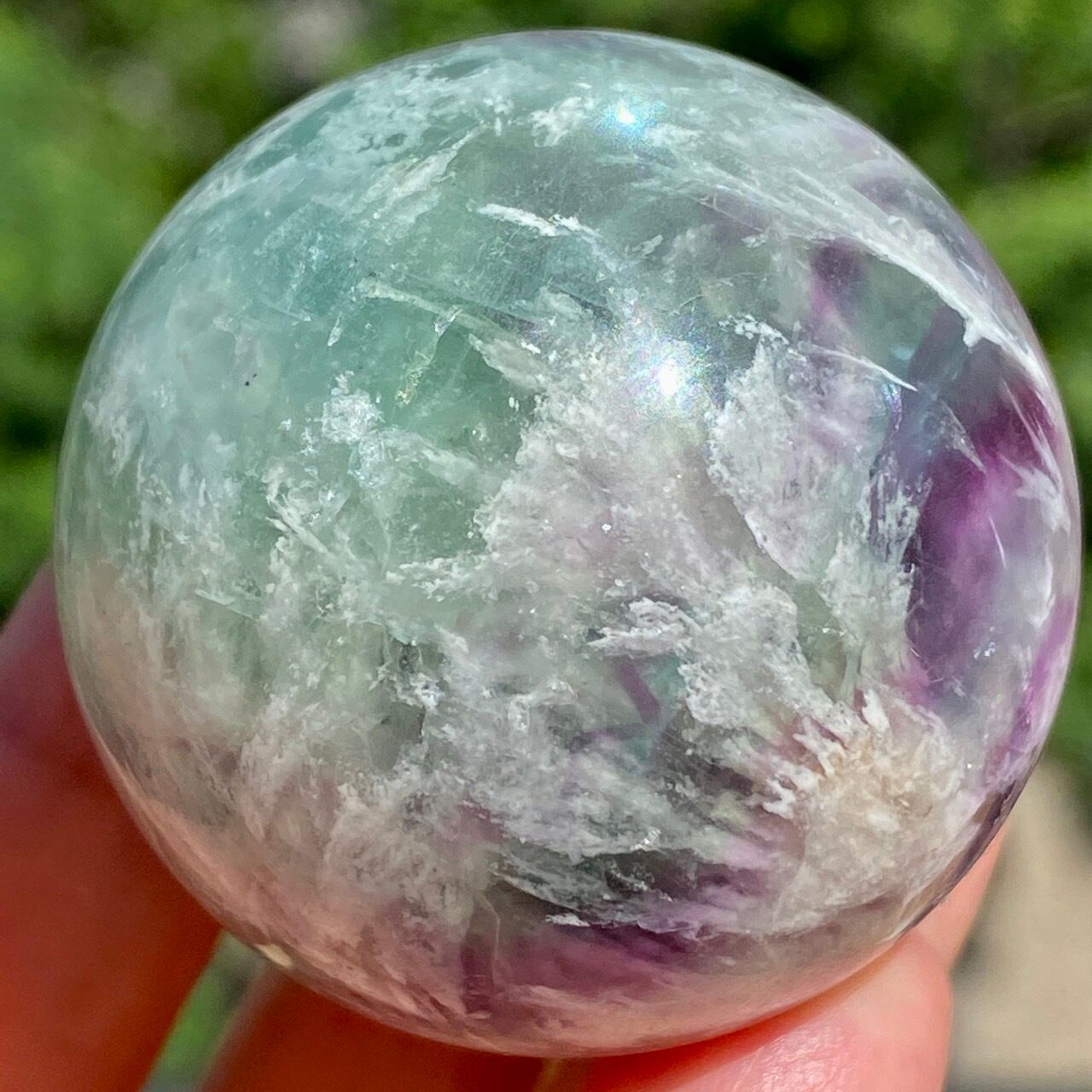 フローライトの特性である内部や表面のクラックが、煌めきや虹を作り出します。この石にも虹が複数箇所ございます。※表面に若干キズがございます。