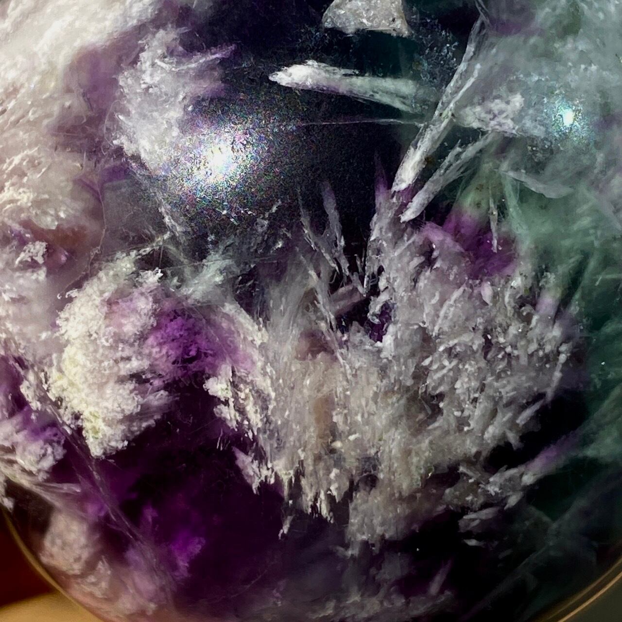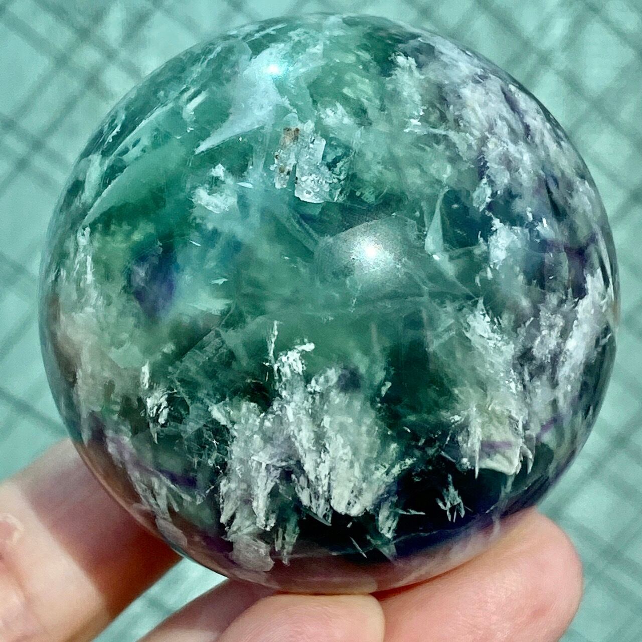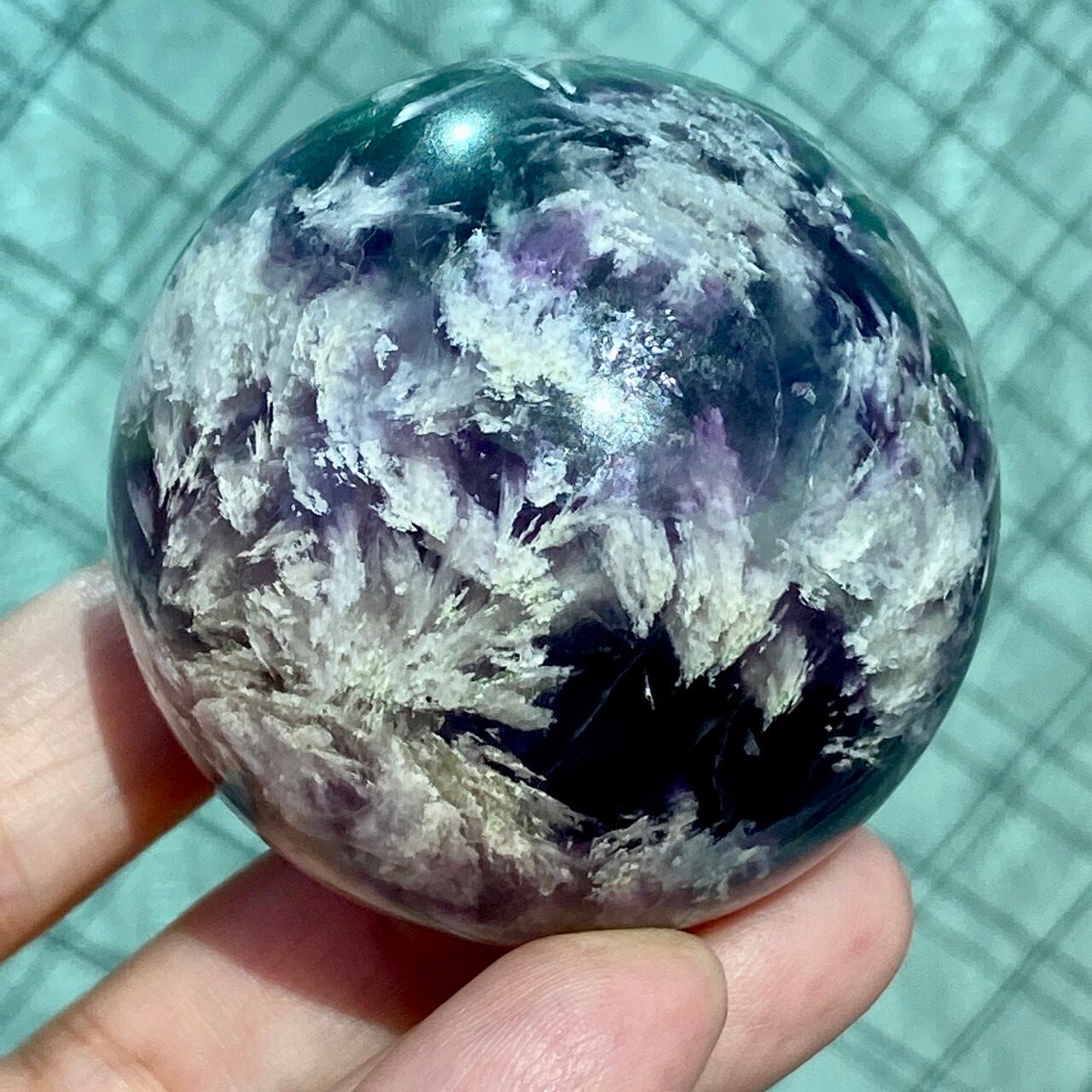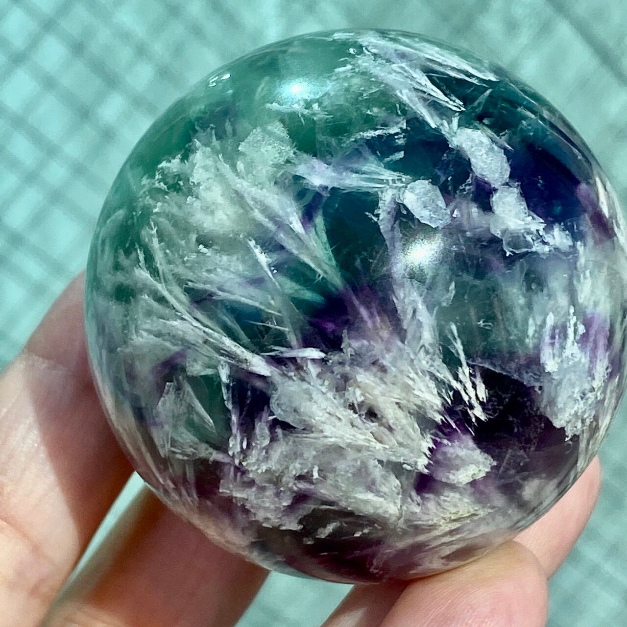 スノーフレーク(エンジェルフェザー)フローライトのスフィア Snowflake Fluorite Sphere SP2074