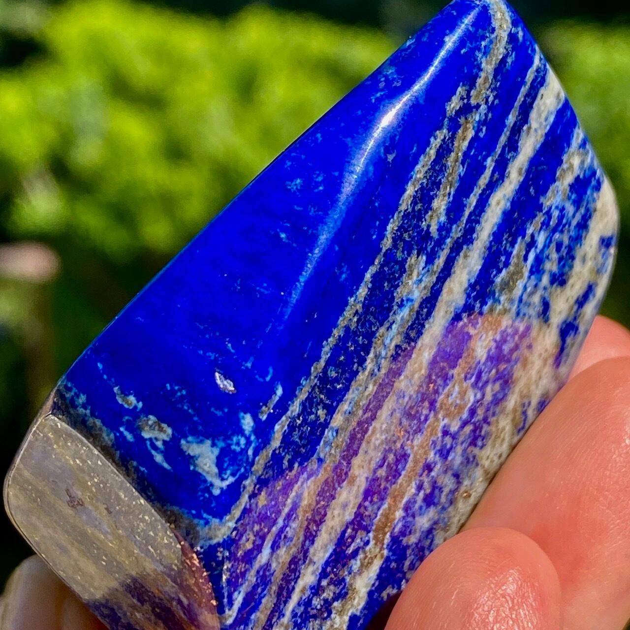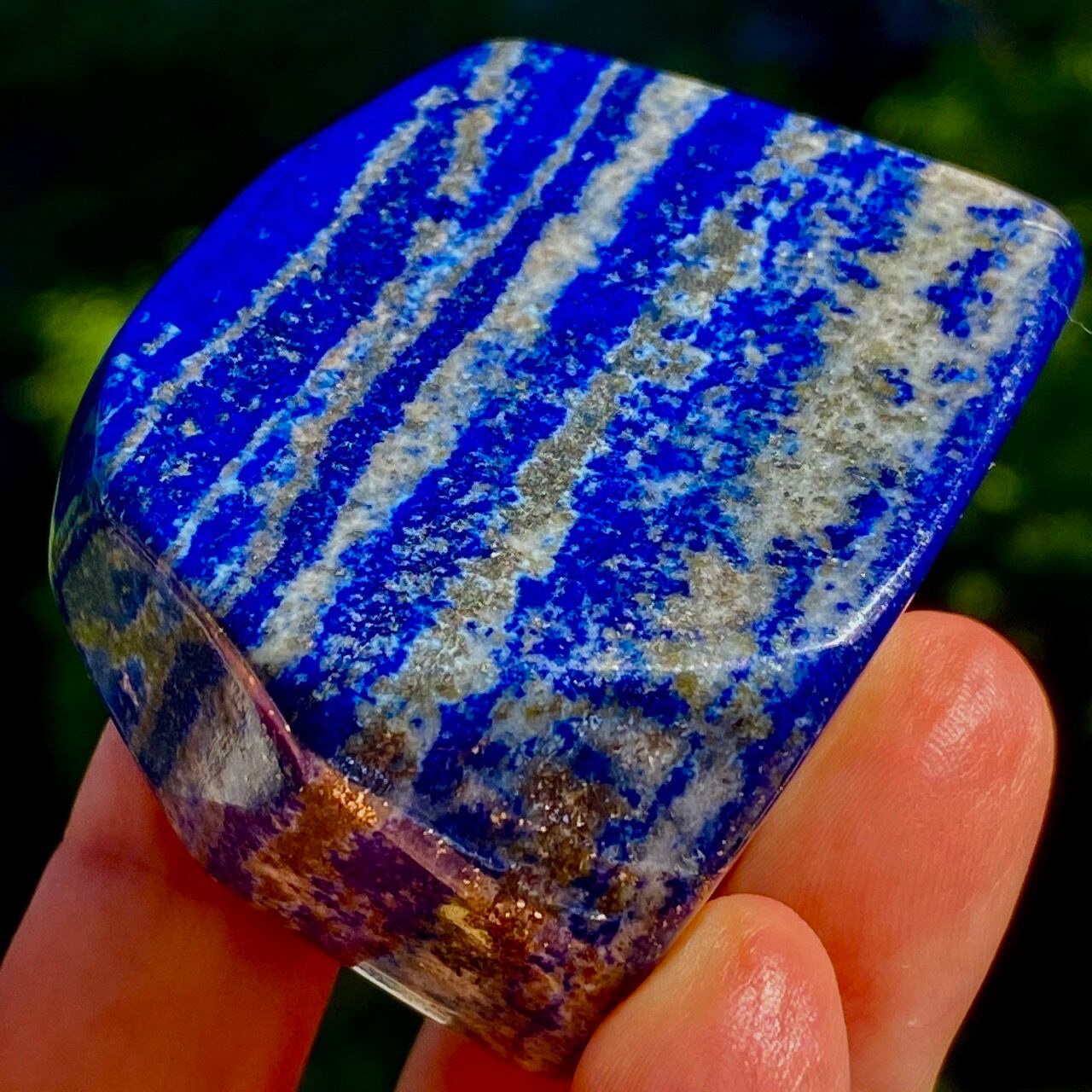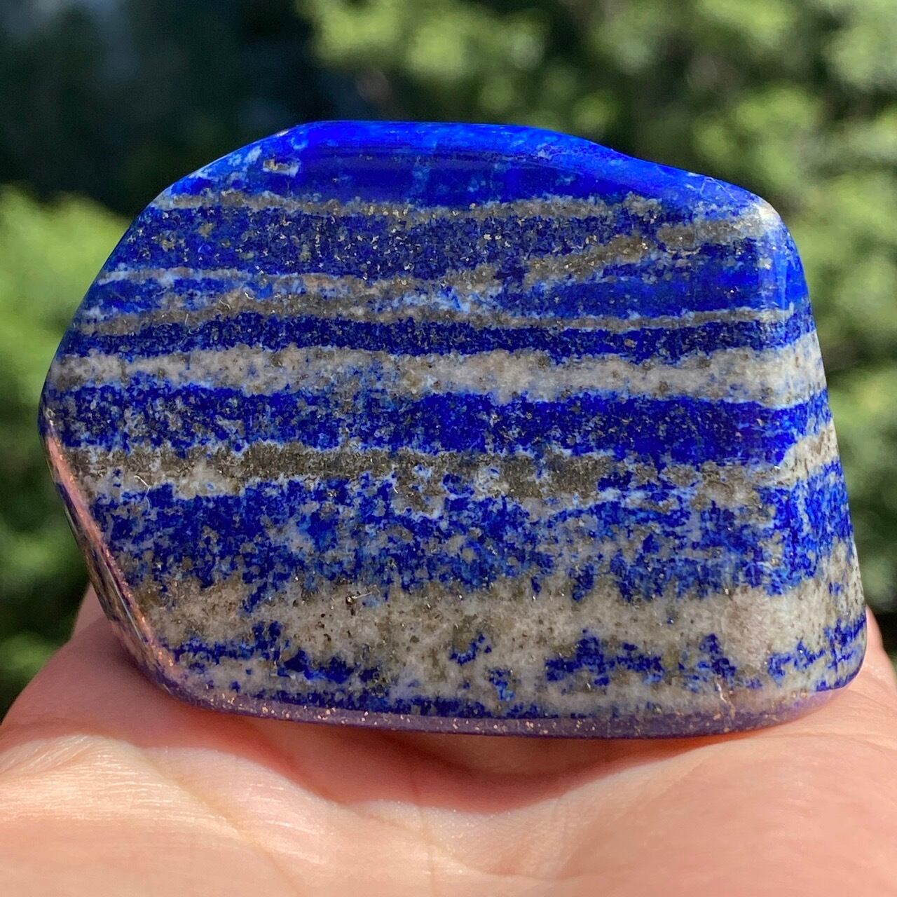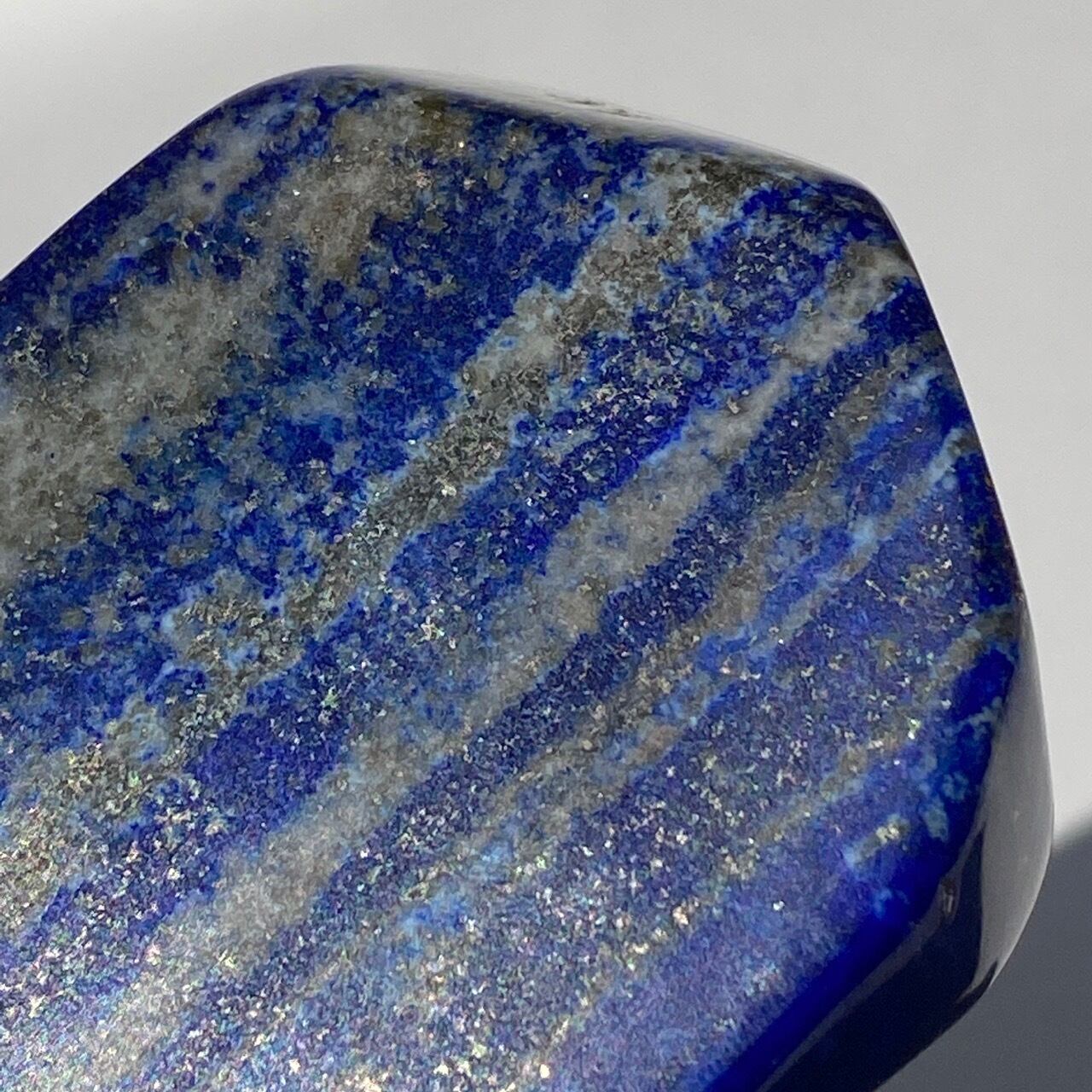 カルサイトとラズライトのストライプ層に金色のパイライトがちりばめられた、非常に魅力的な子です。太陽光では、パイライトが粒子のように強調されて浮き出て見えますが、表面は研磨されているため、全体的につるっとした質感になります。瑠璃色部分もとても鮮やかで店主おススメです。