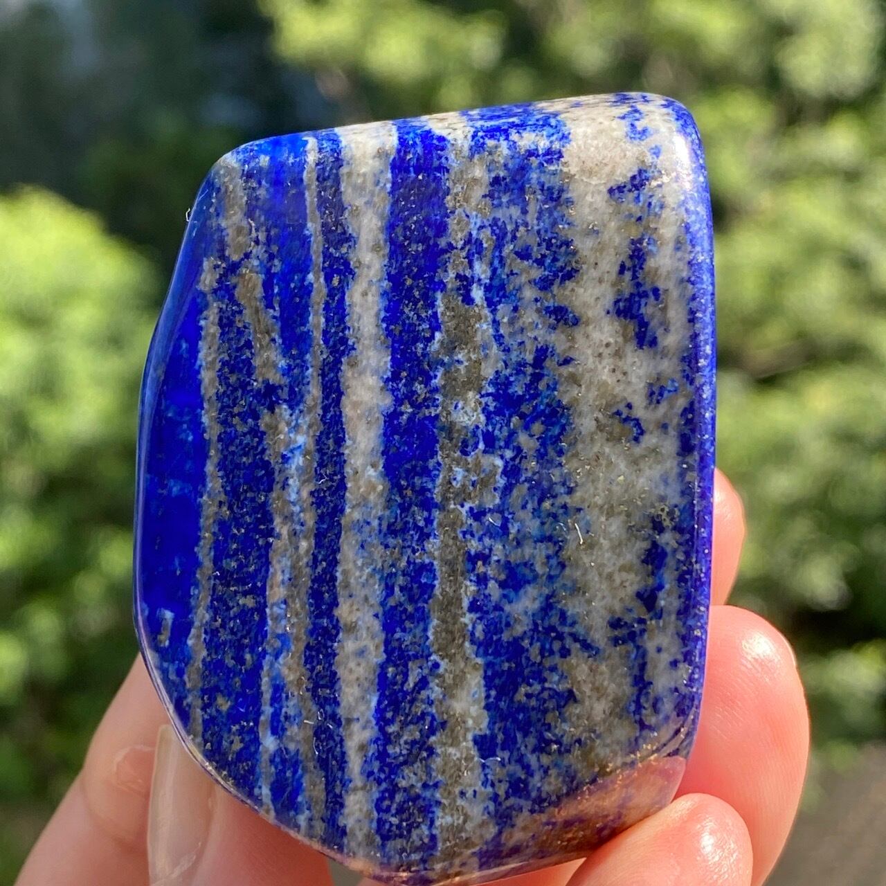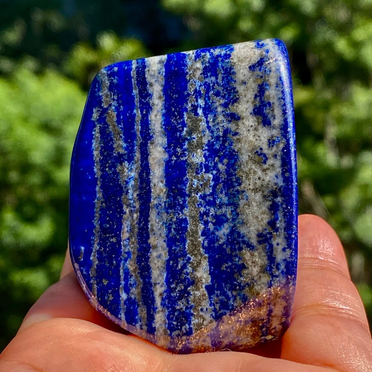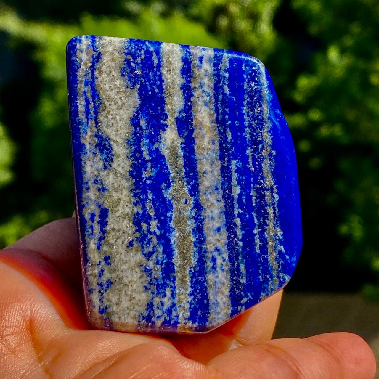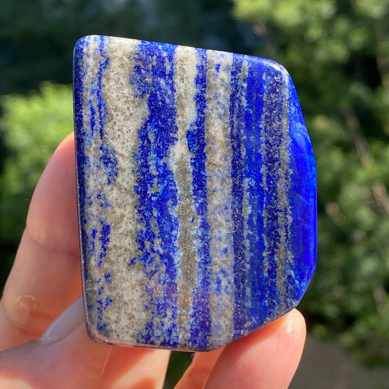 カルサイトとラズライトのストライプ層に金色のパイライトがちりばめられた、非常に魅力的な子です。太陽光では、パイライトが粒子のように強調されて浮き出て見えますが、表面は研磨されているため、全体的につるっとした質感になります。瑠璃色部分もとても鮮やかで店主おススメです。