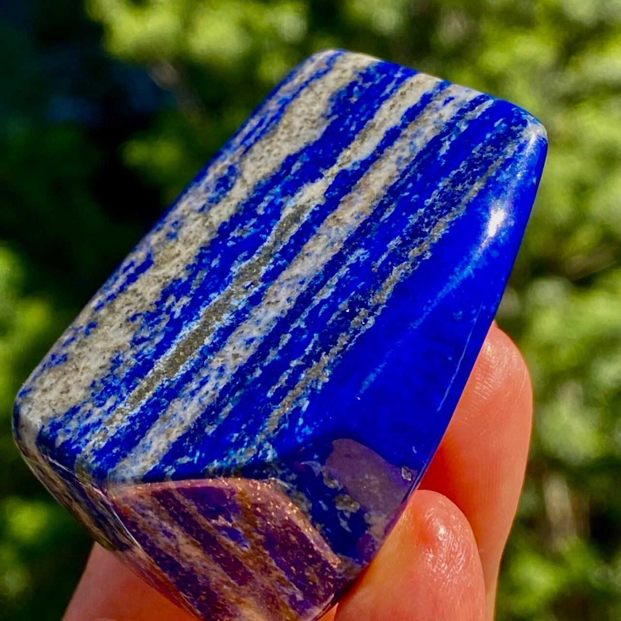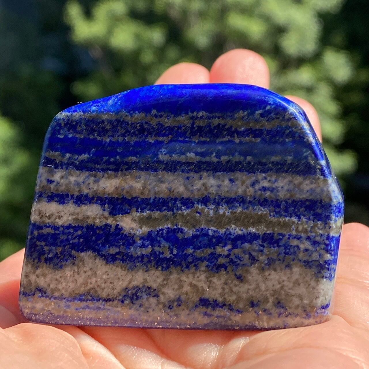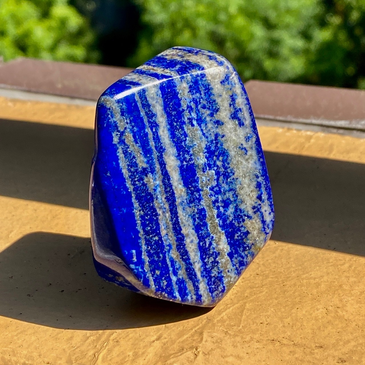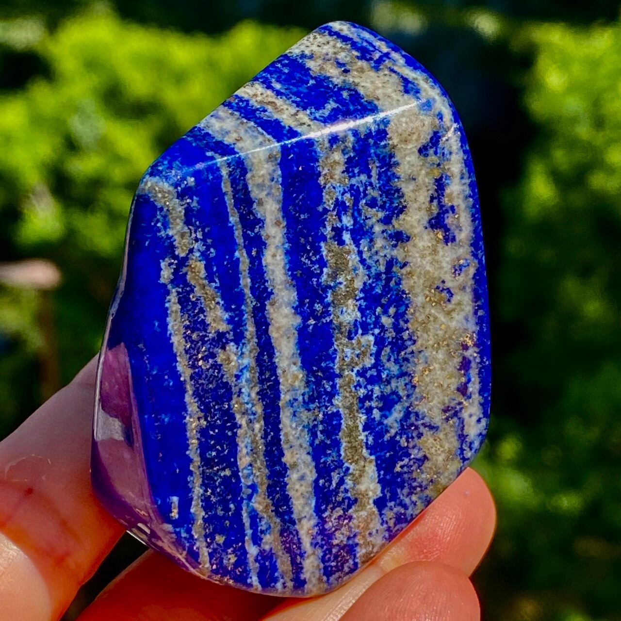 カルサイトとラズライトのストライプ層に金色のパイライトがちりばめられた、非常に魅力的な子です。太陽光では、パイライトが粒子のように強調されて浮き出て見えますが、表面は研磨されているため、全体的につるっとした質感になります。瑠璃色部分もとても鮮やかで店主おススメです。