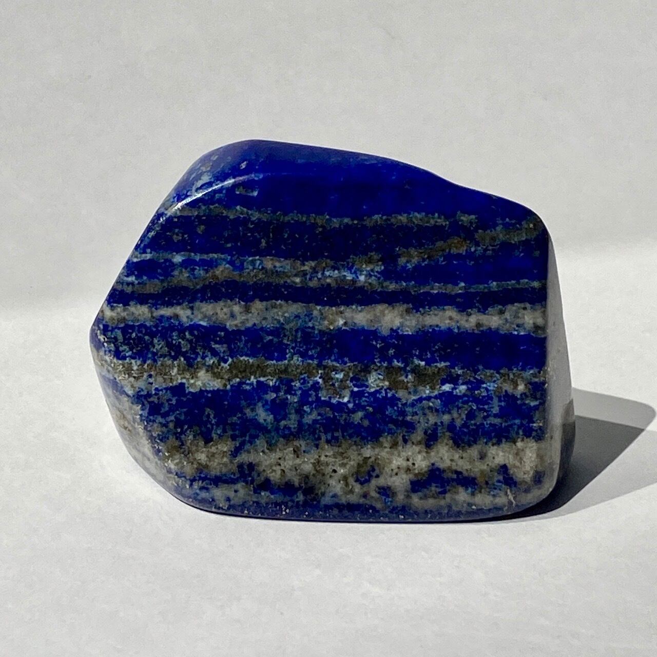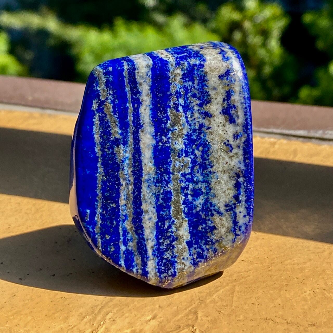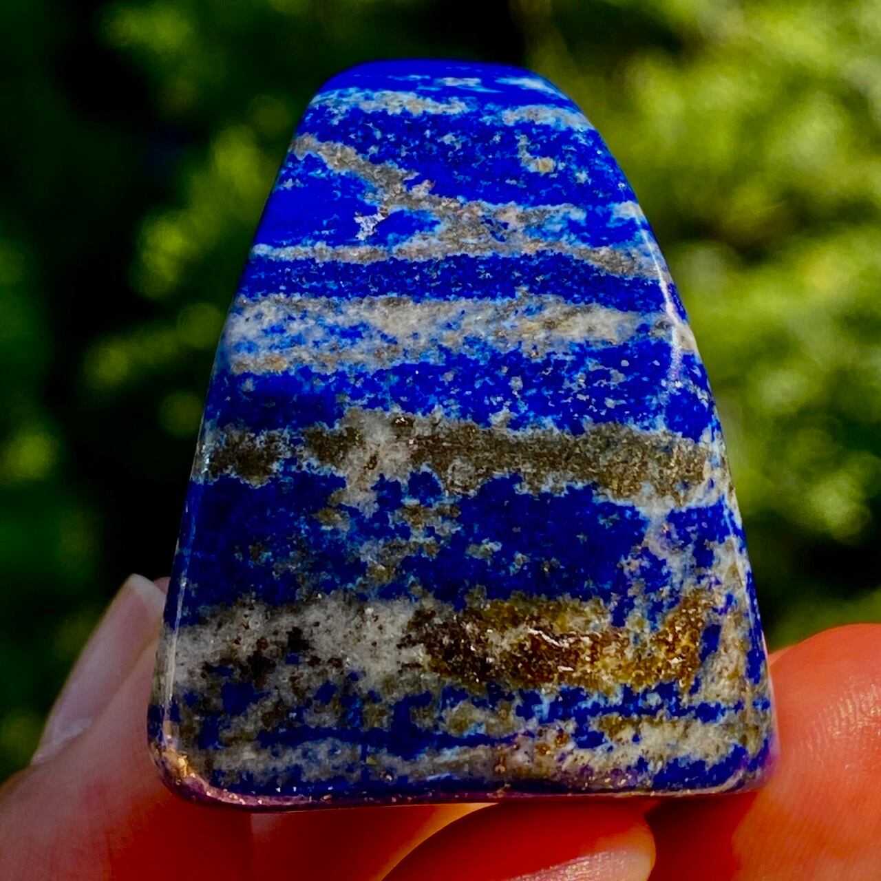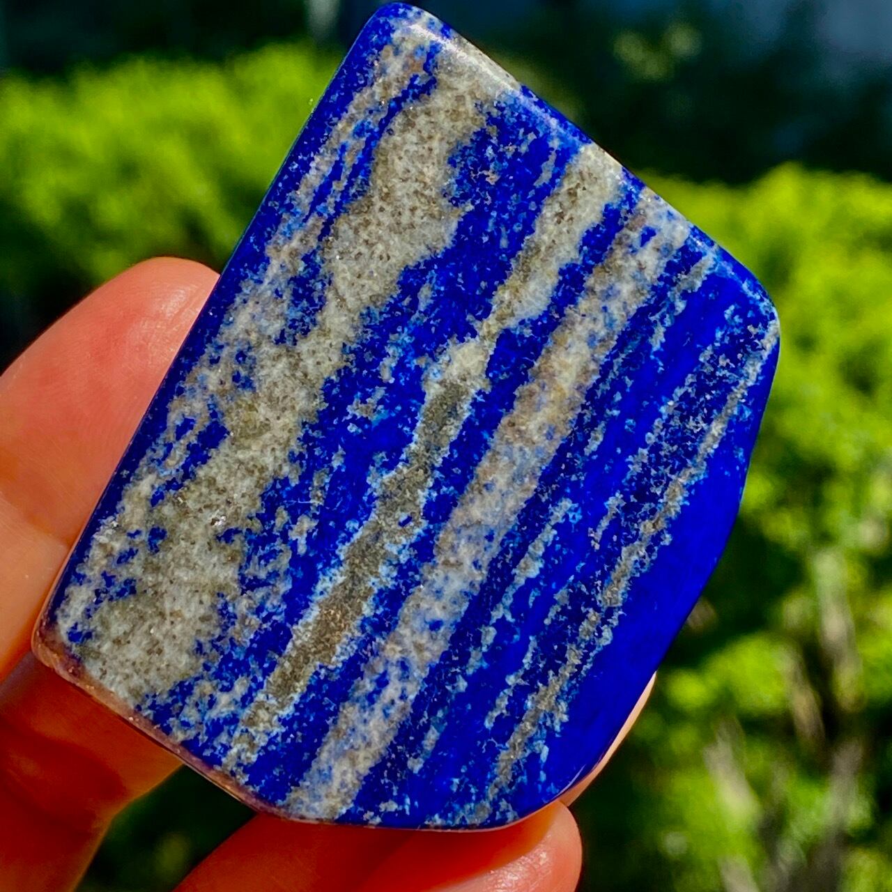 カルサイトとラズライトのストライプ層に金色のパイライトがちりばめられた、非常に魅力的な子です。太陽光では、パイライトが粒子のように強調されて浮き出て見えますが、表面は研磨されているため、全体的につるっとした質感になります。瑠璃色部分もとても鮮やかで店主おススメです。