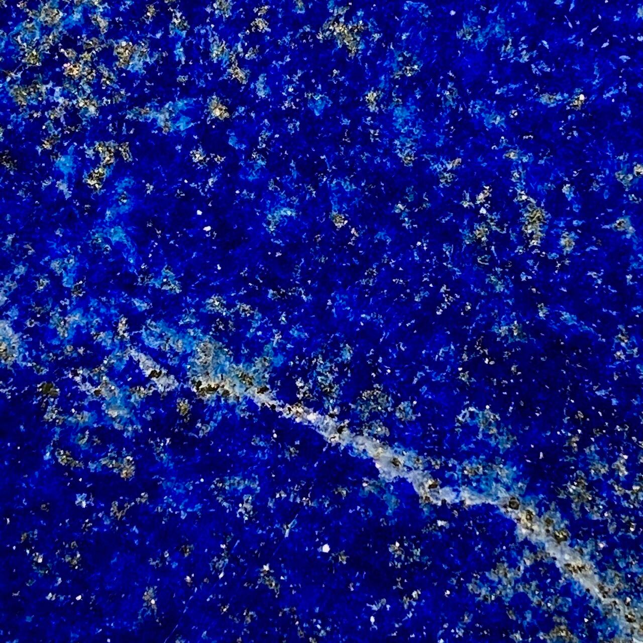 表面がまるでビンテージ加工のような擦れや衝突痕、そして凹凸や線状のキズのように見えるものは(一部の天然のわずかな溝を除き)異なる素材から成る模様で、表面はつるっとしています。片面は瑠璃色に散りばめられたパイライトに加えカルサイトのラインが、裏面にはパティーナの様な古艶模様になっていて、様相が異なり興味深いです。