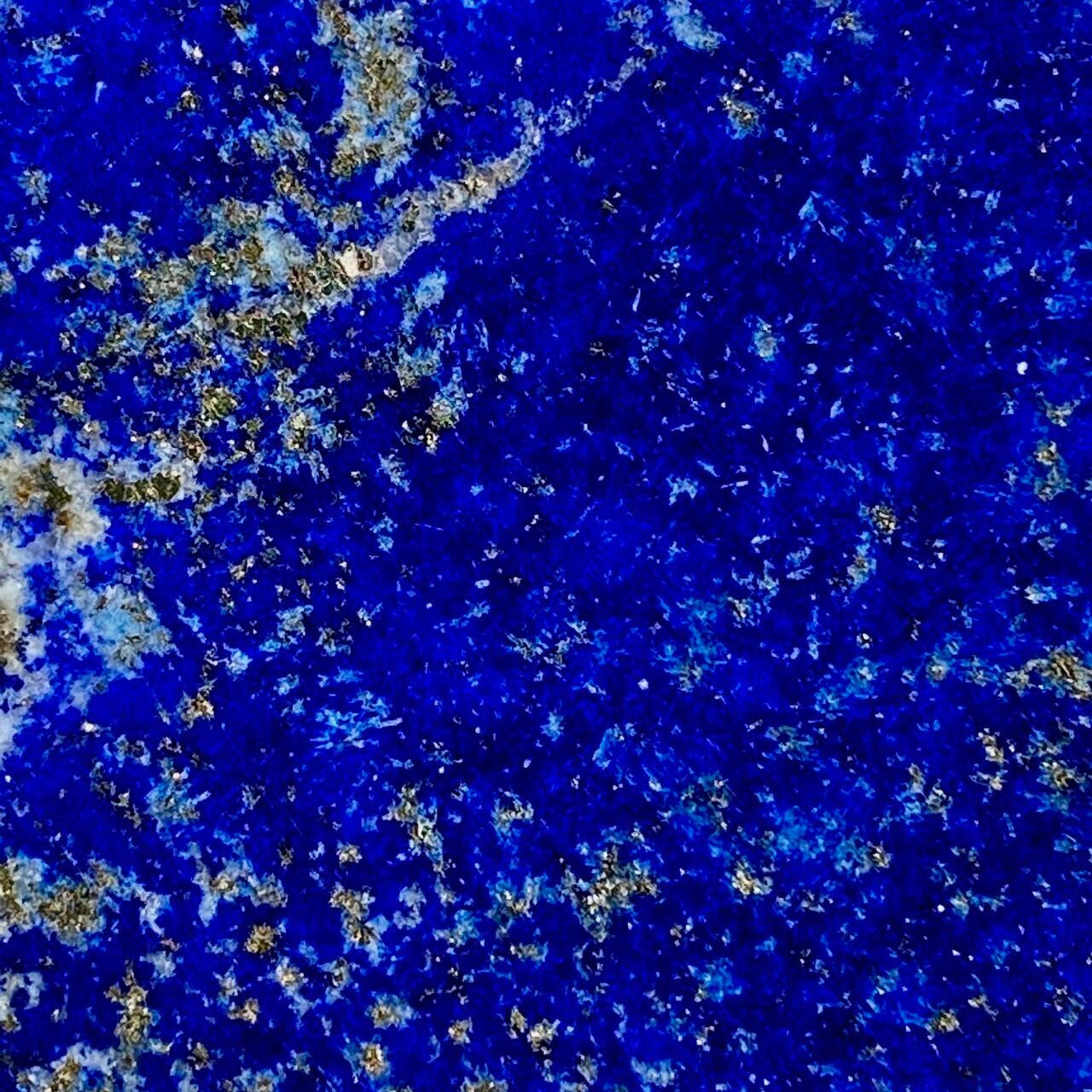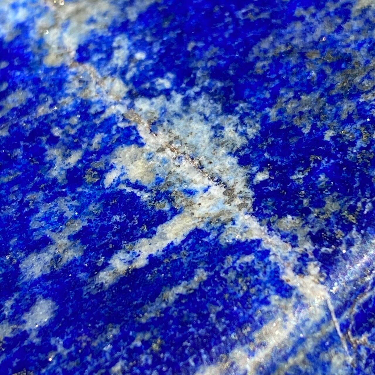紺青色のラズライト(Lzaurite)に金色の斑点のパイライト、そして白い母石のカルサイトが共生するラピスラズリ。