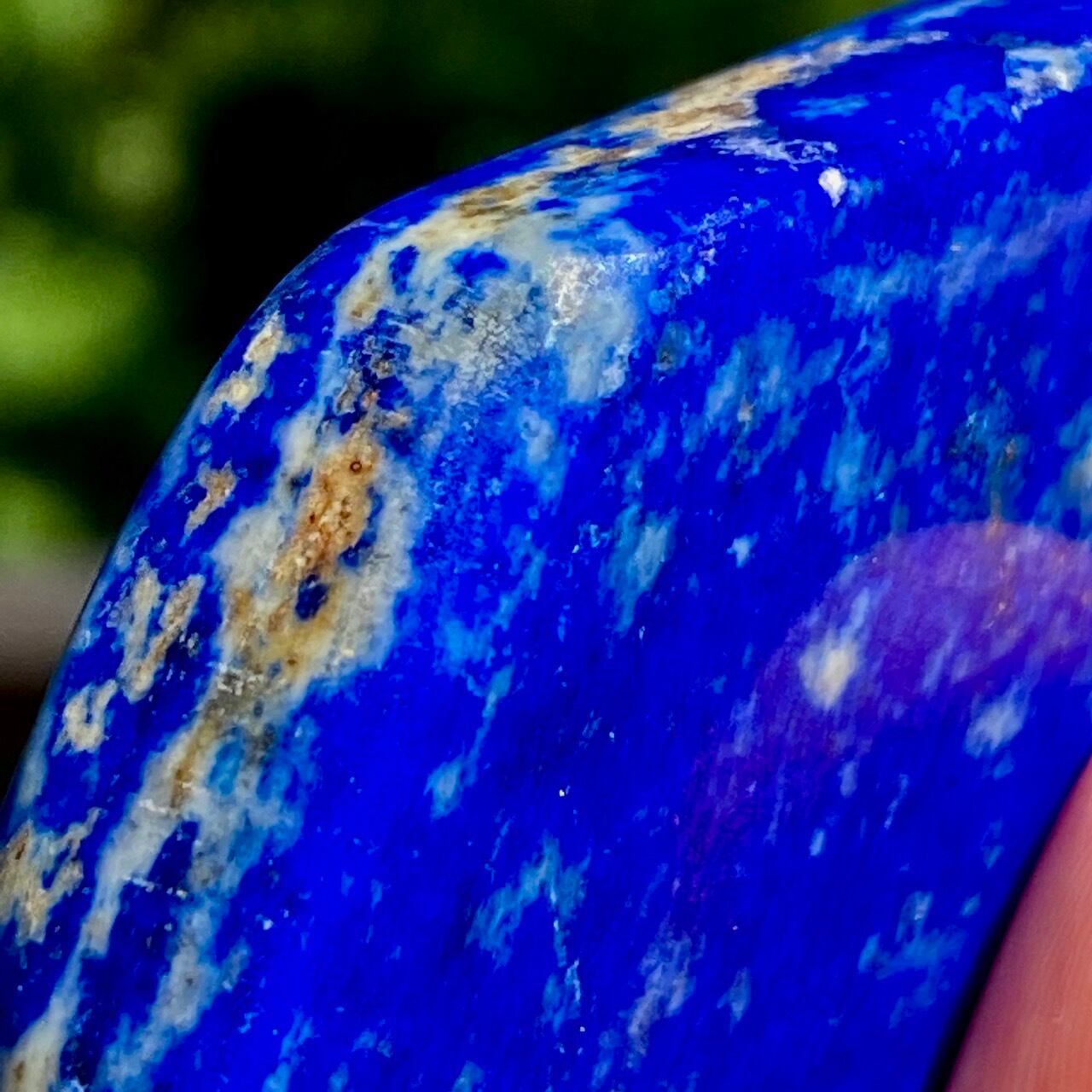 紺青色のラズライト(Lzaurite)に金色の斑点のパイライト、そして白い母石のカルサイトが共生するラピスラズリ。
