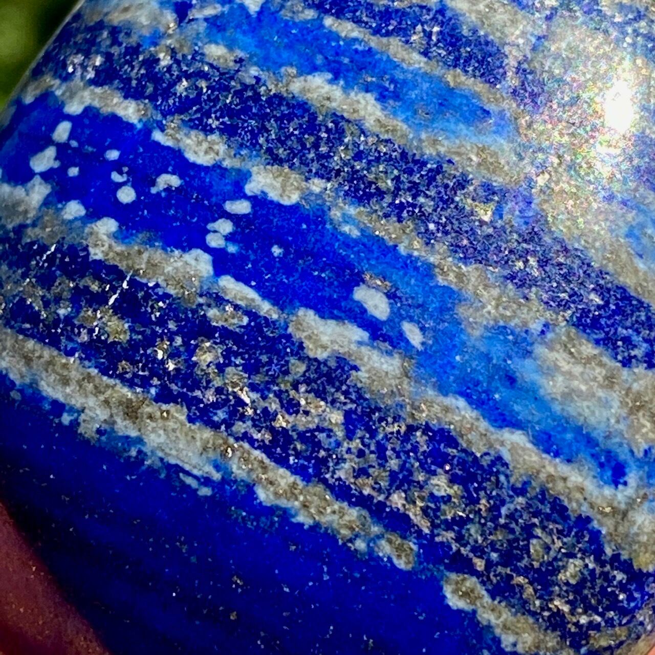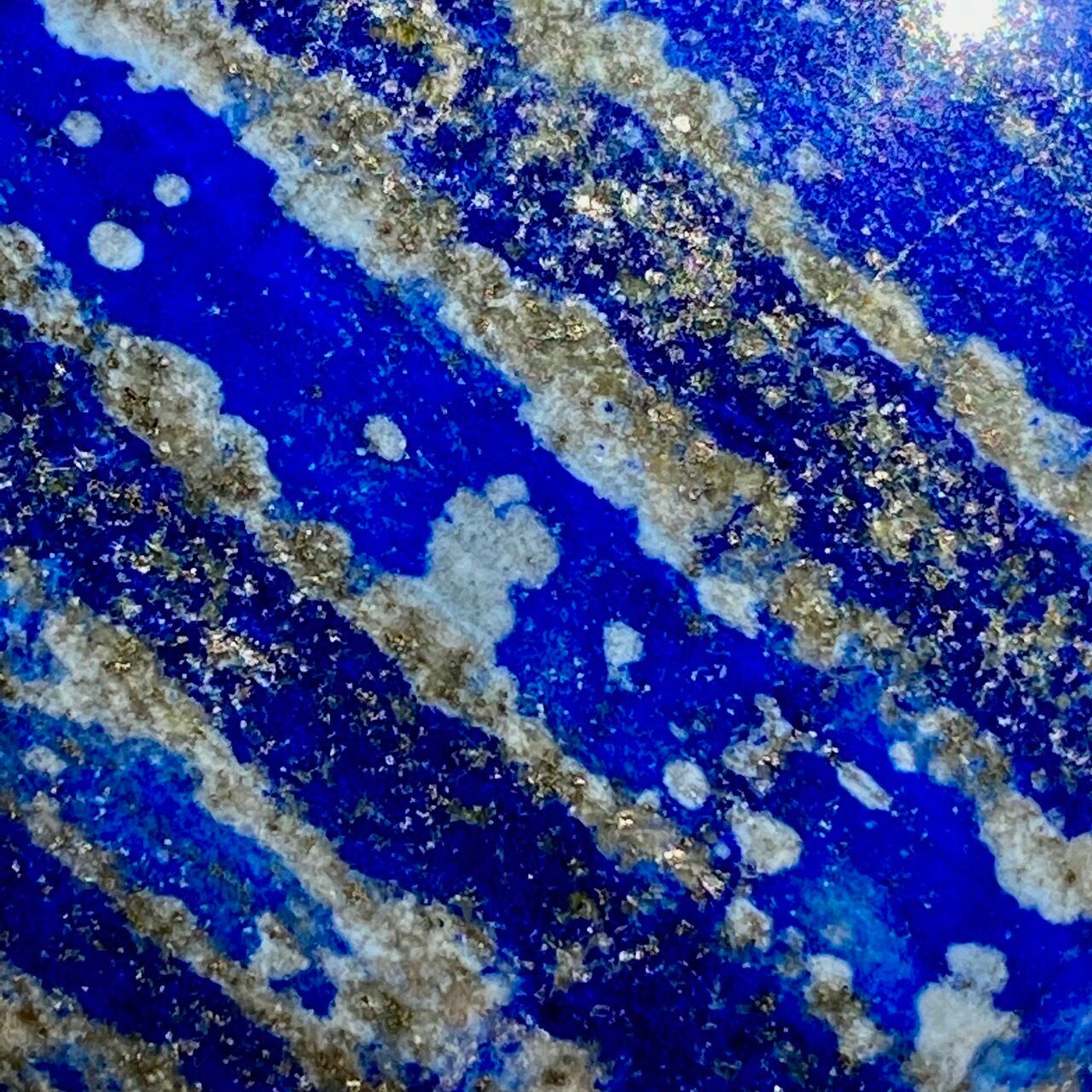 紺青色のラズライト(Lzaurite)に金色の斑点のパイライト、そして白っぽい母石のカルサイトが共生するラピスラズリ。