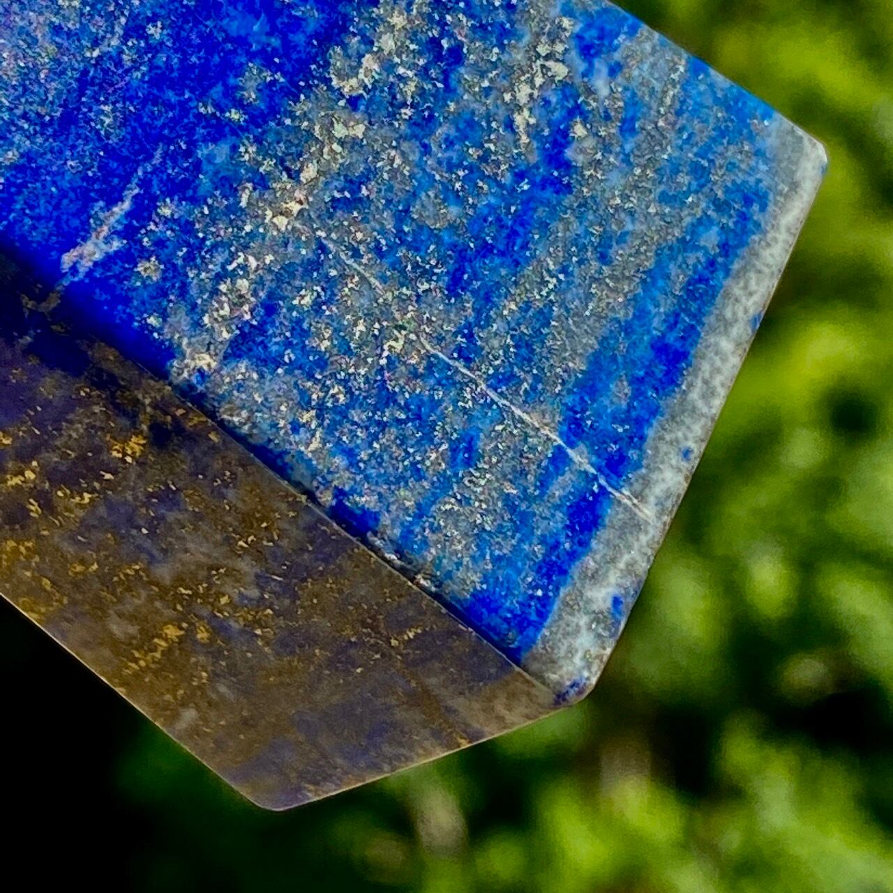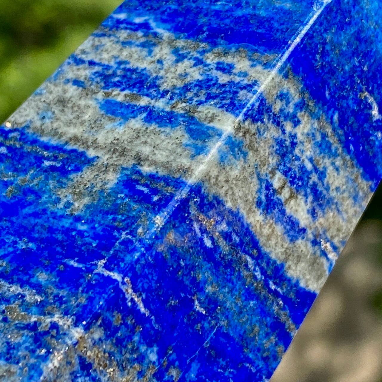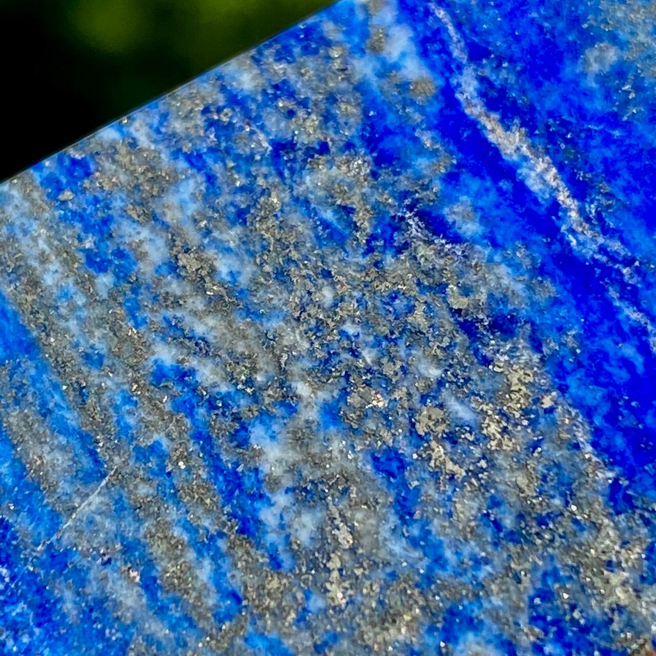 紺青色のラズライト(Lzaurite)に金色の斑点のパイライト、そして白っぽい母石のカルサイトが共生するラピスラズリ。