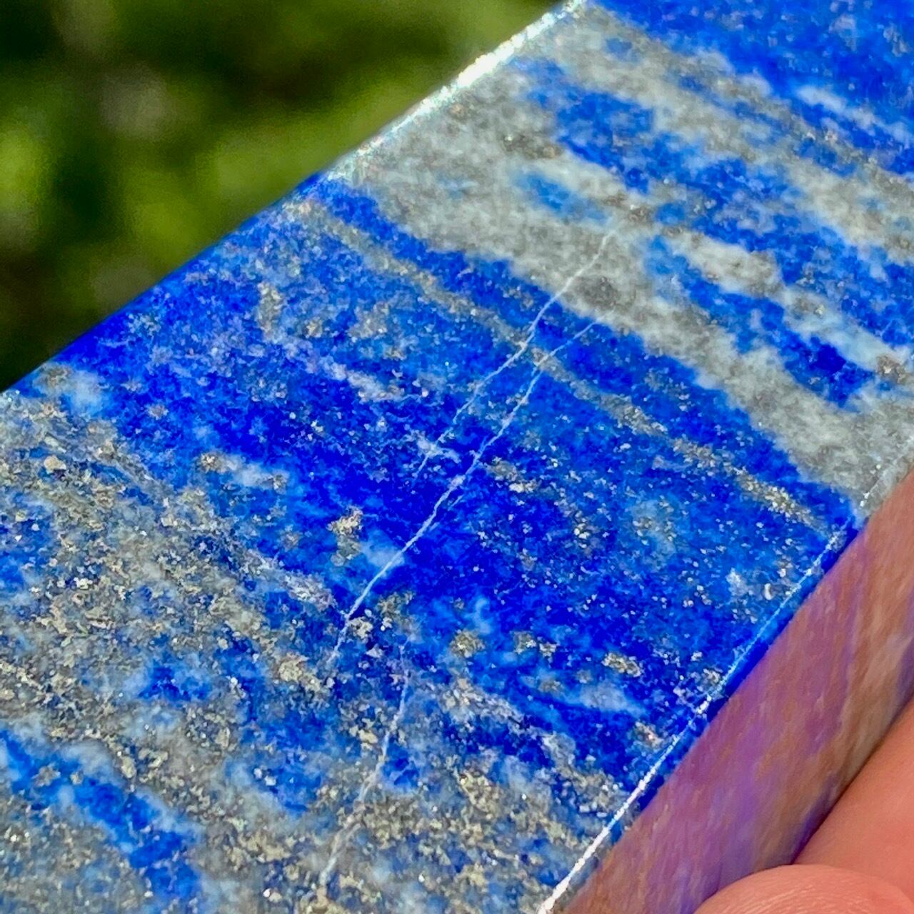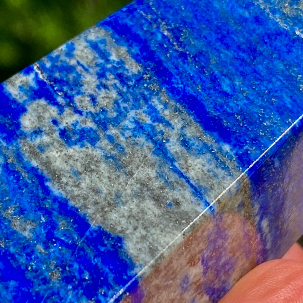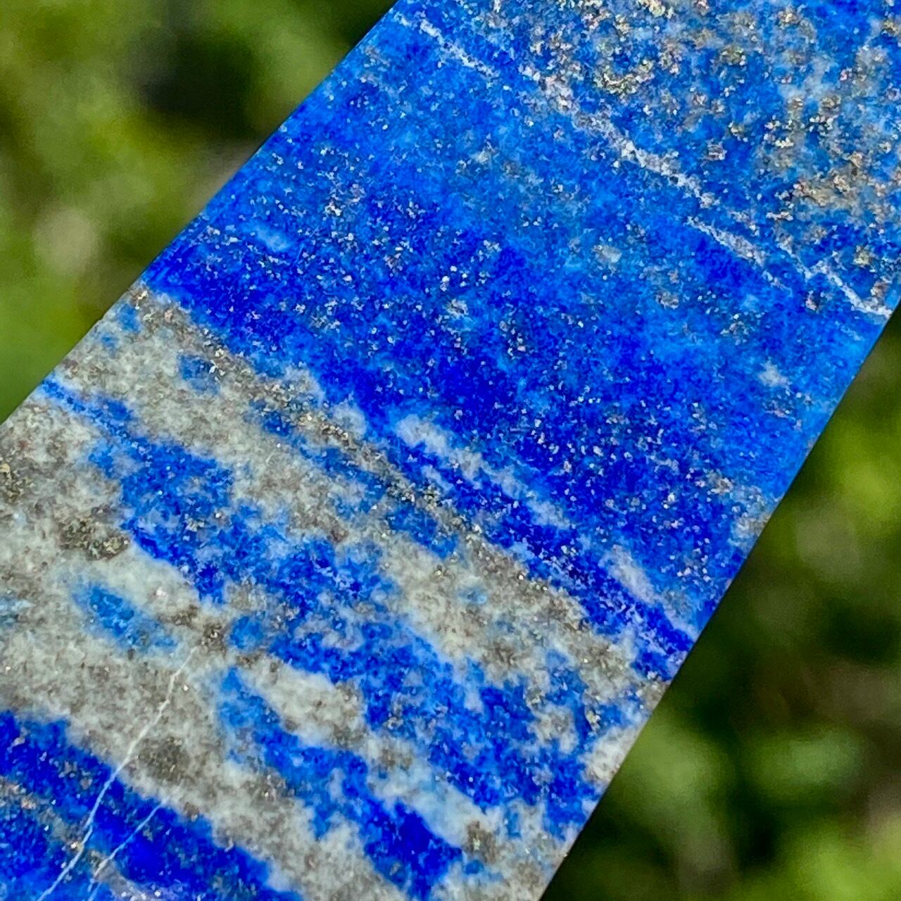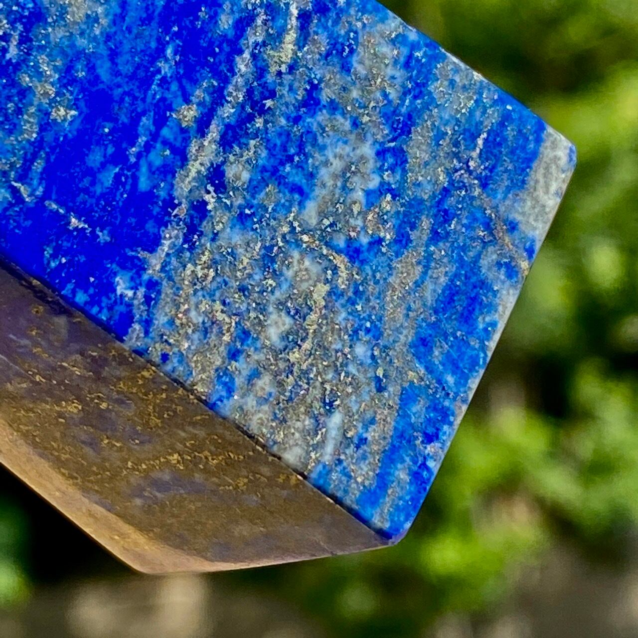 紺青色のラズライト(Lzaurite)に金色の斑点のパイライト、そして白っぽい母石のカルサイトが共生するラピスラズリ。