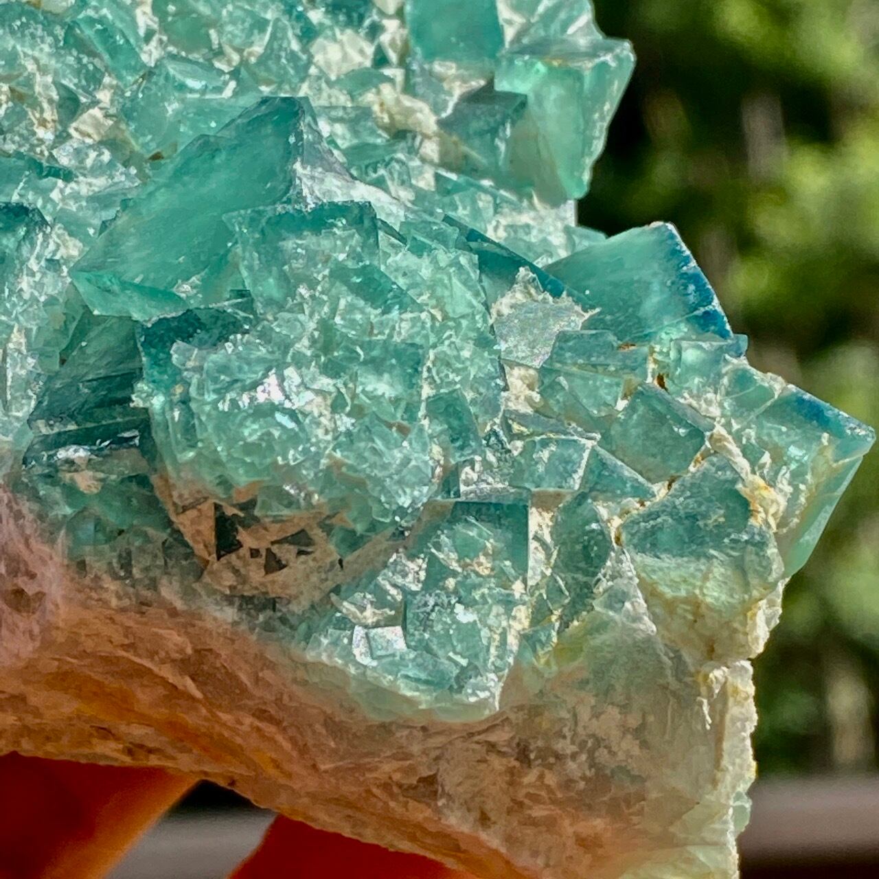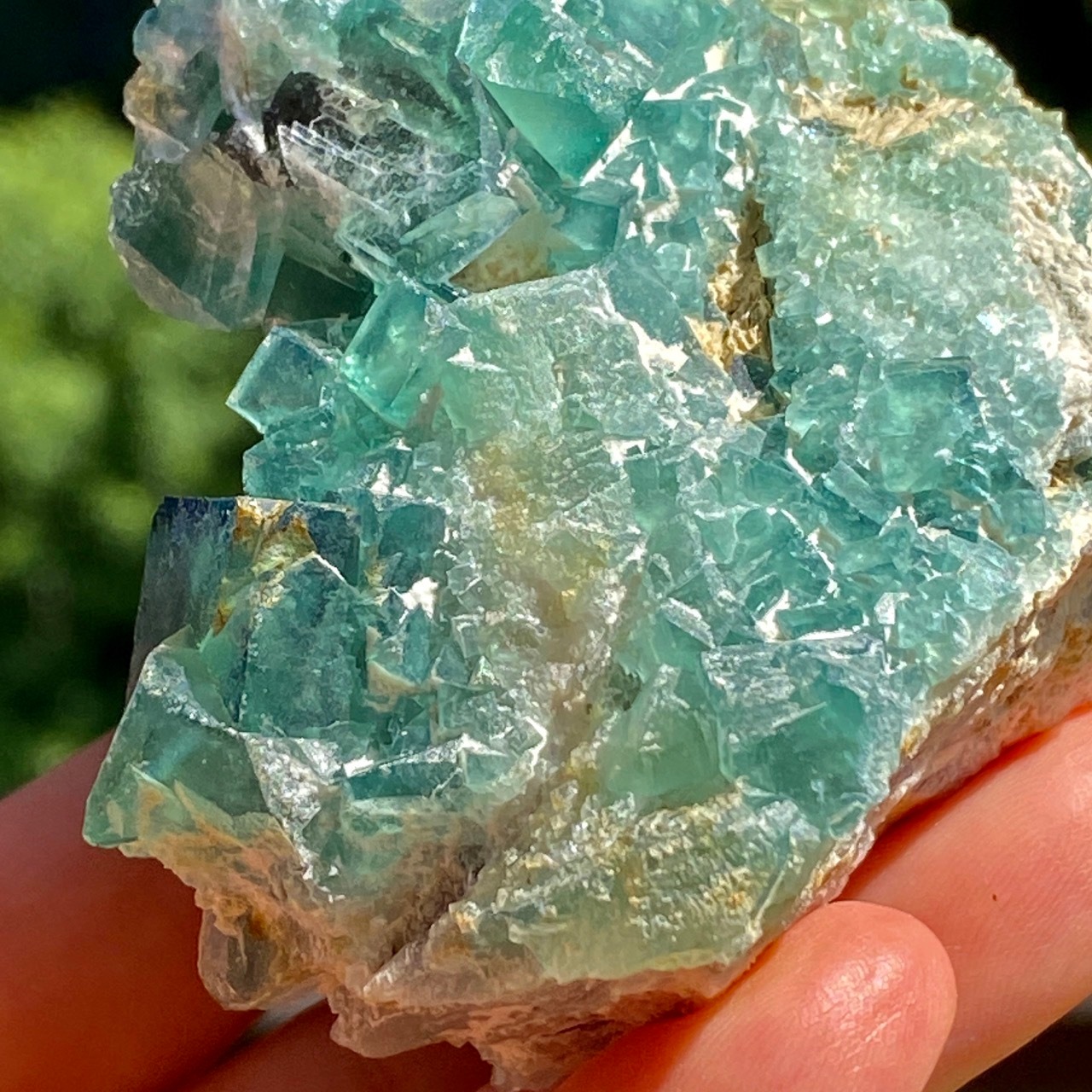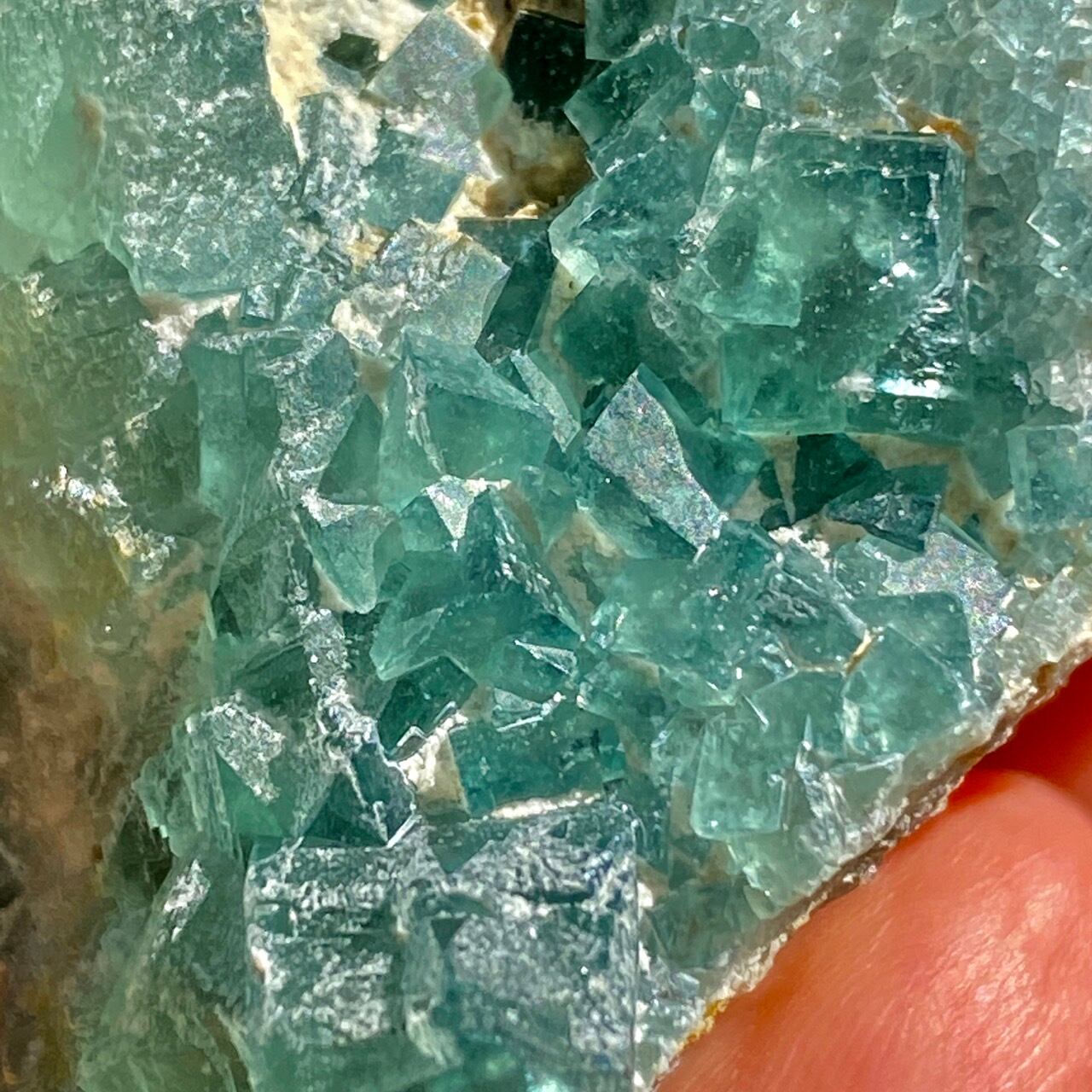 大きさの異なる結晶が見られ、光に当てると、母岩の表面が透けて見えます。