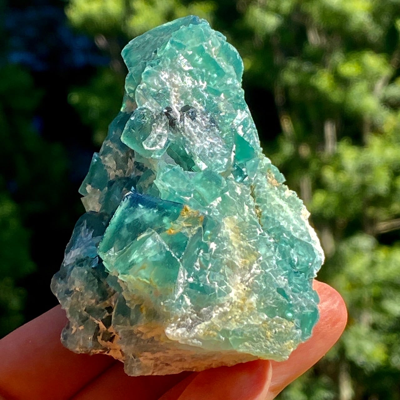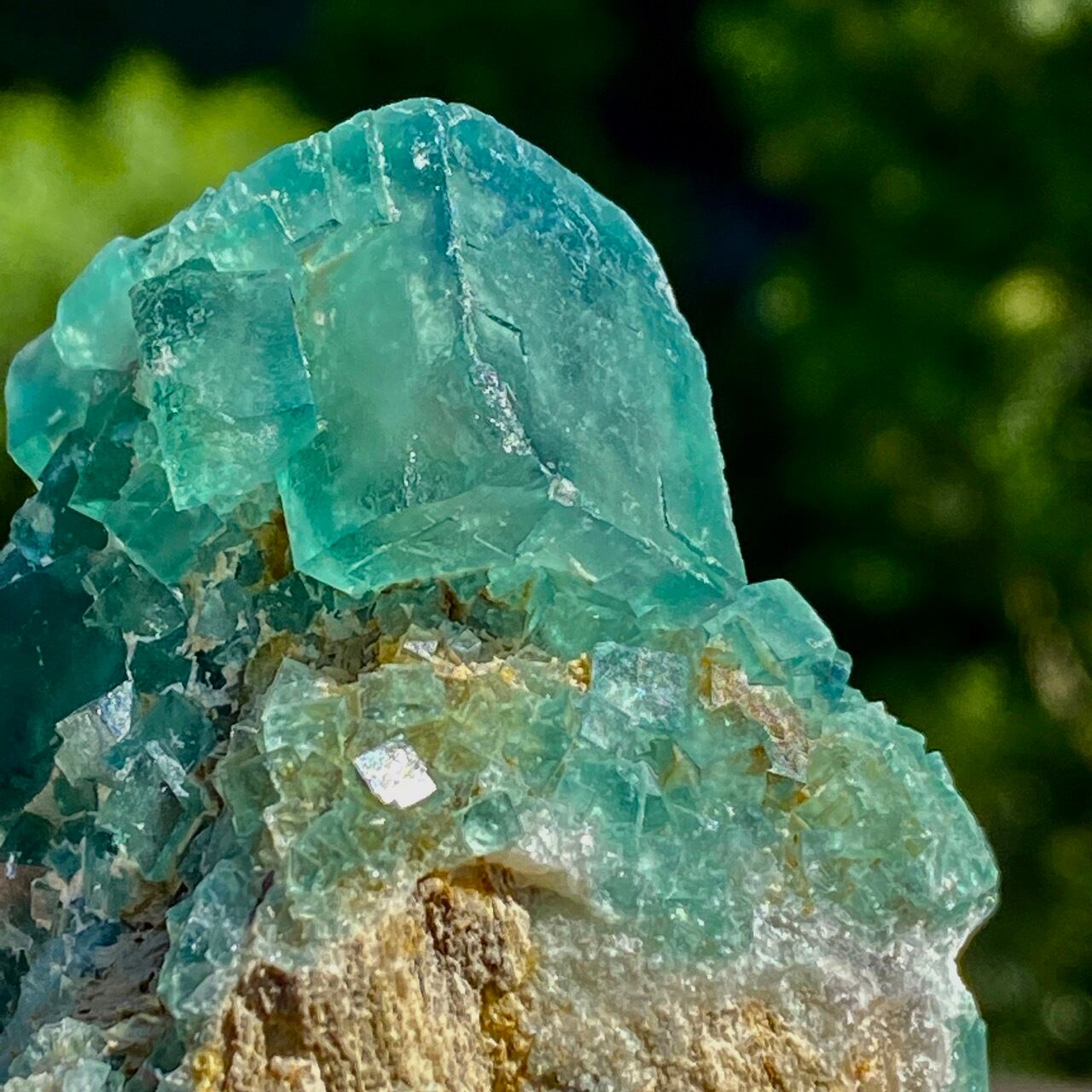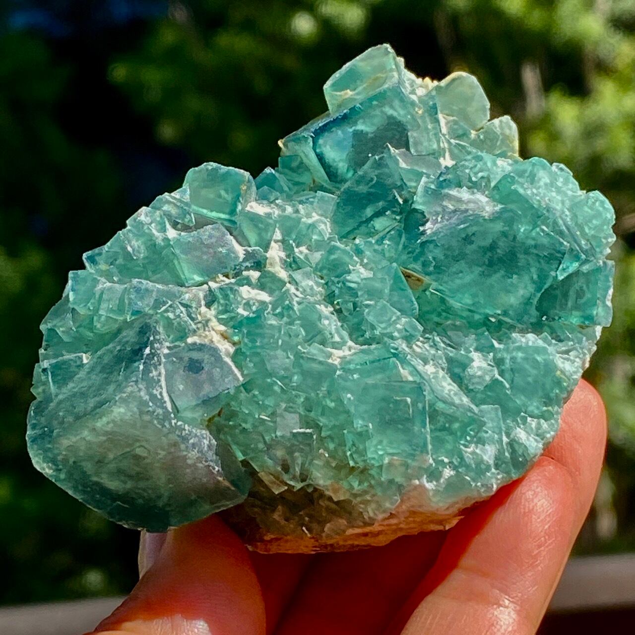 大きさの異なる結晶が見られ、光に当てると、母岩の表面が透けて見えます。