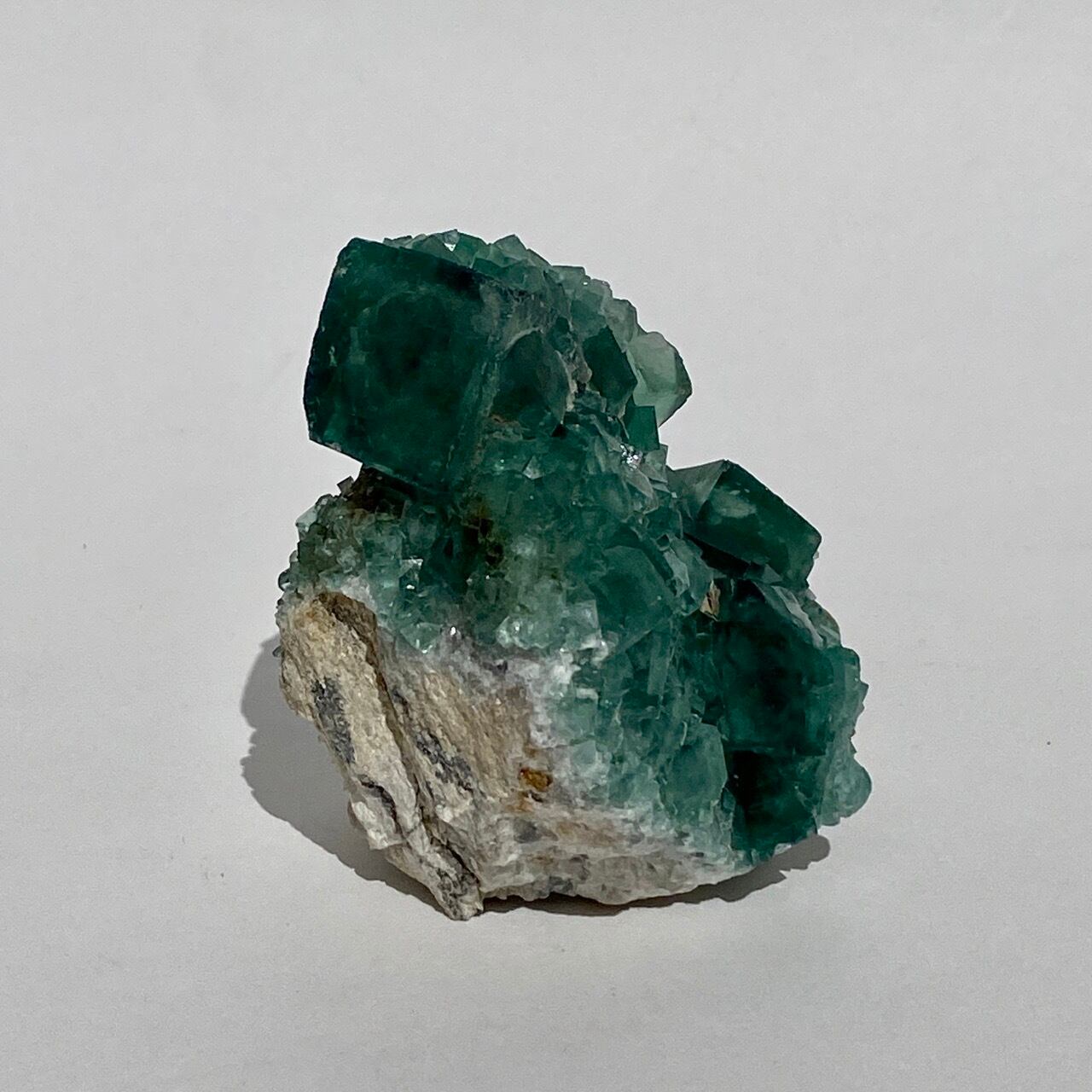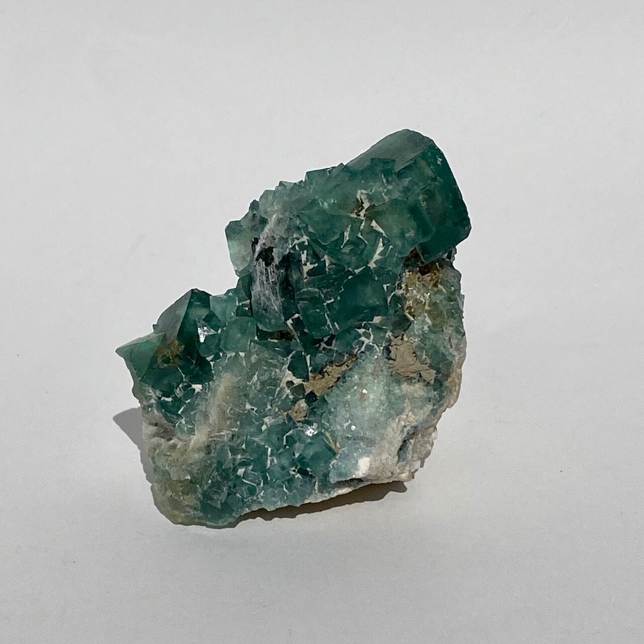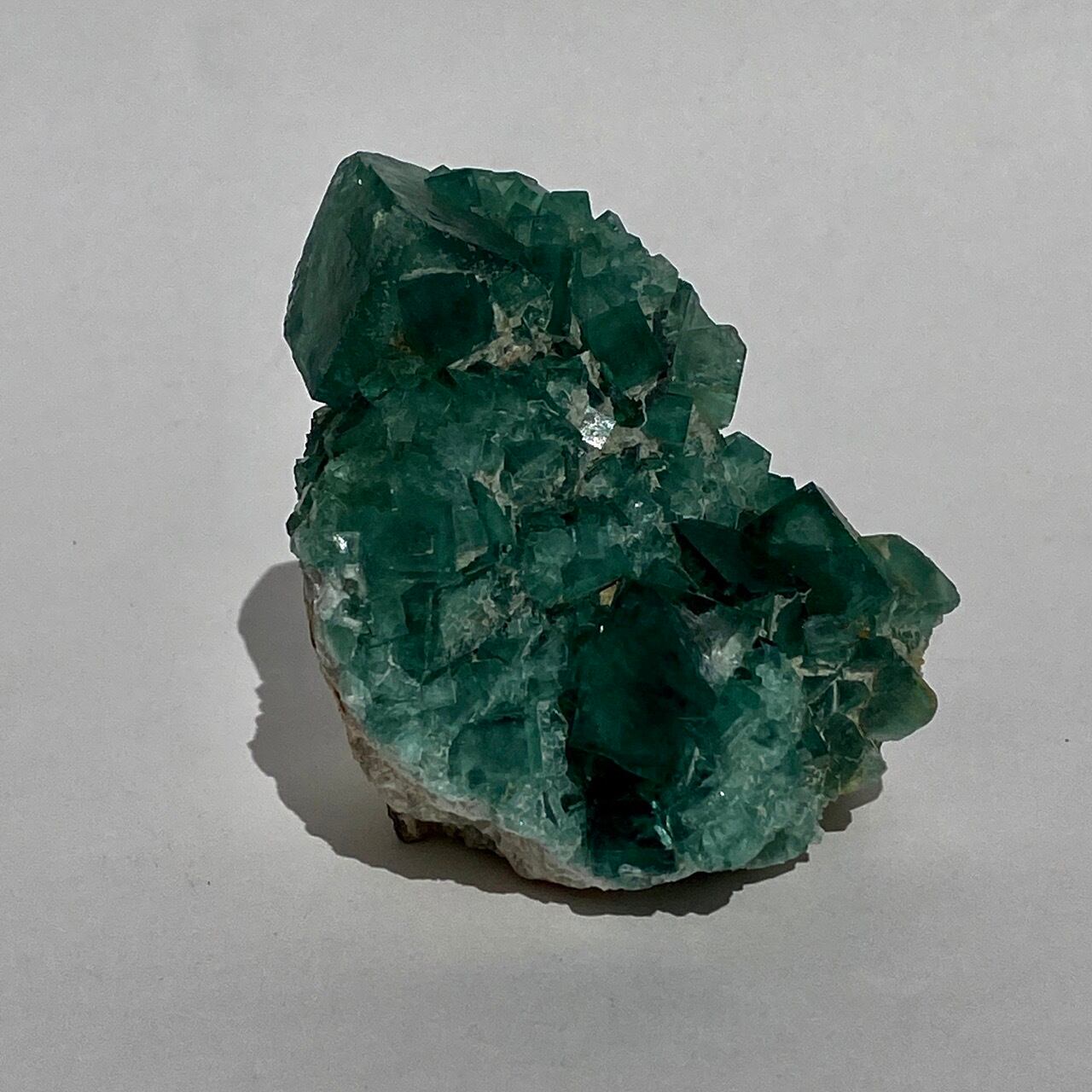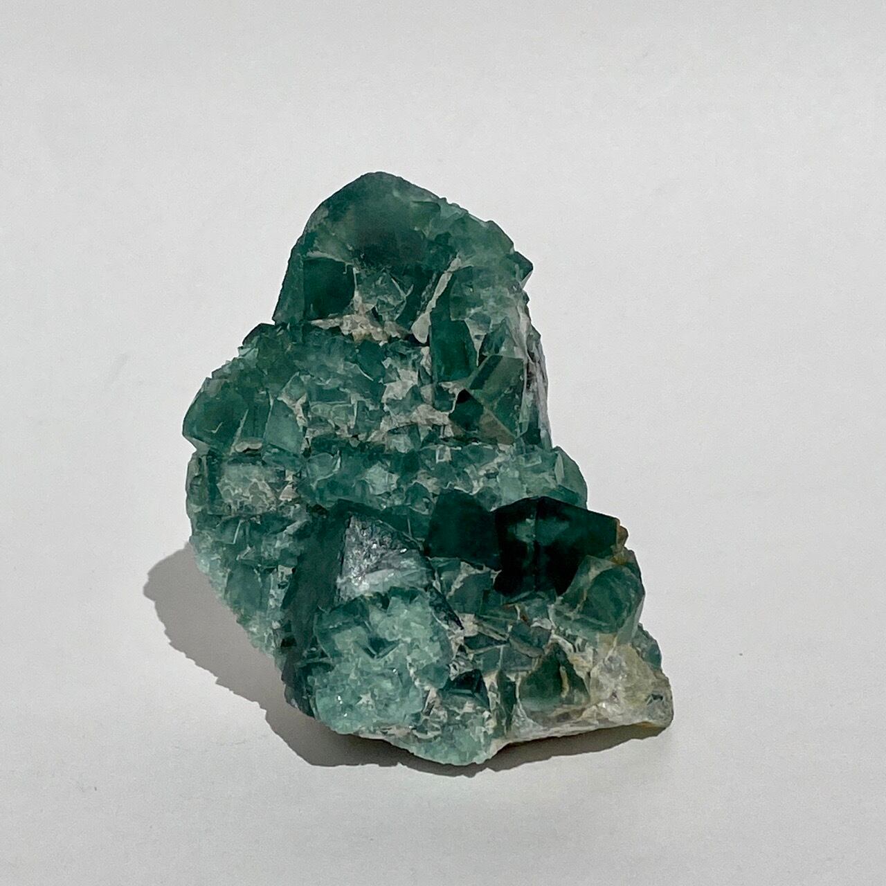 深緑のキューブ型結晶から成る、マダガスカル産フローライトのクラスターです。
