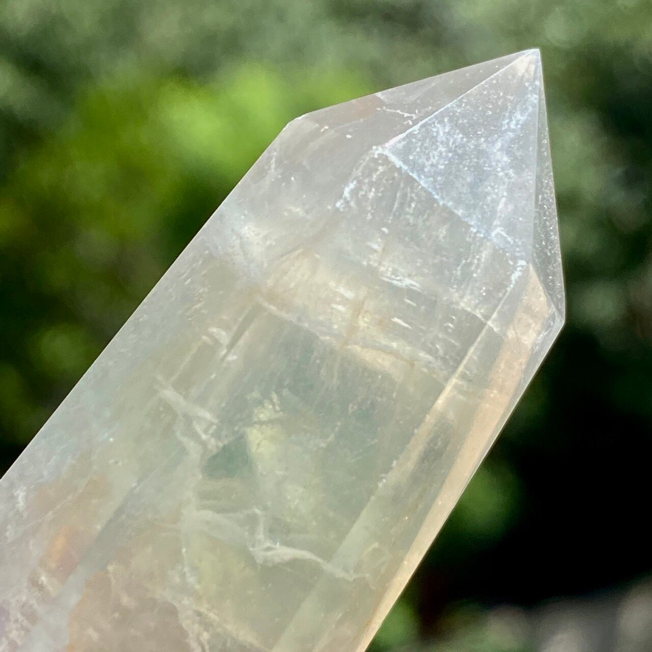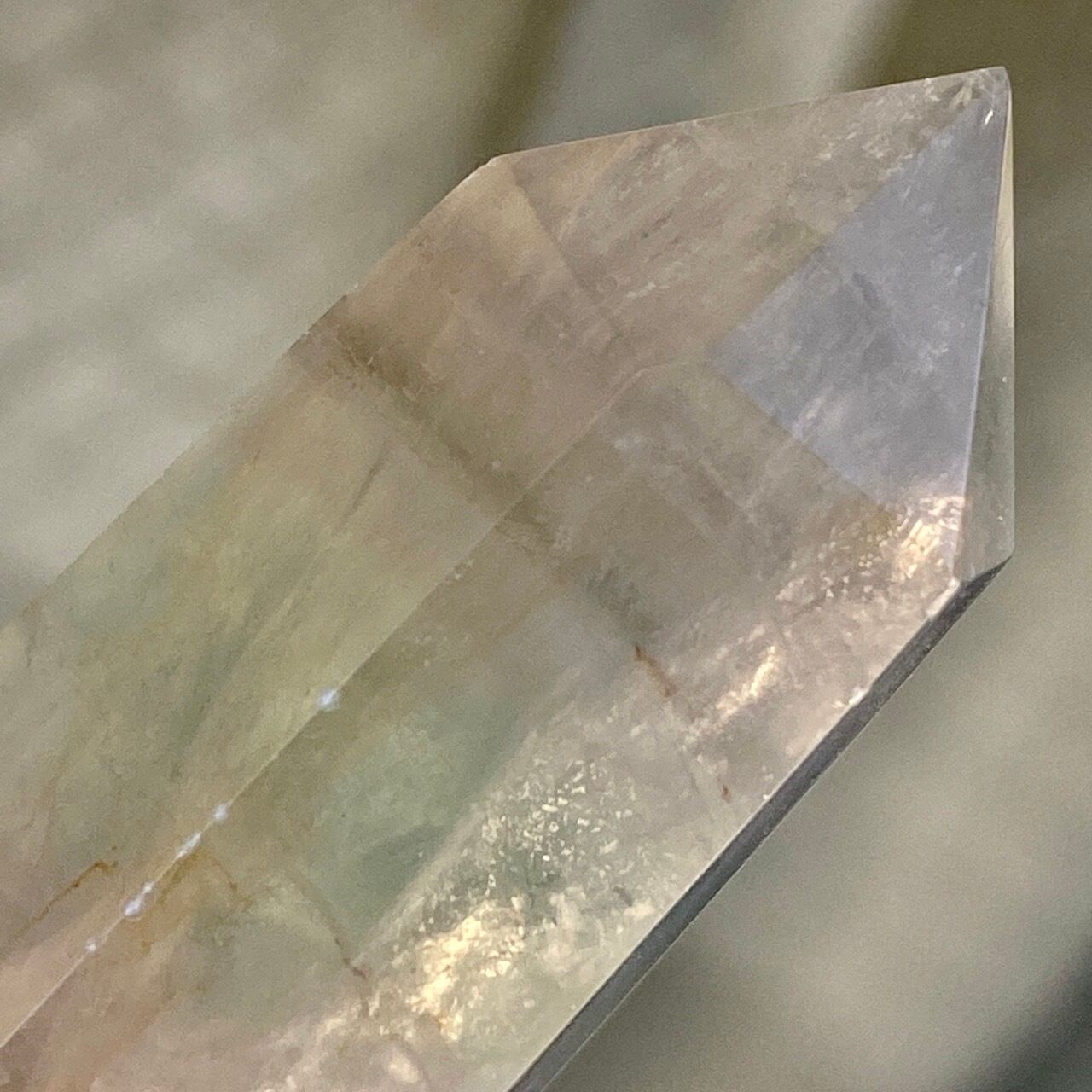 画像の通り、フローライト特有のクラックがございますが表面を指で触れても感じられません。所々、細かいチップ(欠け)が底面に接するエリアに1箇所と、面と面が接する線上に複数箇所ございます。また、底面のカットの仕方により、若干ぐらつきがございますので、価格を安めに設定しております。