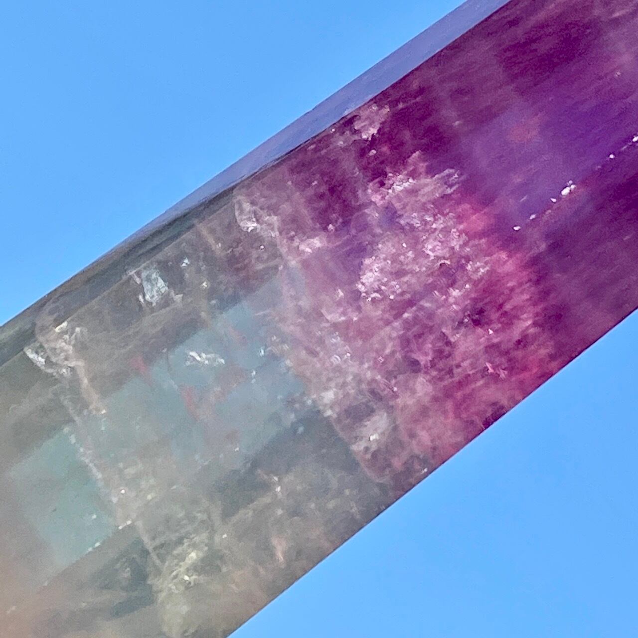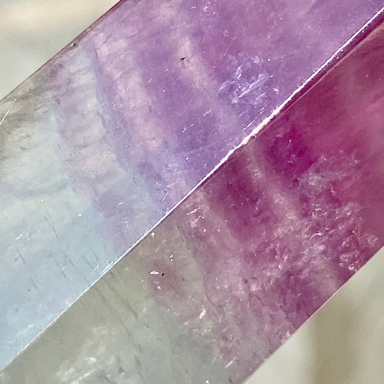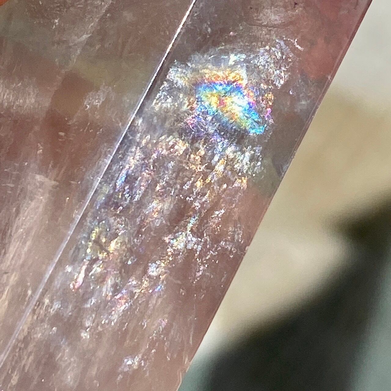 太陽光で撮影していた際に、ピンクとパープルの光がポイント部分に浮き上がった子です(画像1枚目に掲載有)。また、下部にも虹が浮かびます。
