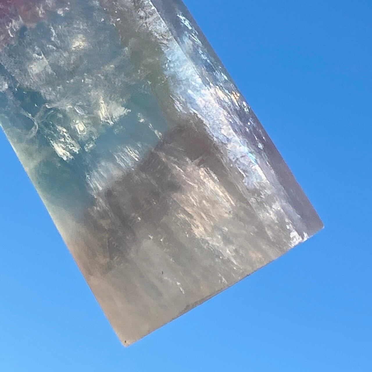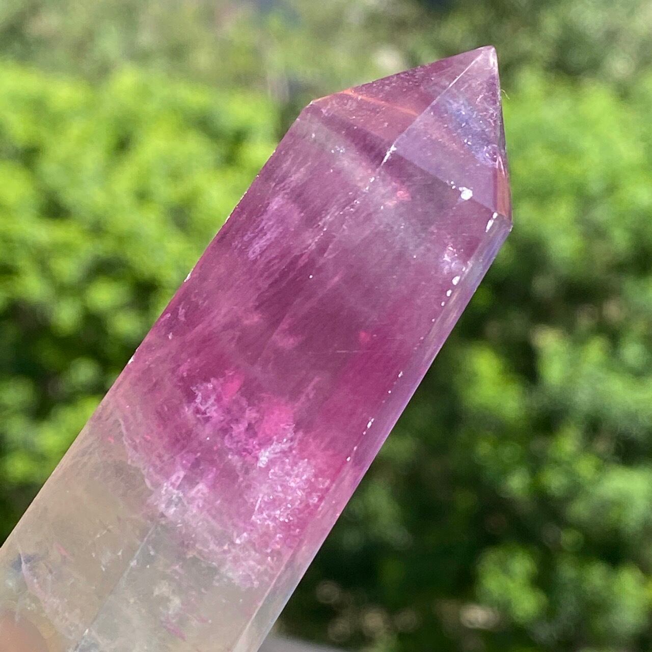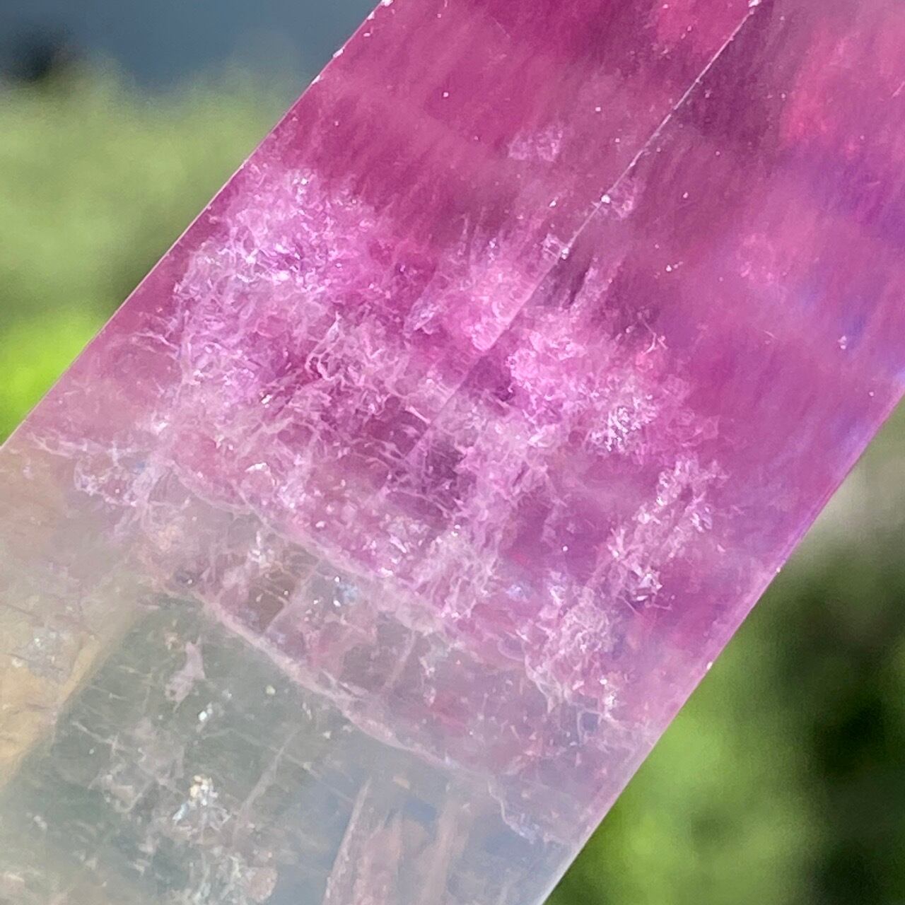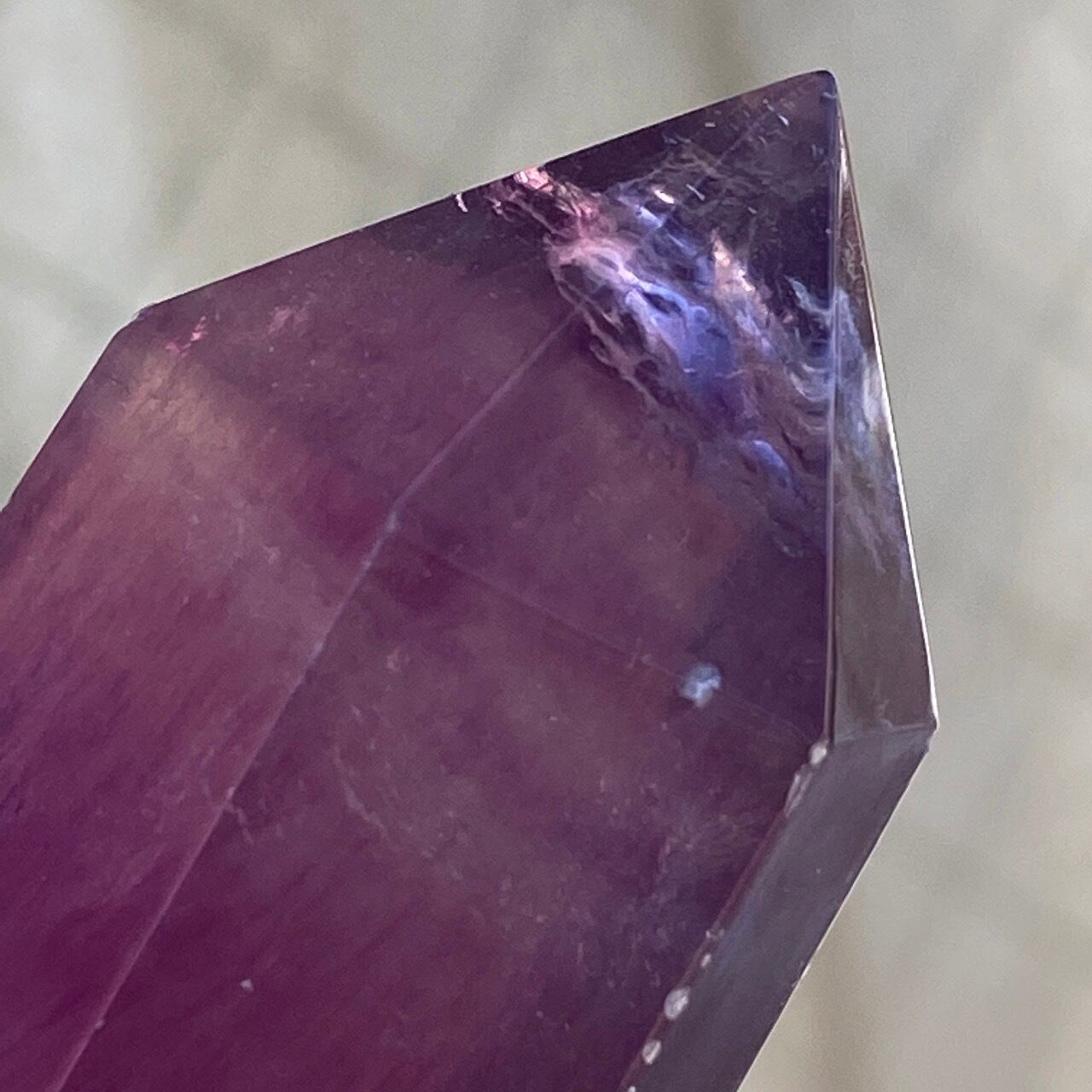 太陽光で撮影していた際に、ピンクとパープルの光がポイント部分に浮き上がった子です(画像1枚目に掲載有)。また、下部にも虹が浮かびます。