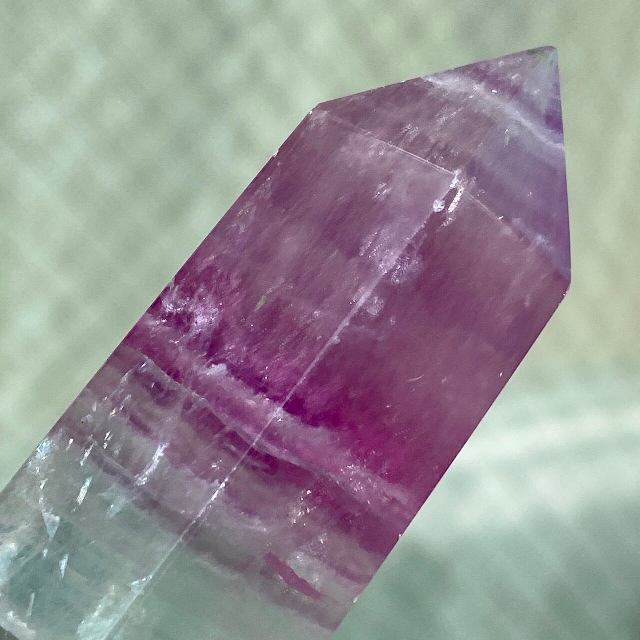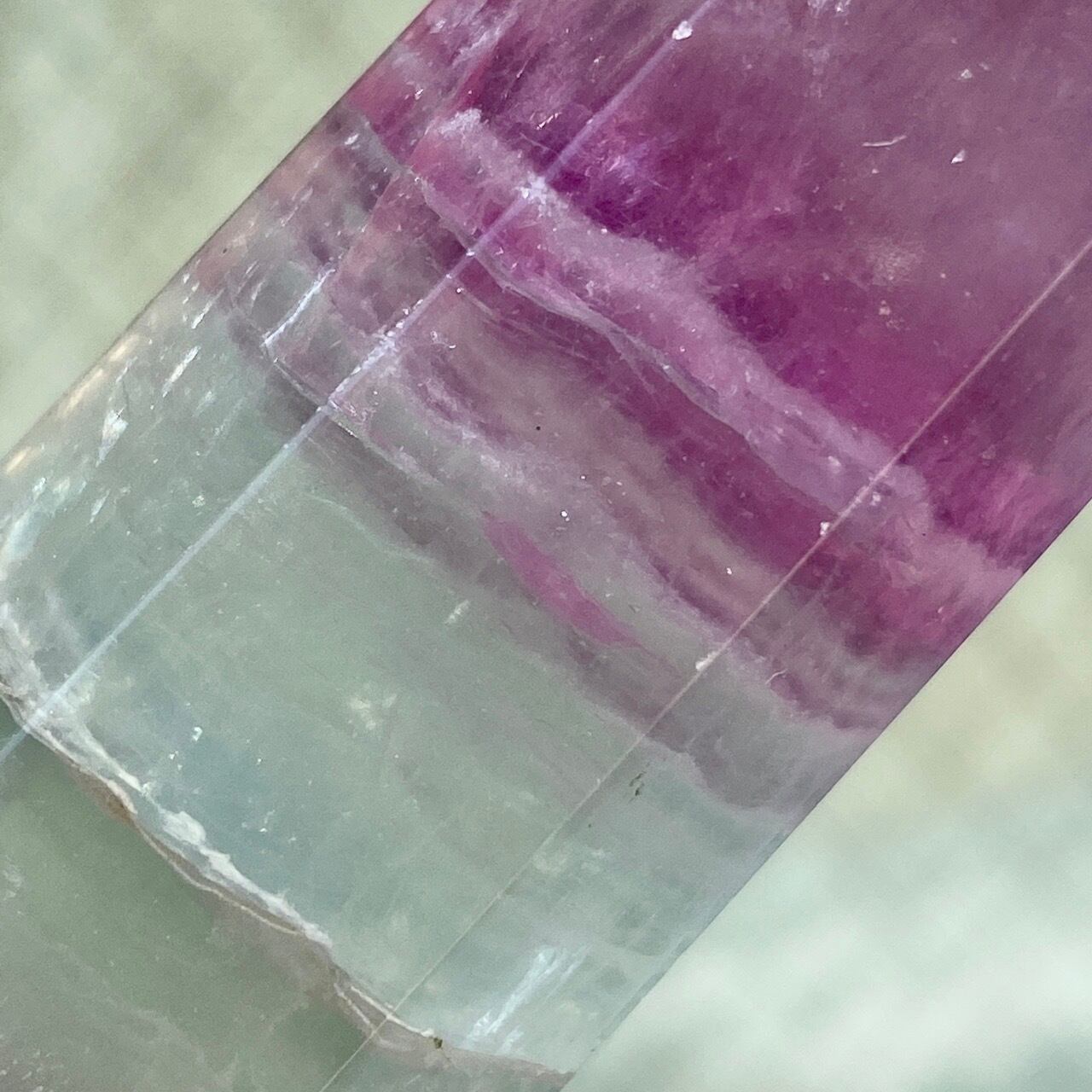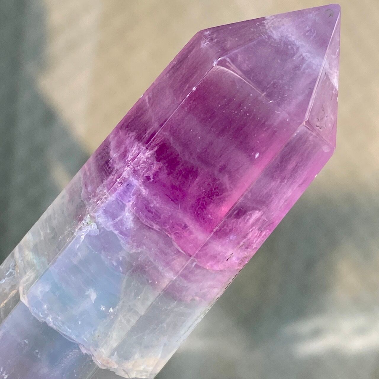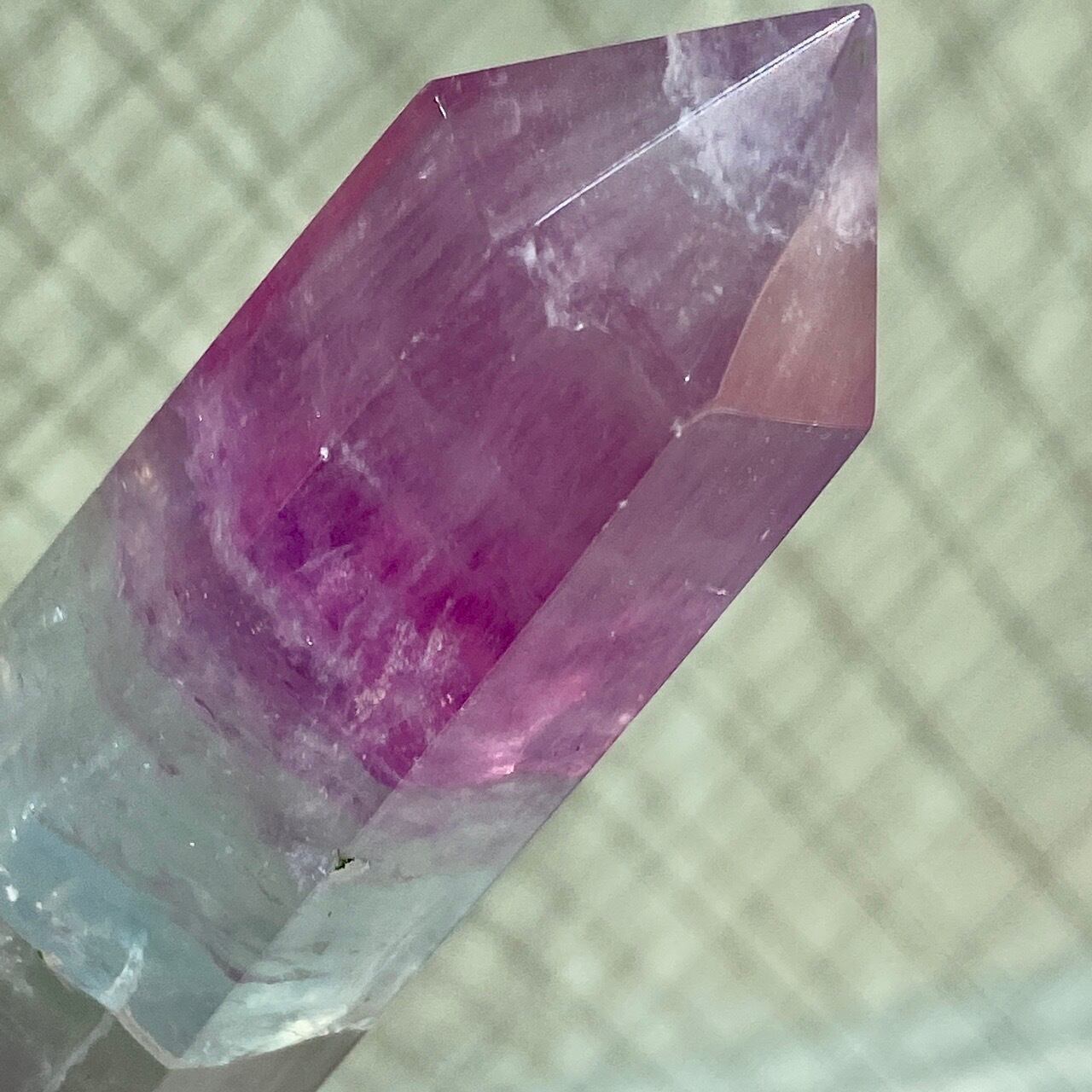 画像の通り、フローライト特有のクラックがございますが表面を指で触れても感じられません。面と面が接する線上に、おそらくカット時に発生するチップ(欠け-巾1mm程度とそれ以下)が複数箇所ございます。日光の下では、前半の画像の様に色味が明るく写りますが、室内ですと、当店のデバイスでは、後半の画像のようにグレープがかったピンクに見えます。