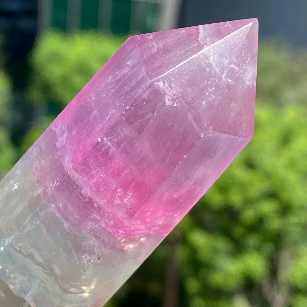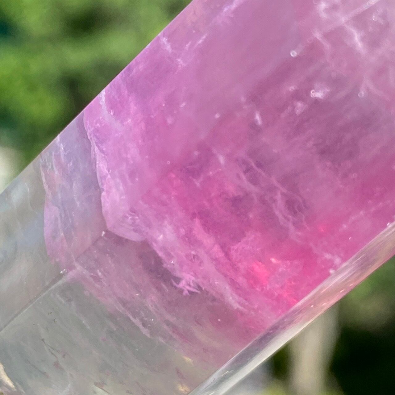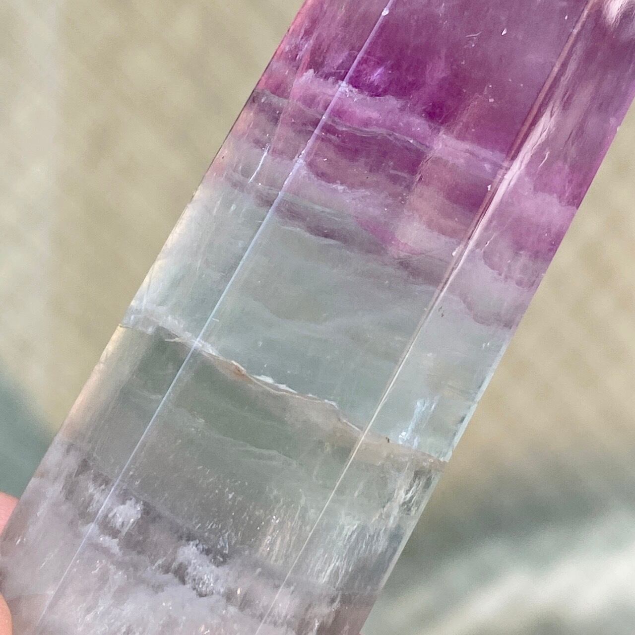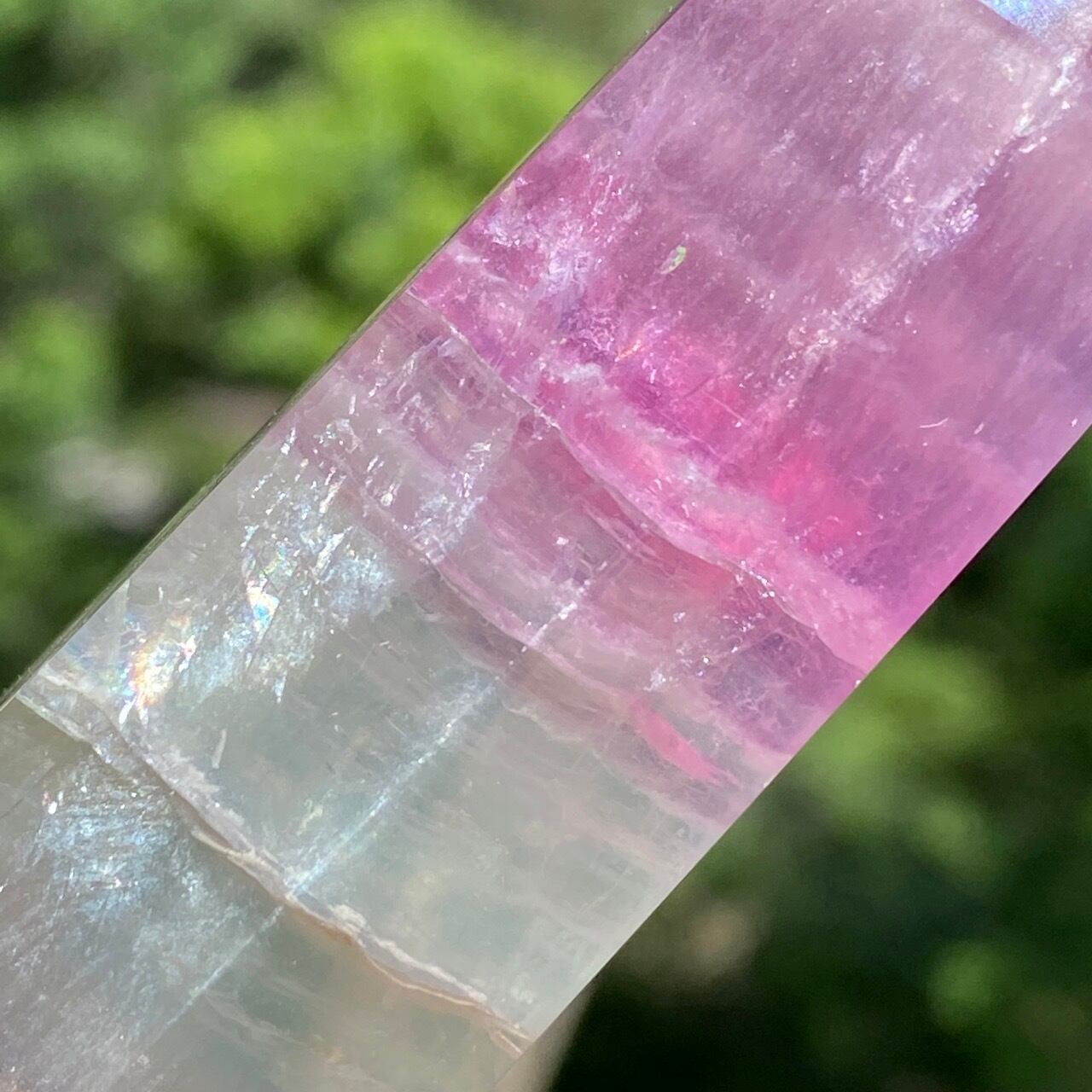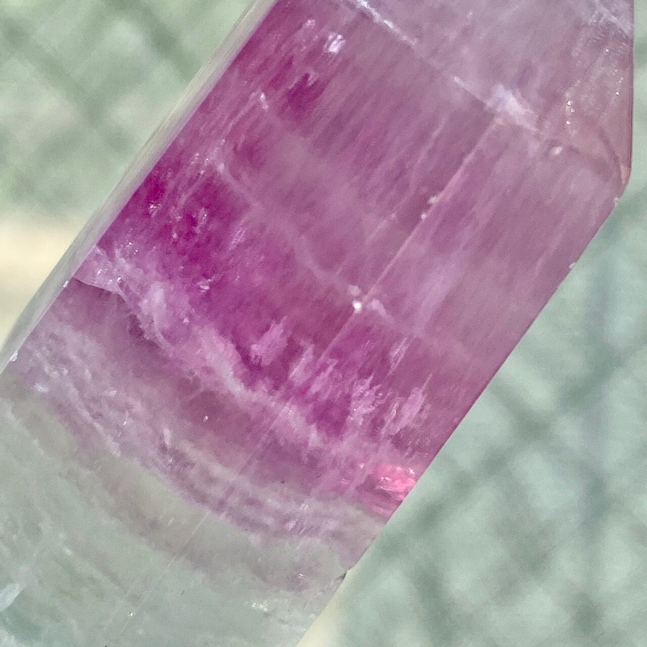 画像の通り、フローライト特有のクラックがございますが表面を指で触れても感じられません。面と面が接する線上に、おそらくカット時に発生するチップ(欠け-巾1mm程度とそれ以下)が複数箇所ございます。日光の下では、前半の画像の様に色味が明るく写りますが、室内ですと、当店のデバイスでは、後半の画像のようにグレープがかったピンクに見えます。