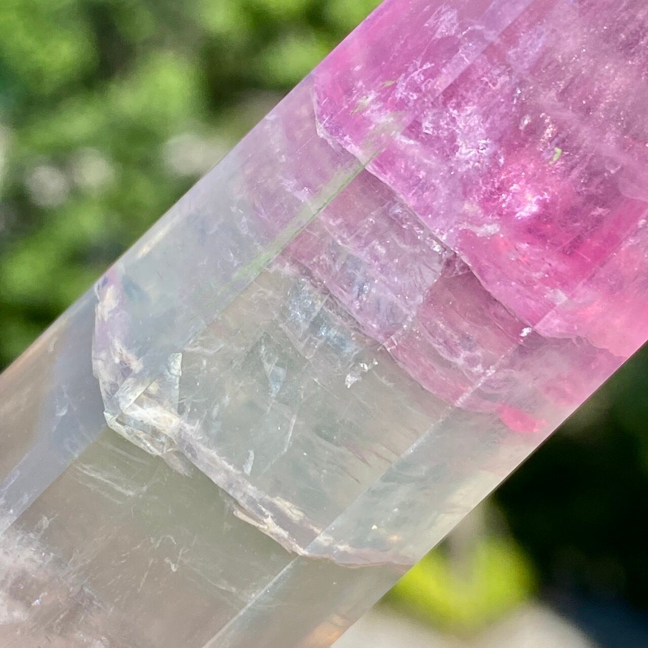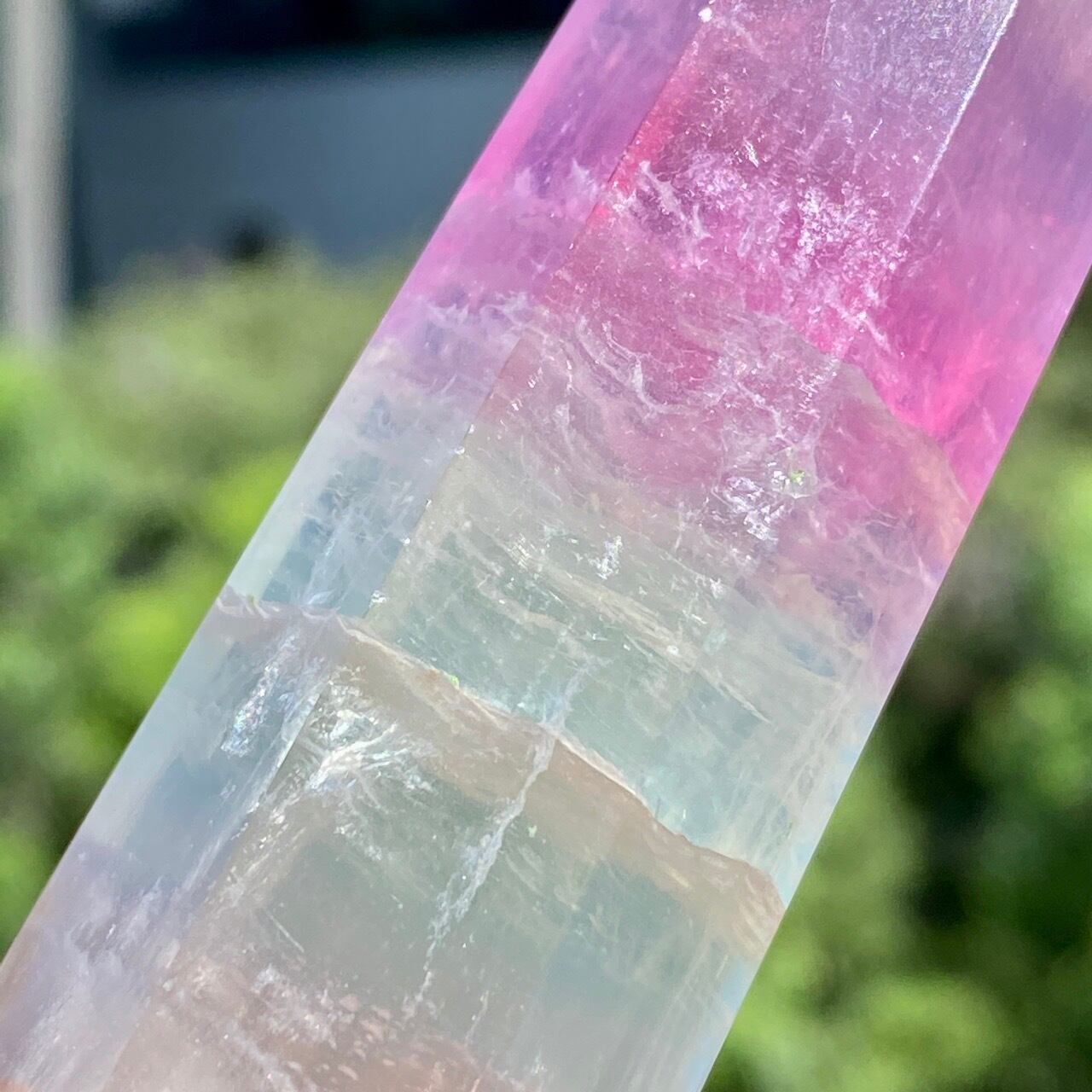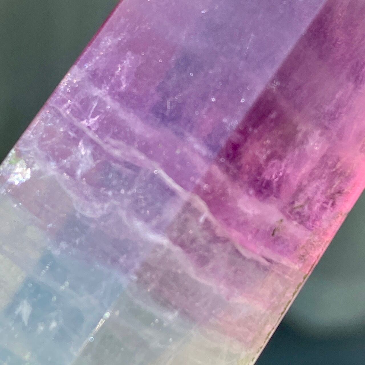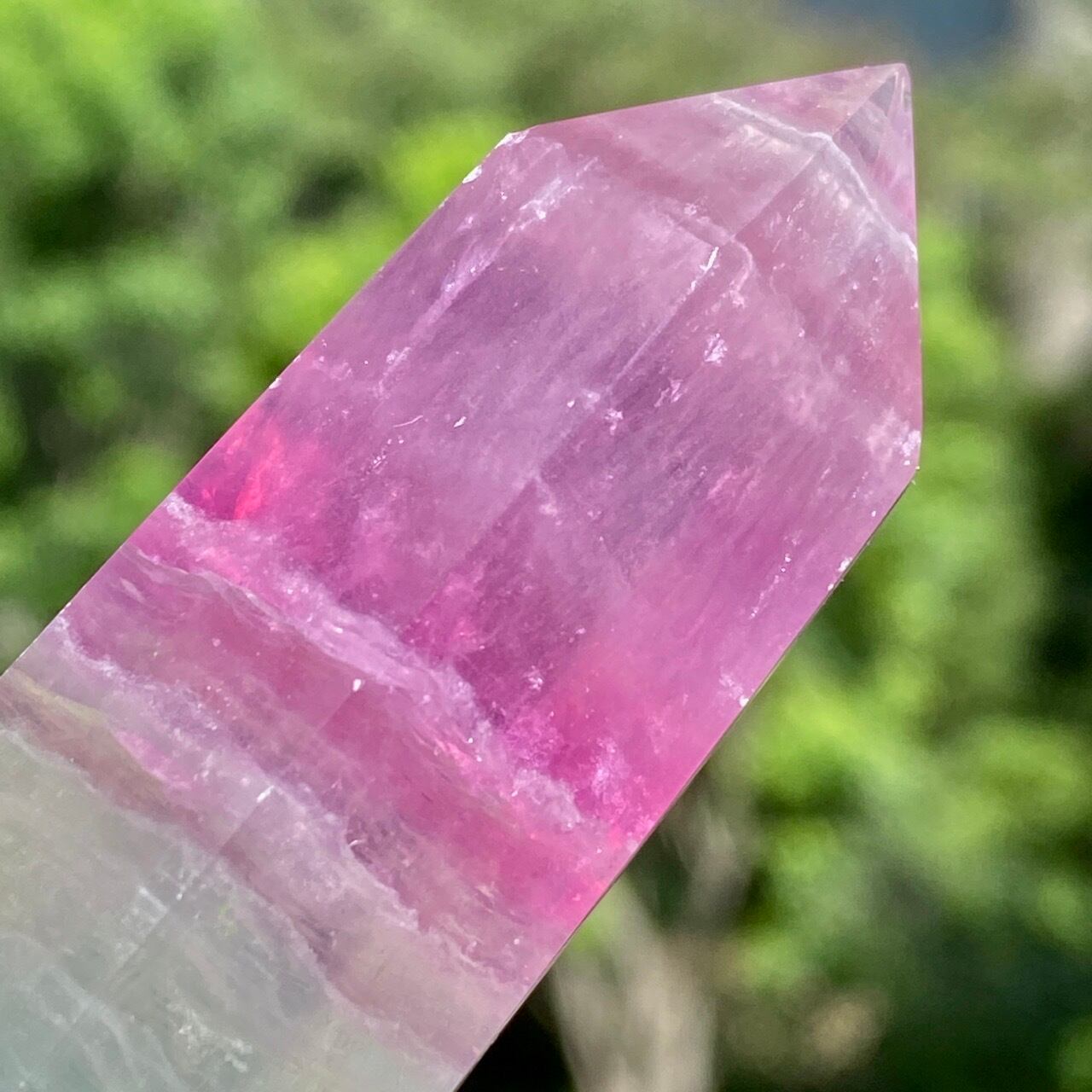 画像の通り、フローライト特有のクラックがございますが表面を指で触れても感じられません。面と面が接する線上に、おそらくカット時に発生するチップ(欠け-巾1mm程度とそれ以下)が複数箇所ございます。日光の下では、前半の画像の様に色味が明るく写りますが、室内ですと、当店のデバイスでは、後半の画像のようにグレープがかったピンクに見えます。