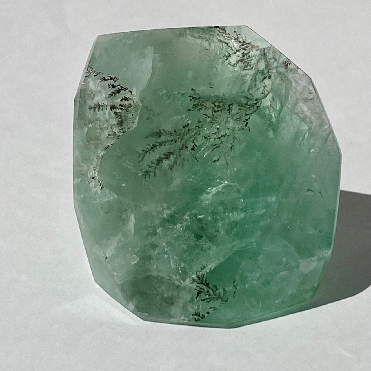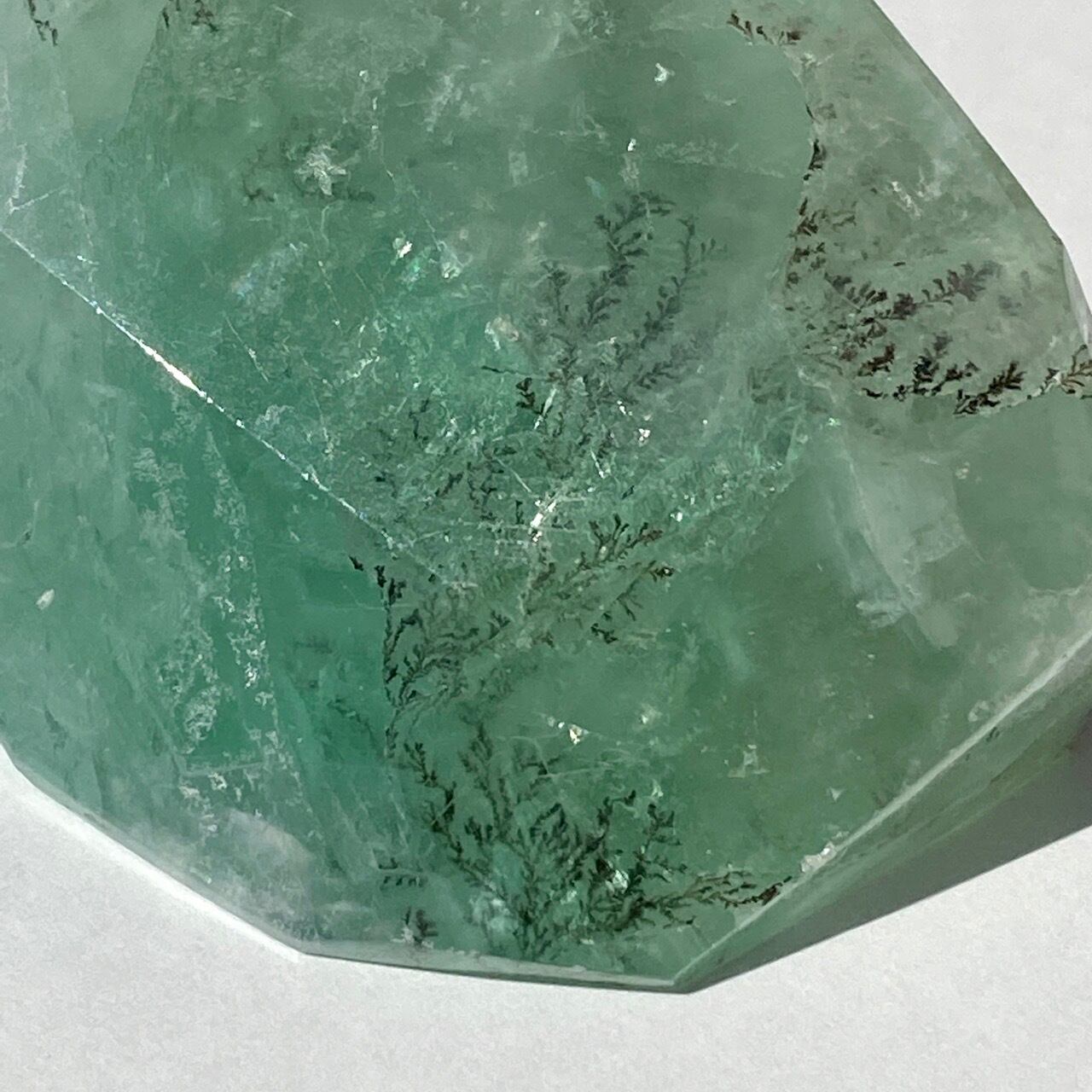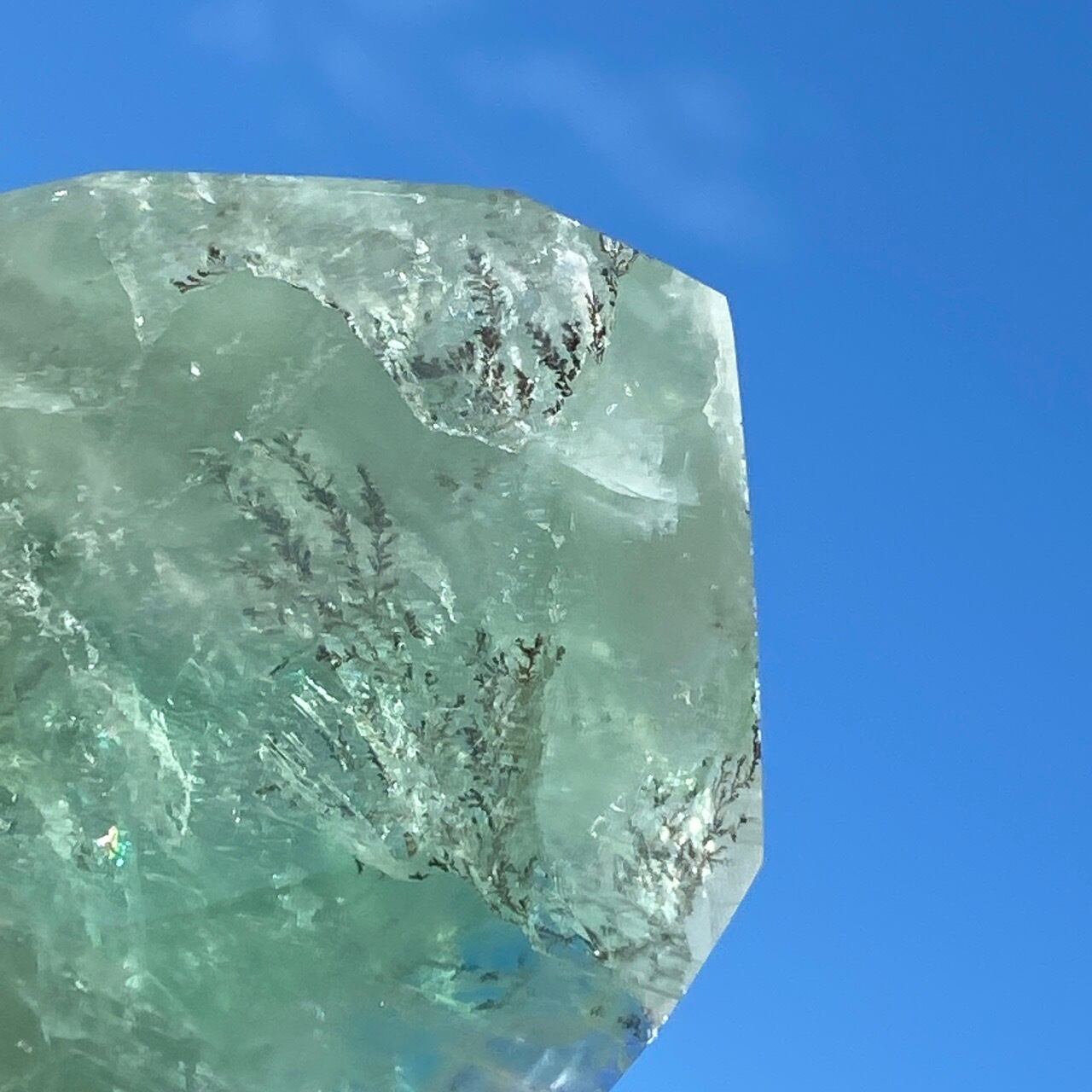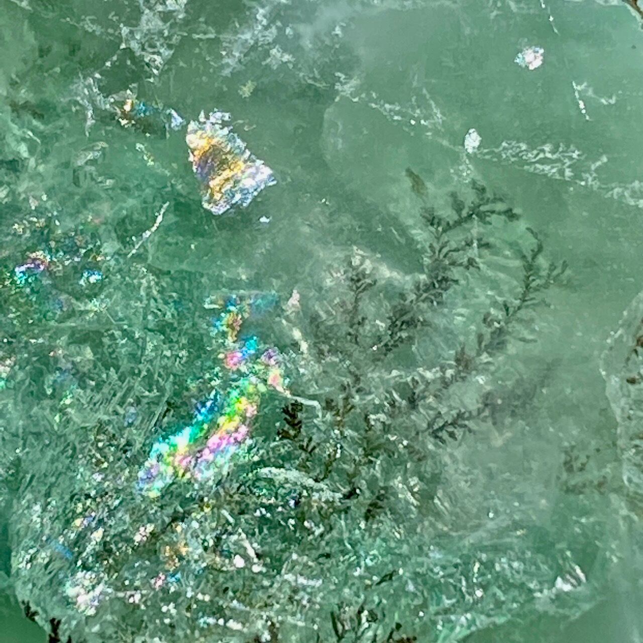 グリーンのフローライトにデンドライト(樹枝状の結晶)のインクルージョンが顔を覗かせています。白濁した部分と透け感がある部分から成り、正面から見ると、丁度透け感のある部分にデンドライトが浮かび上がり、その手前に虹が複数現れる素敵な子です。