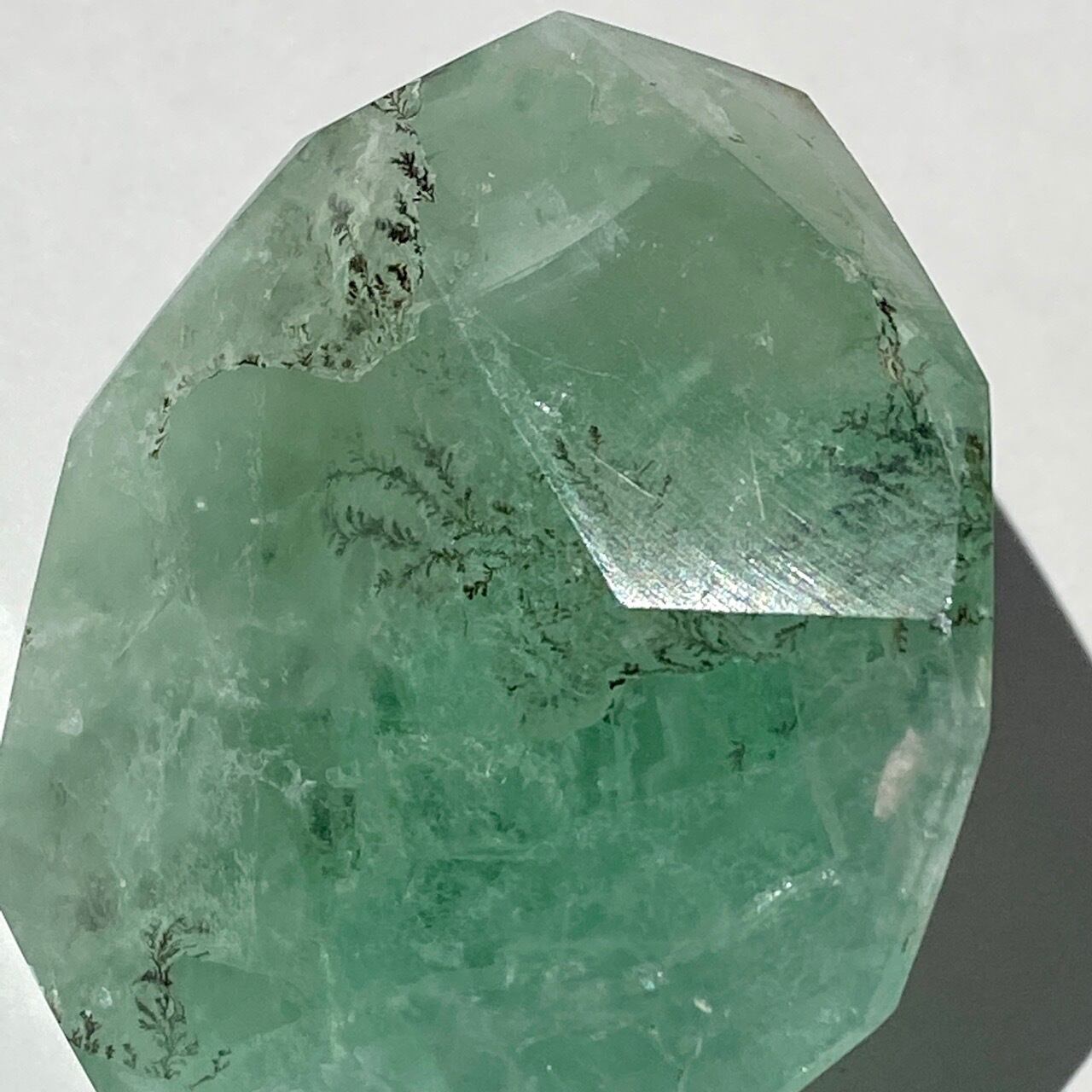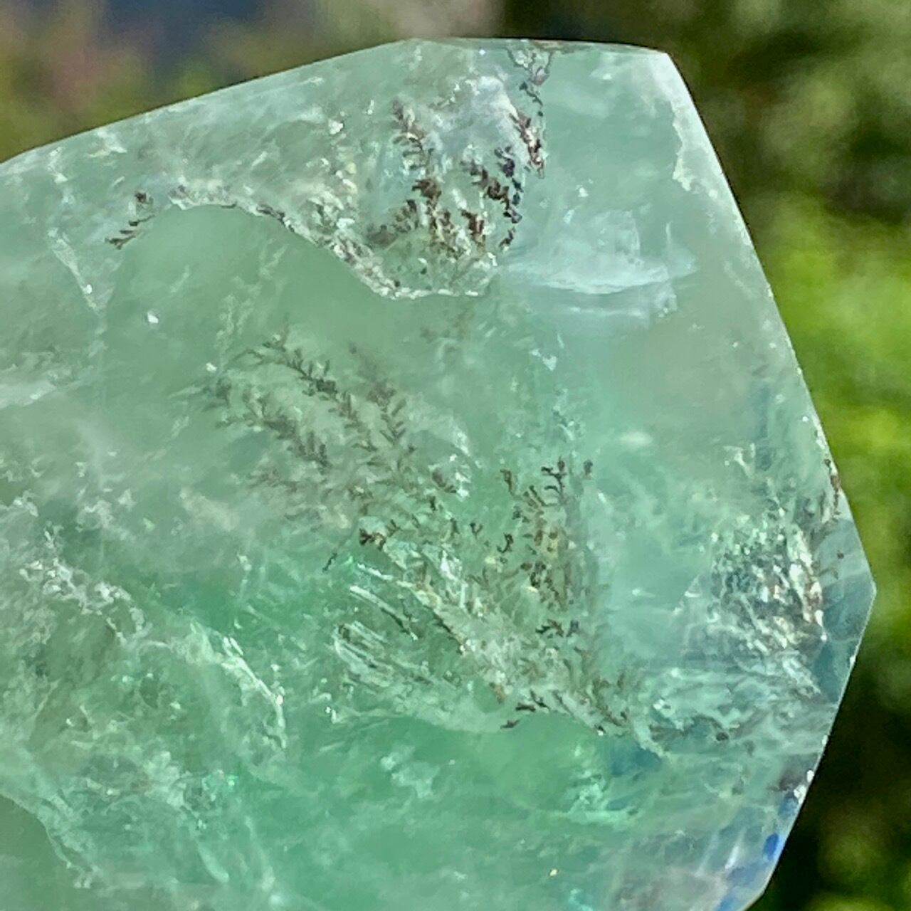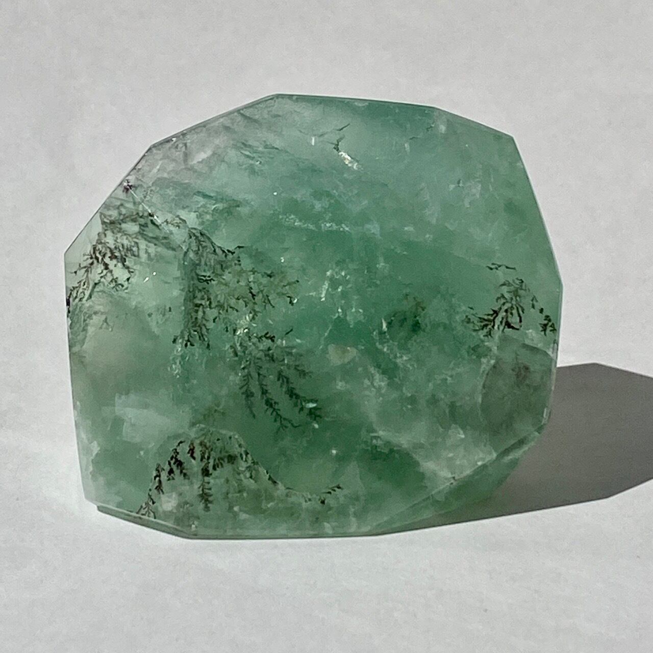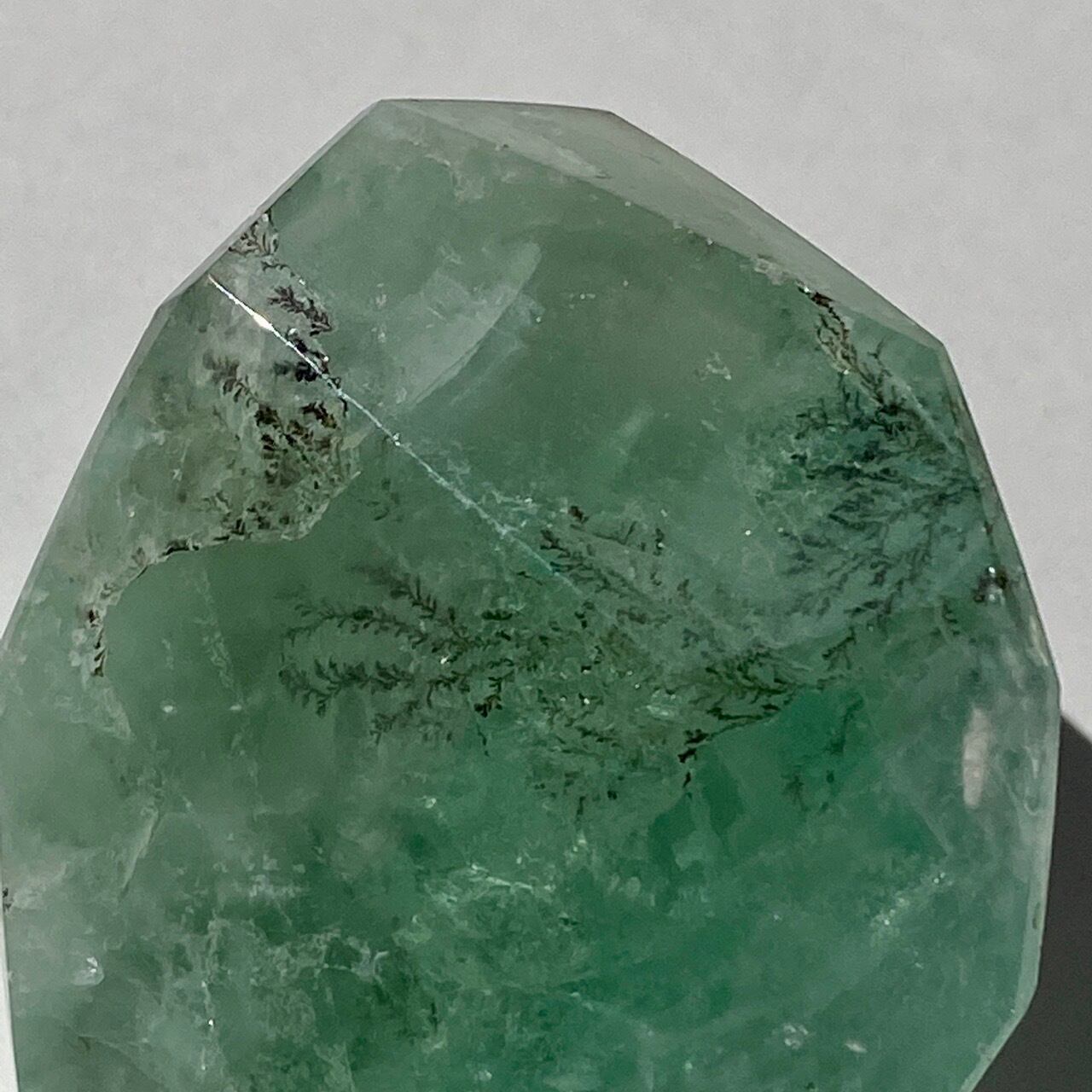 グリーンのフローライトにデンドライト(樹枝状の結晶)のインクルージョンが顔を覗かせています。白濁した部分と透け感がある部分から成り、正面から見ると、丁度透け感のある部分にデンドライトが浮かび上がり、その手前に虹が複数現れる素敵な子です。