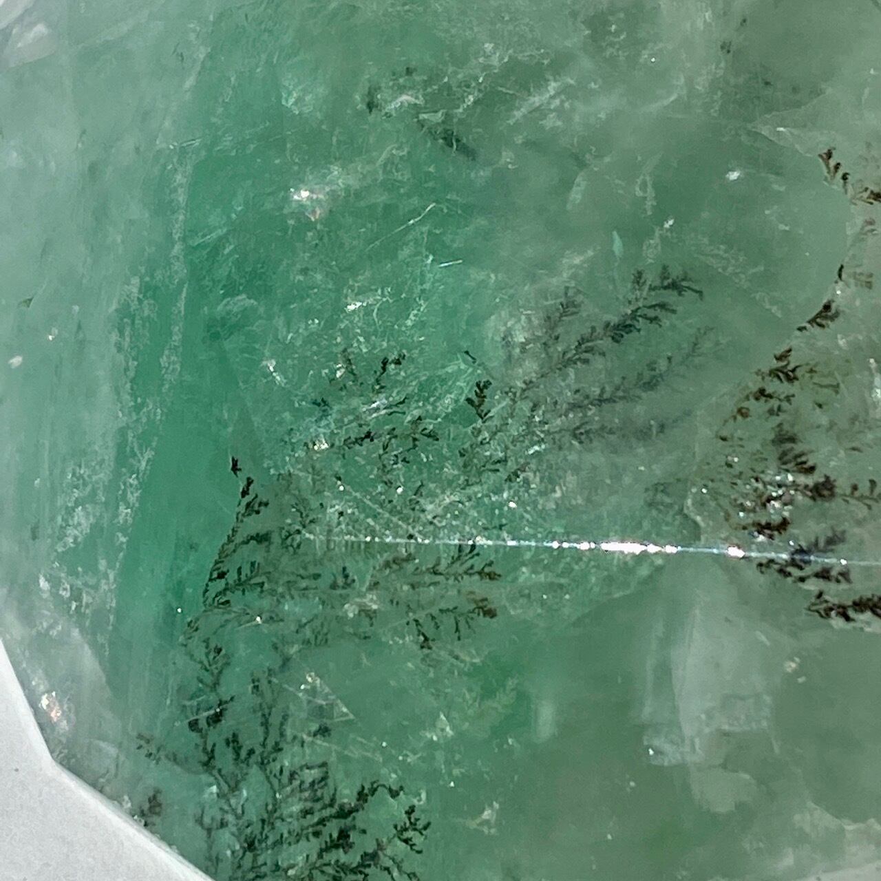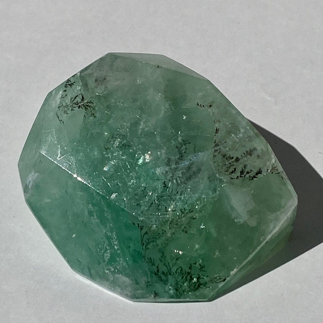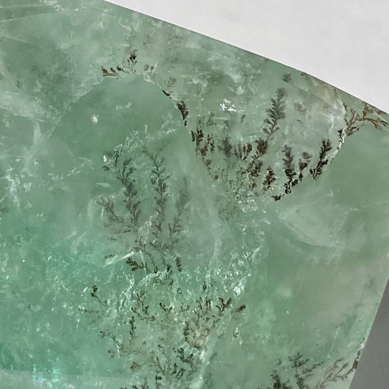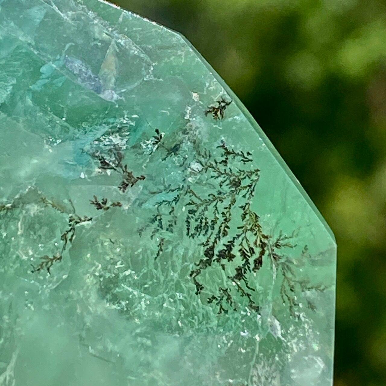 グリーンのフローライトにデンドライト(樹枝状の結晶)のインクルージョンが顔を覗かせています。白濁した部分と透け感がある部分から成り、正面から見ると、丁度透け感のある部分にデンドライトが浮かび上がり、その手前に虹が複数現れる素敵な子です。
