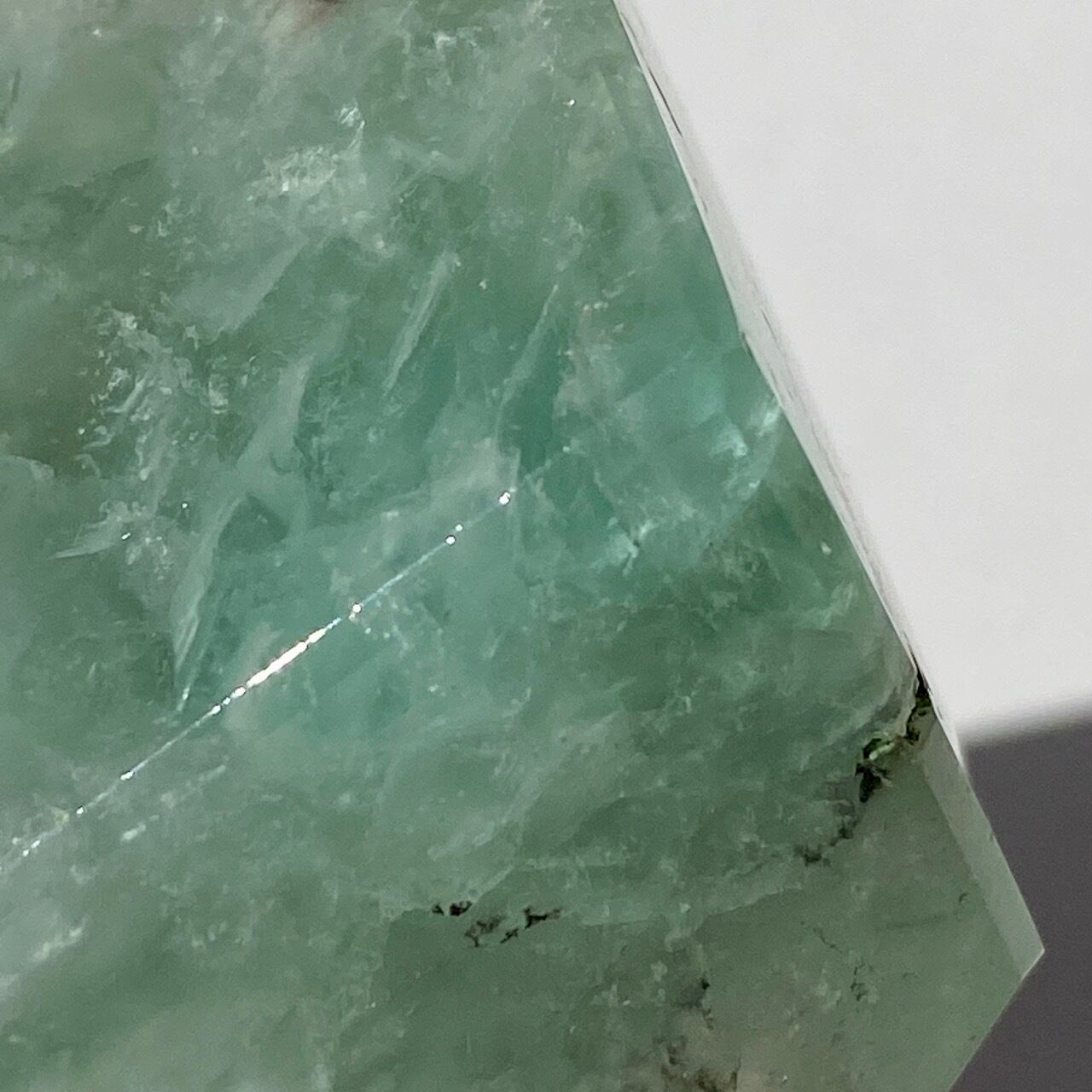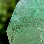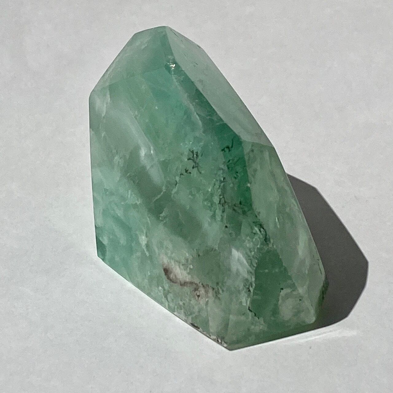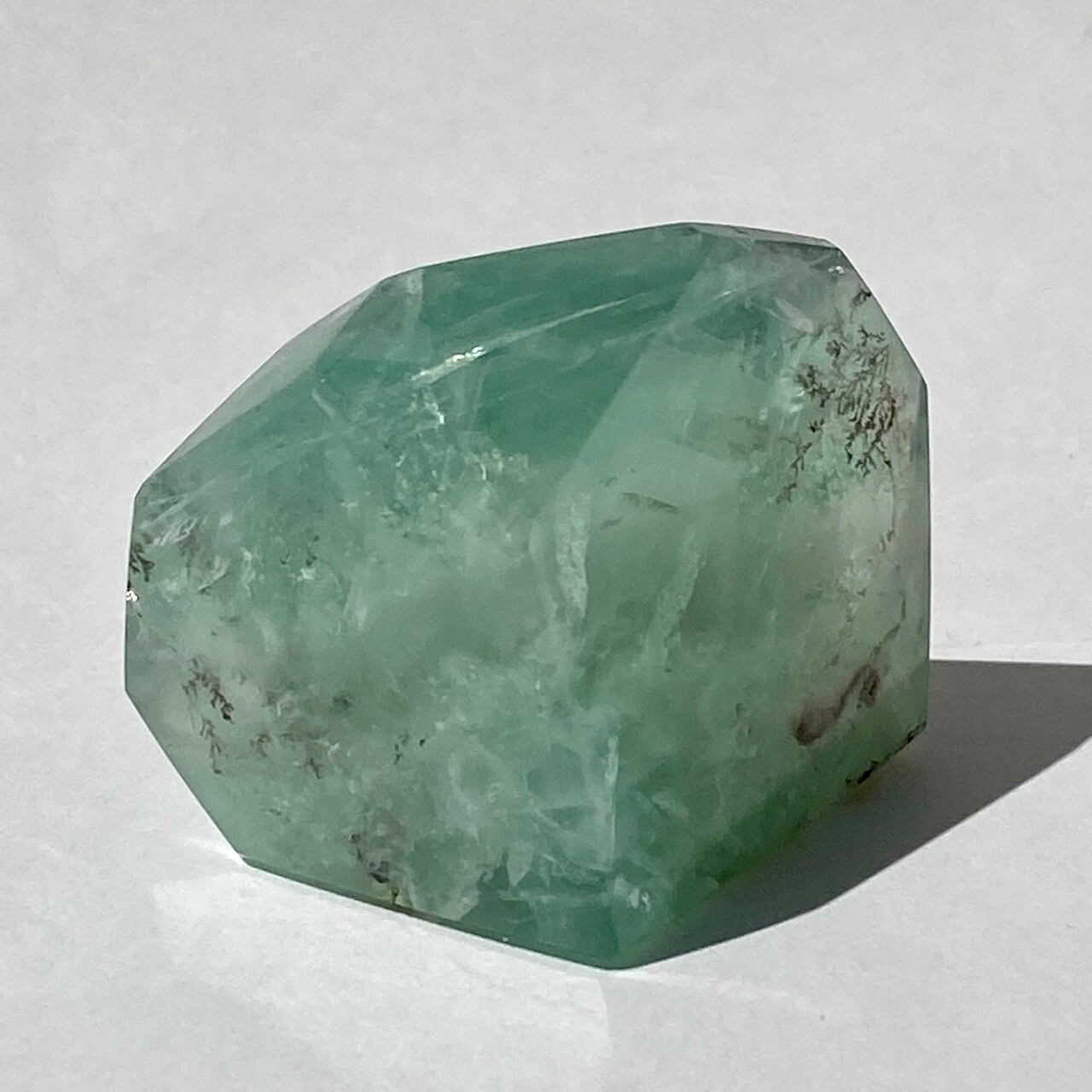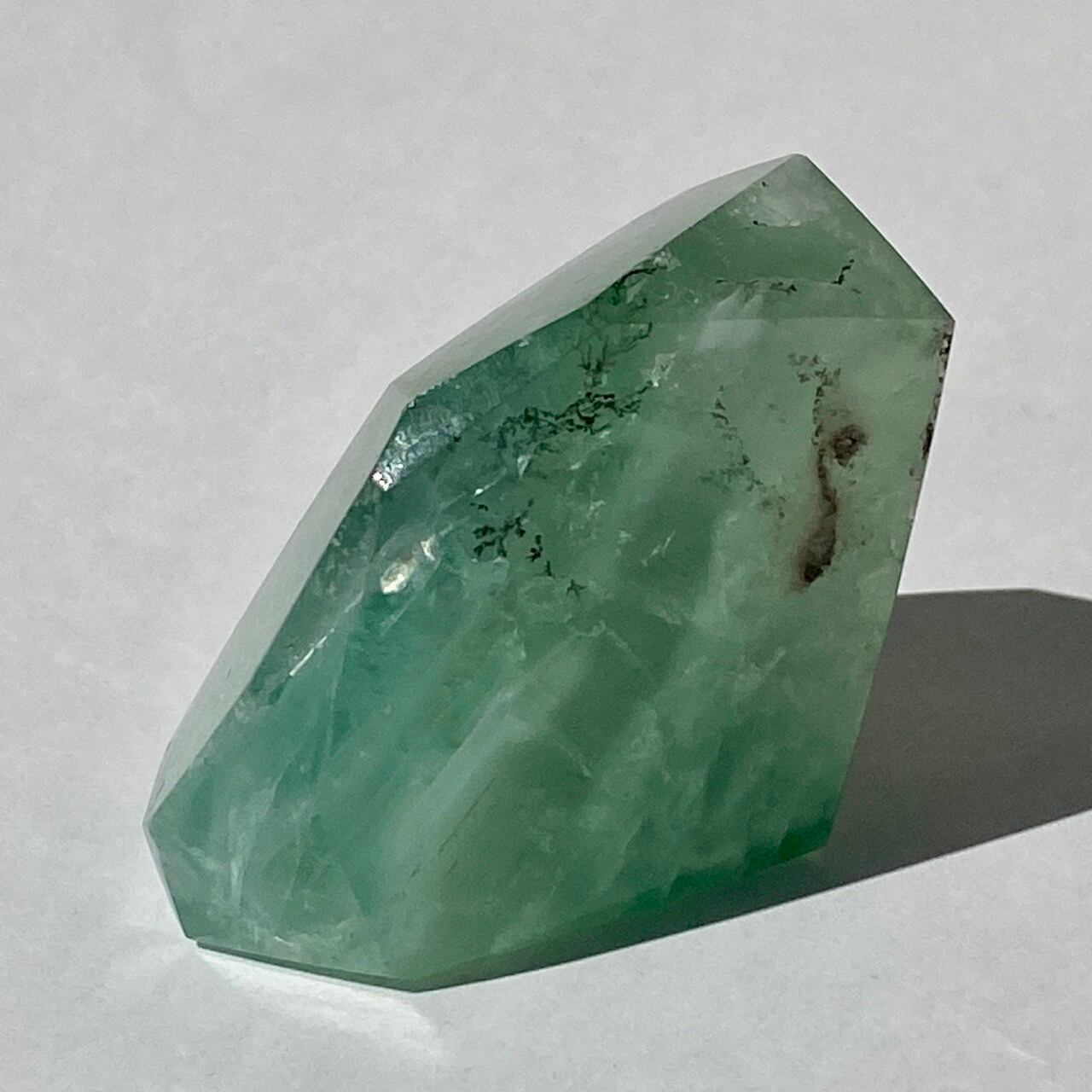 グリーンのフローライトにデンドライト(樹枝状の結晶)のインクルージョンが顔を覗かせています。白濁した部分と透け感がある部分から成り、正面から見ると、丁度透け感のある部分にデンドライトが浮かび上がり、その手前に虹が複数現れる素敵な子です。