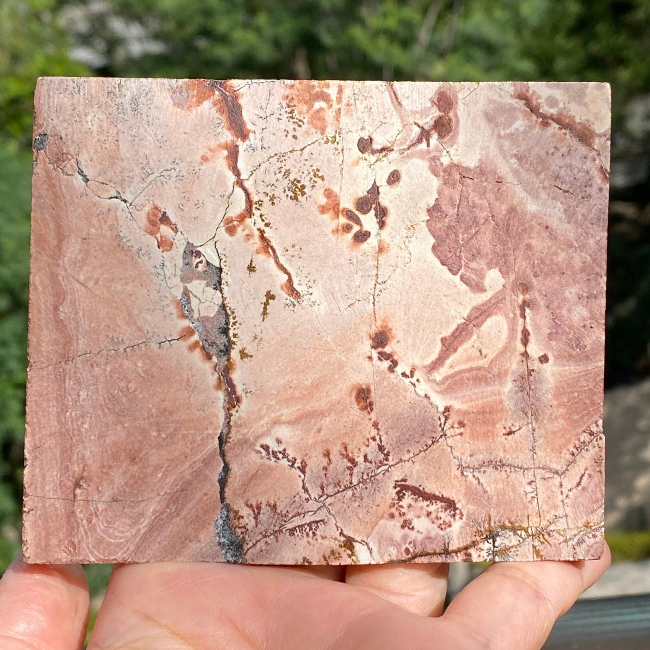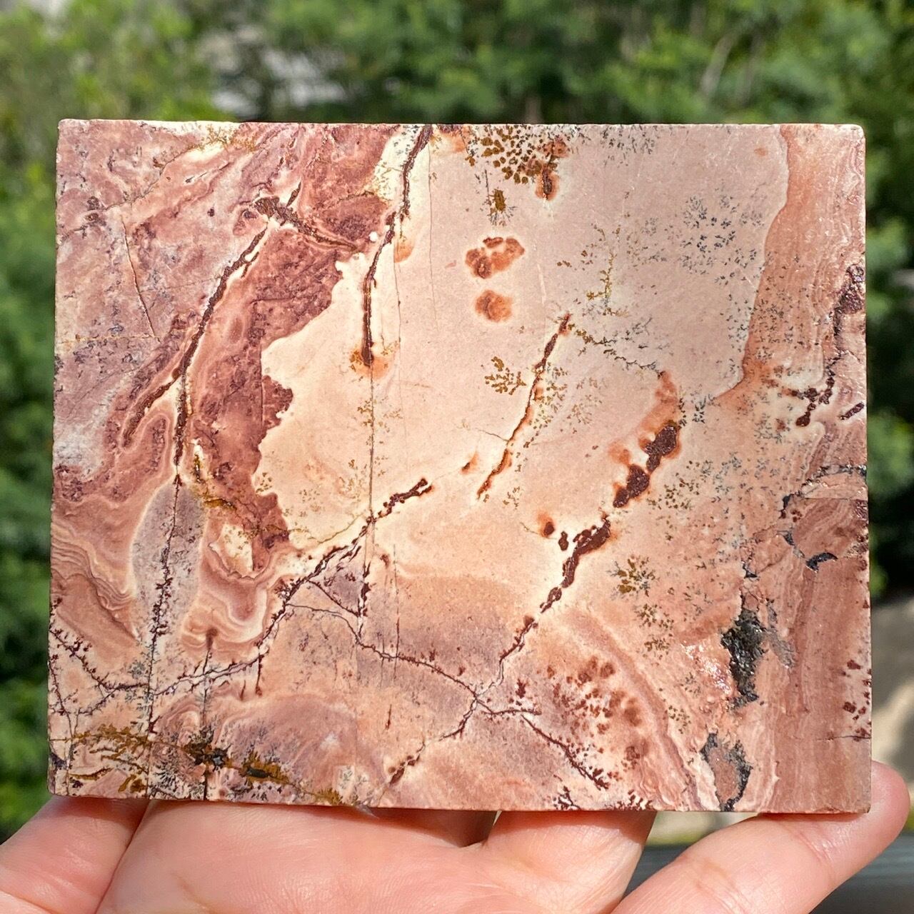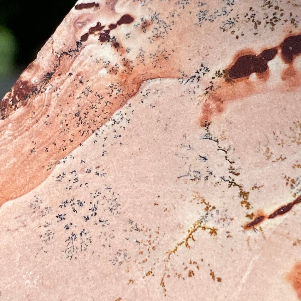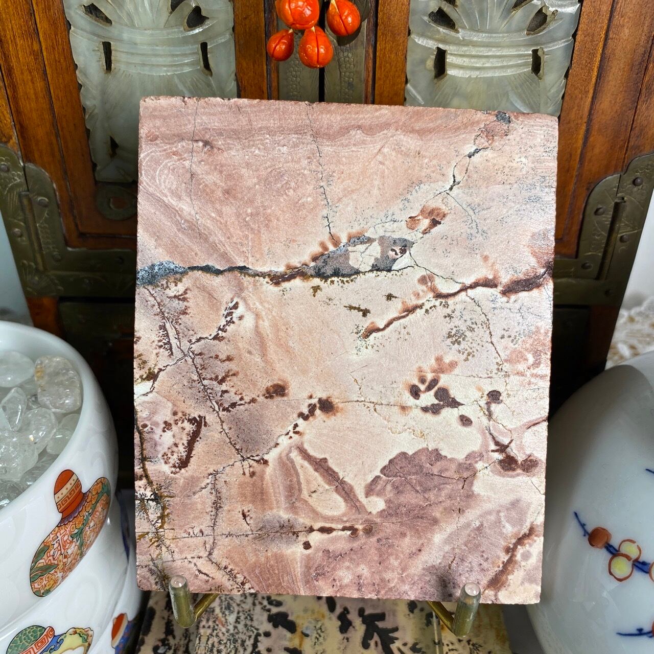 デンドライト入りのピクチャーストーンのスラブです。画像の最初の4枚は片面を回転させて撮影したもので、次の4枚は裏面を回転させたものです。まるで水墨画の様な、風情のある野山の情景が両面楽しめます。これが自然が生み出した芸術画と思うと拍手を送りたくなるようなディテールです。インテリアを彩るアート作品に!