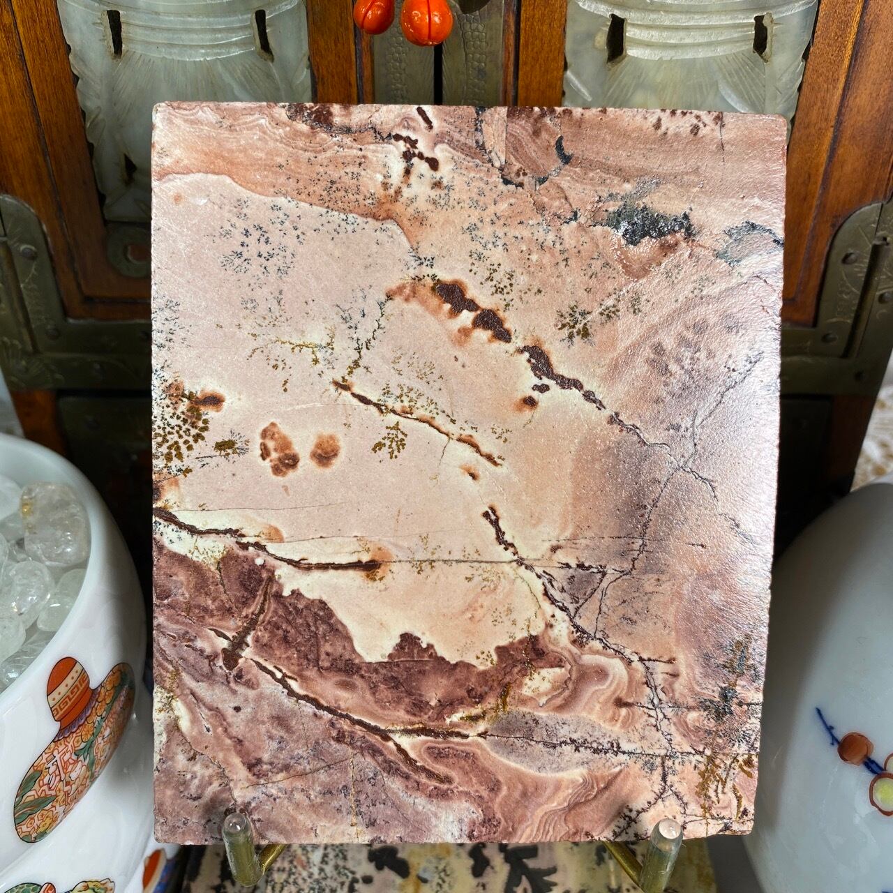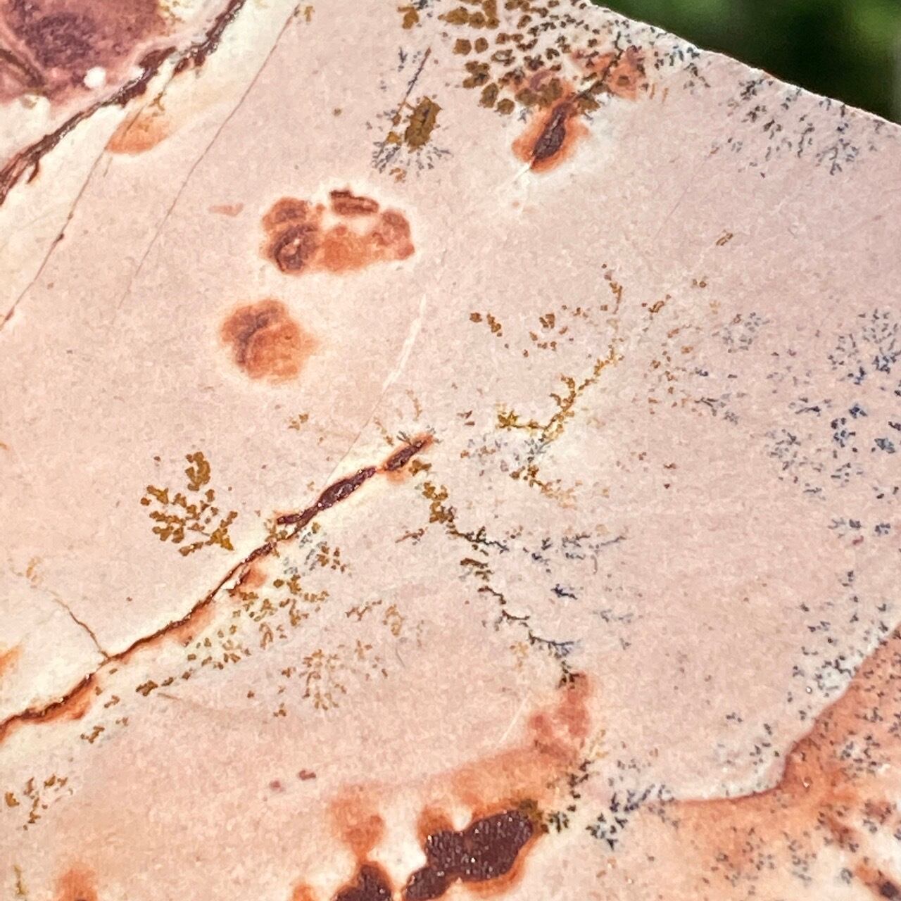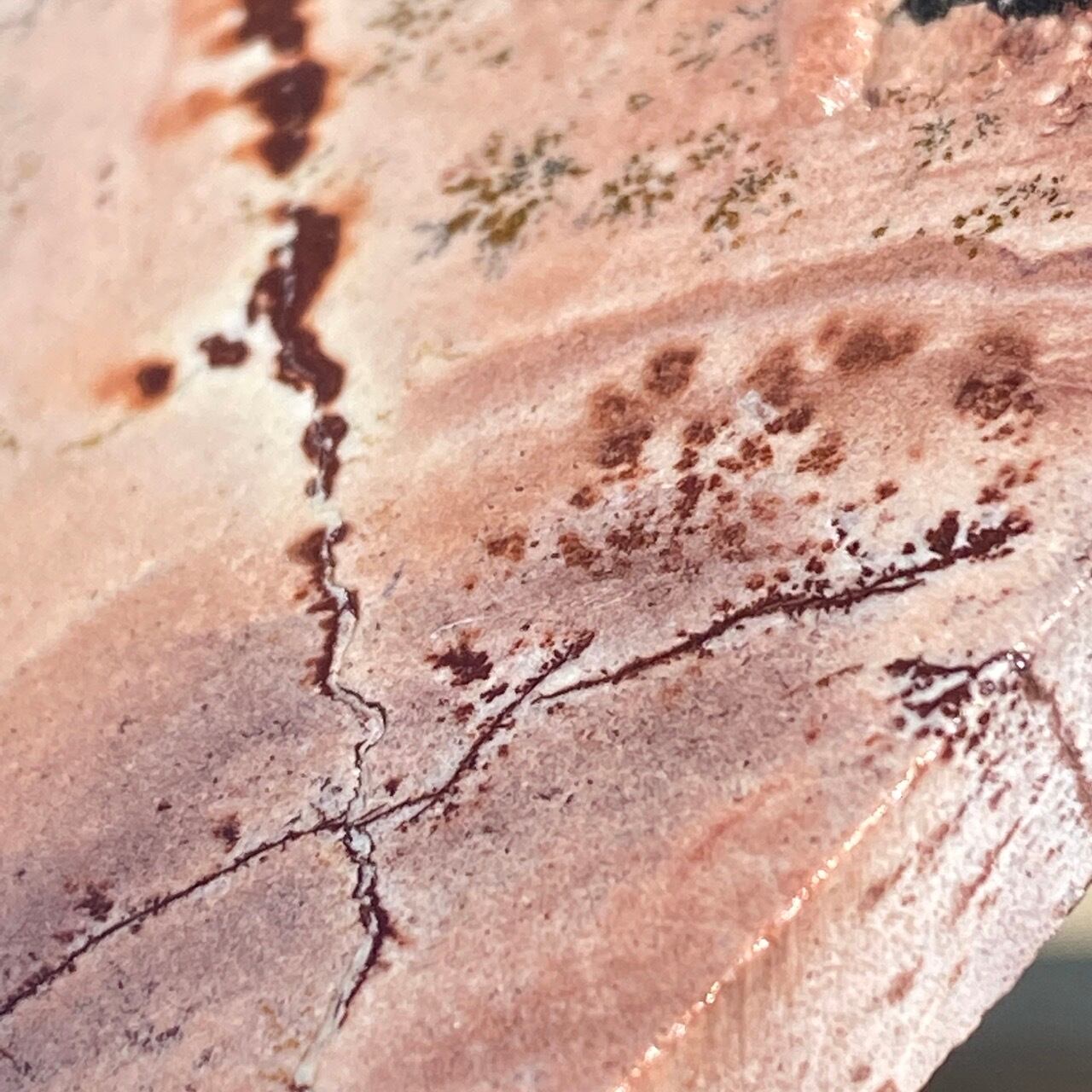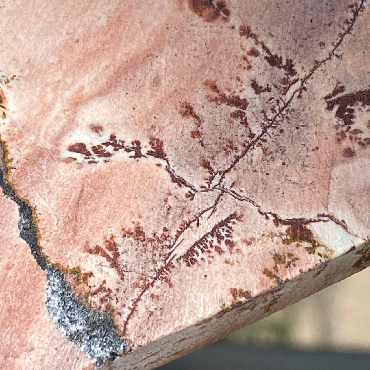デンドライト入りのピクチャーストーンのスラブです。画像の最初の4枚は片面を回転させて撮影したもので、次の4枚は裏面を回転させたものです。まるで水墨画の様な、風情のある野山の情景が両面楽しめます。これが自然が生み出した芸術画と思うと拍手を送りたくなるようなディテールです。インテリアを彩るアート作品に!