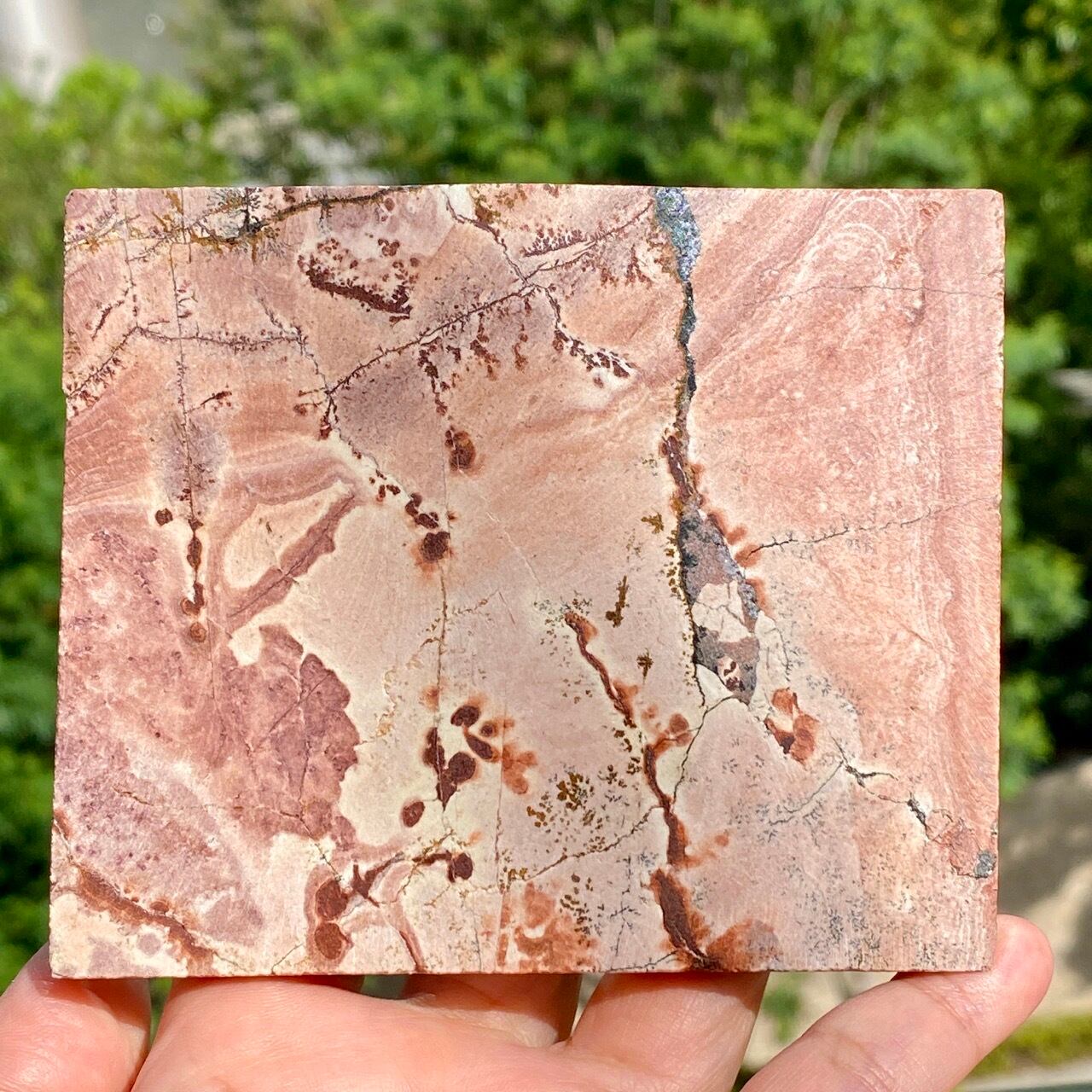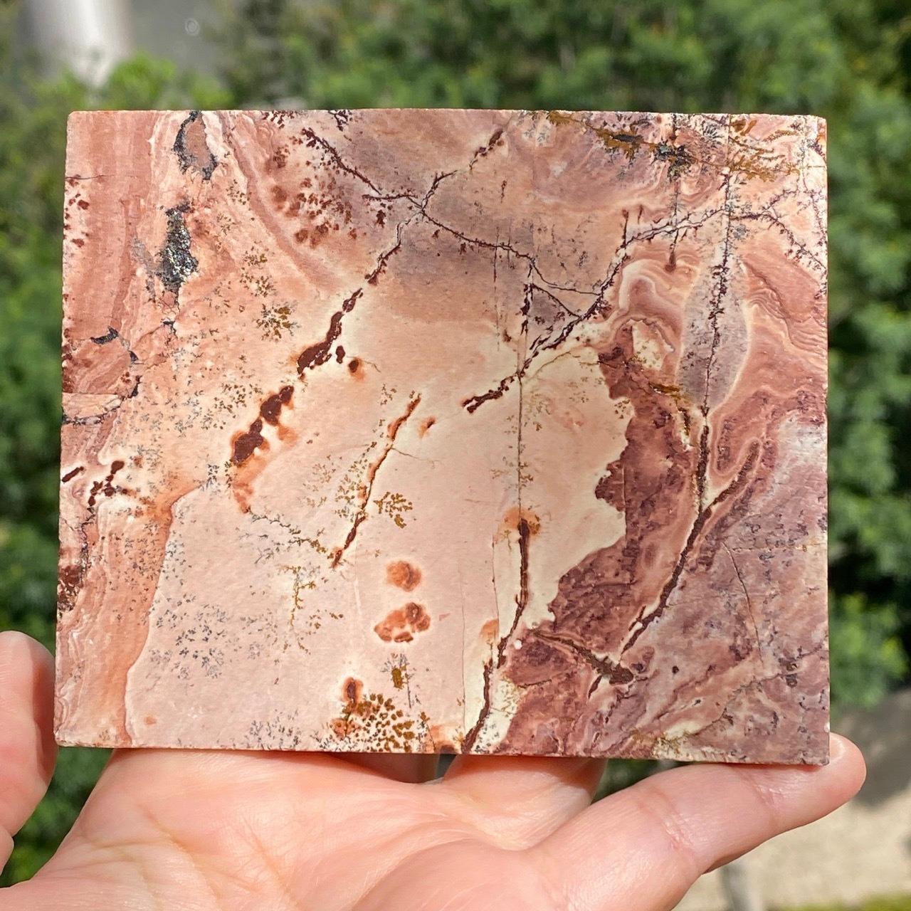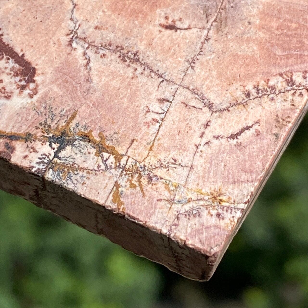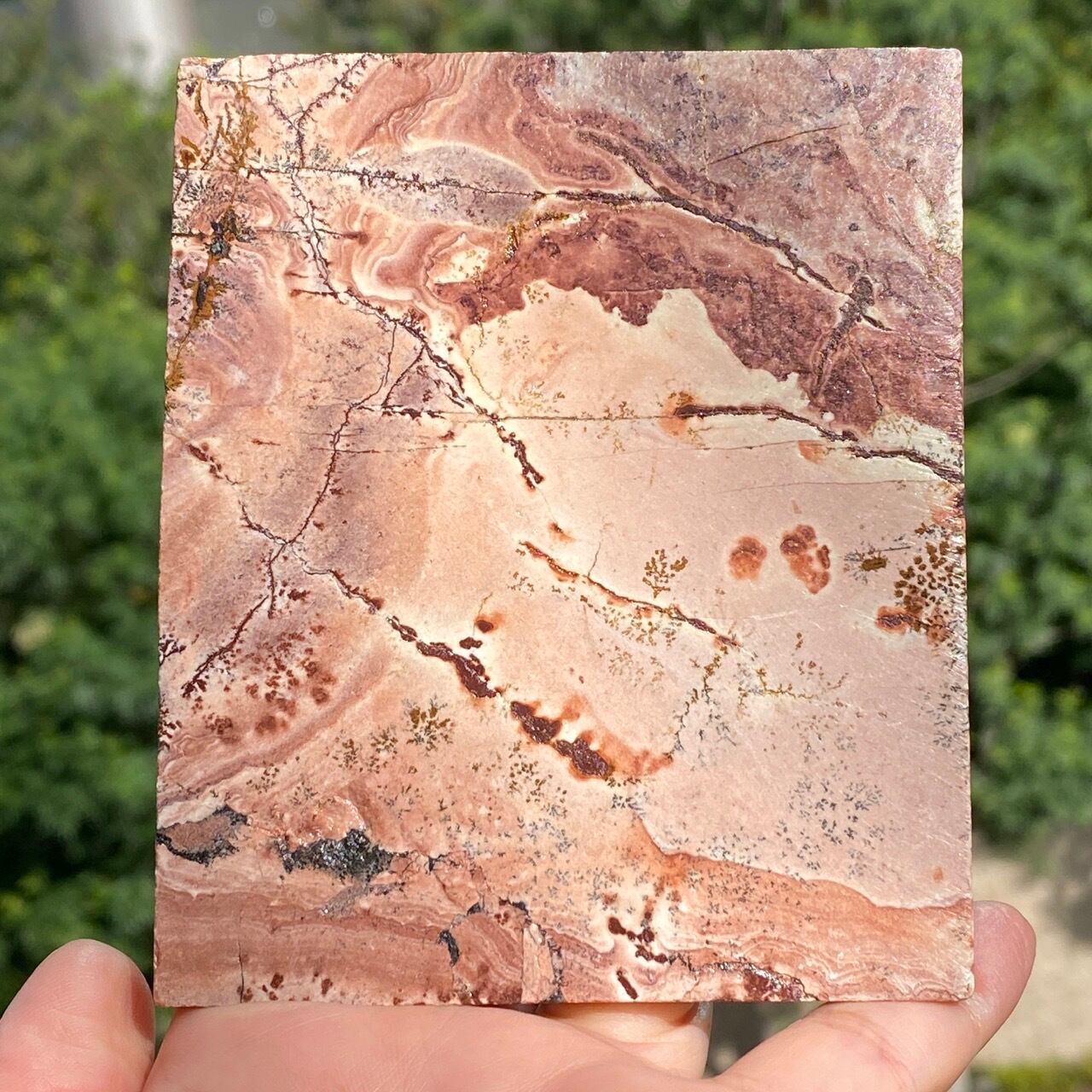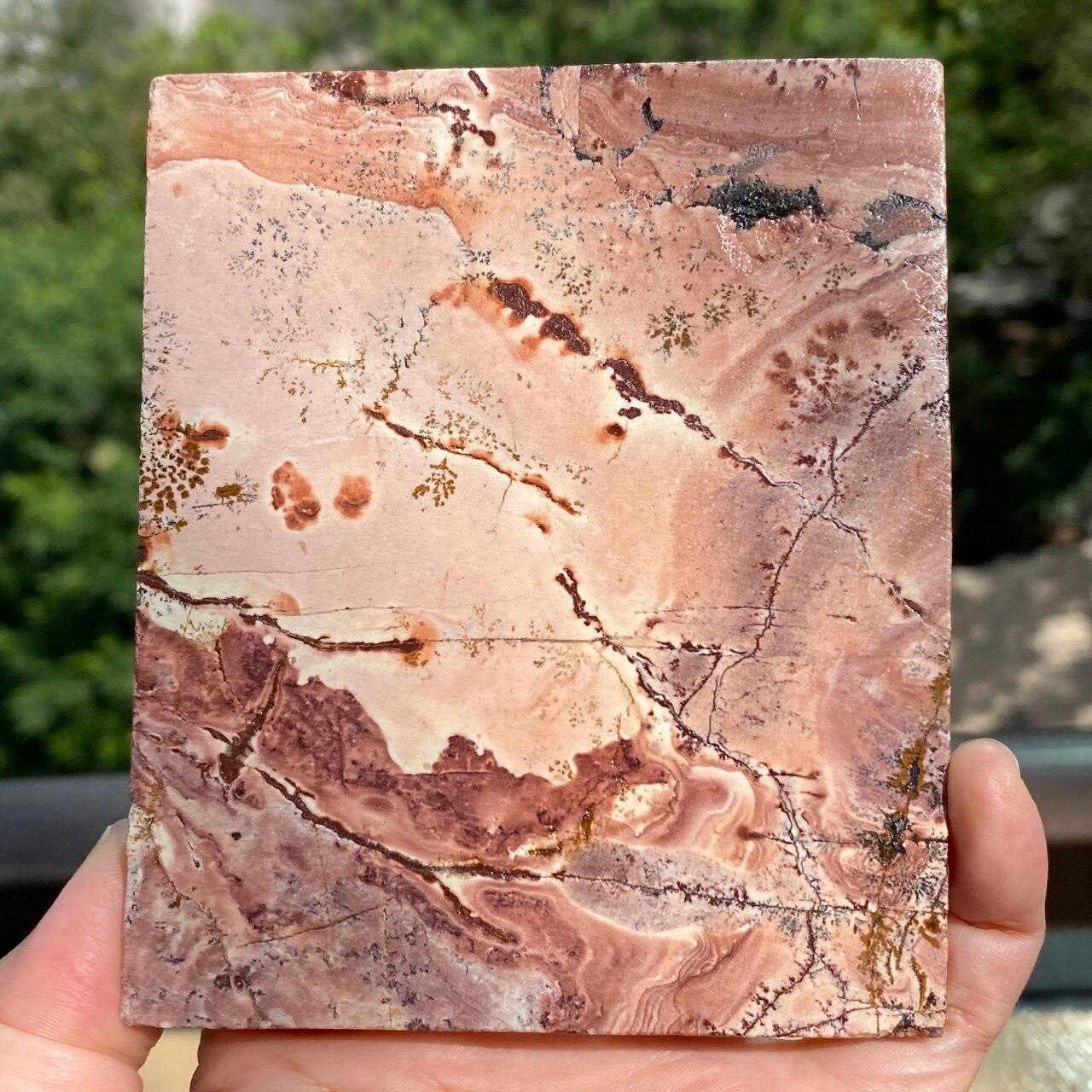デンドライト入りのピクチャーストーンのスラブです。画像の最初の4枚は片面を回転させて撮影したもので、次の4枚は裏面を回転させたものです。まるで水墨画の様な、風情のある野山の情景が両面楽しめます。これが自然が生み出した芸術画と思うと拍手を送りたくなるようなディテールです。インテリアを彩るアート作品に!
