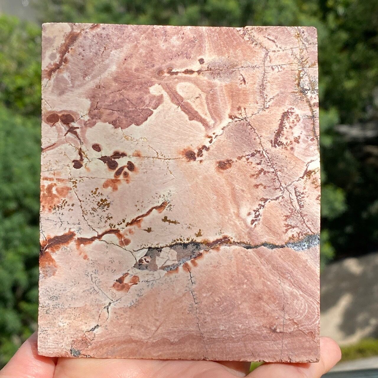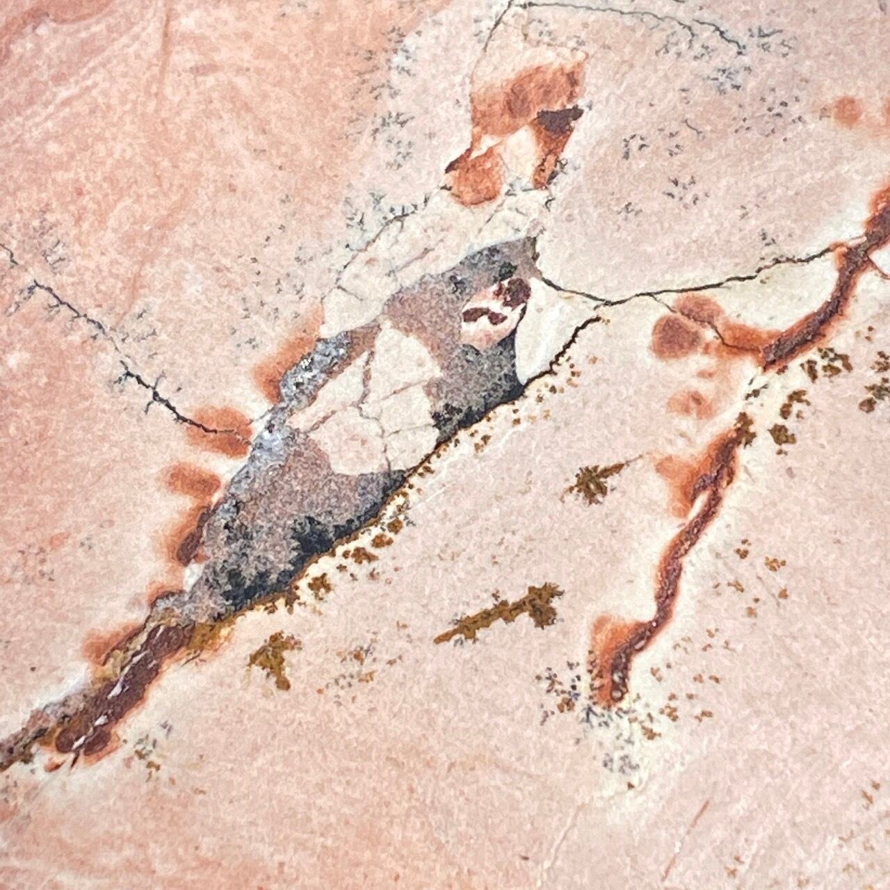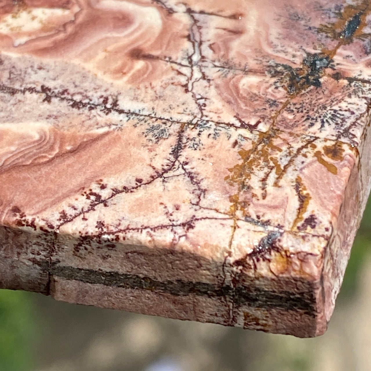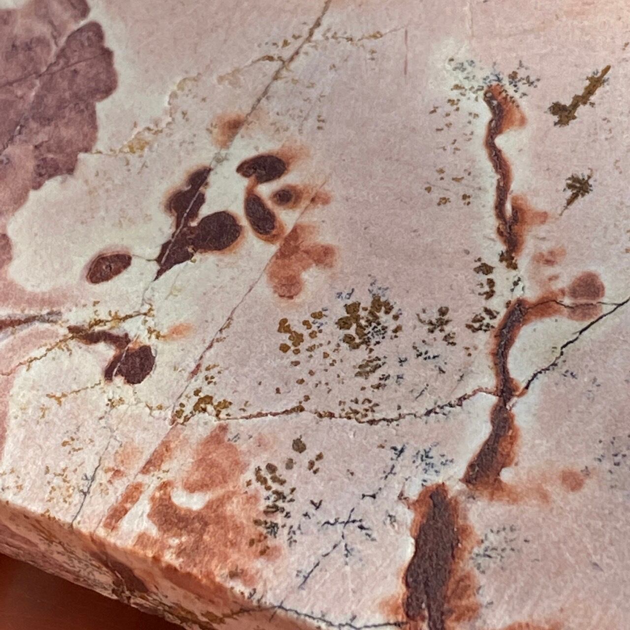 デンドライト入りのピクチャーストーンのスラブです。画像の最初の4枚は片面を回転させて撮影したもので、次の4枚は裏面を回転させたものです。まるで水墨画の様な、風情のある野山の情景が両面楽しめます。これが自然が生み出した芸術画と思うと拍手を送りたくなるようなディテールです。インテリアを彩るアート作品に!
