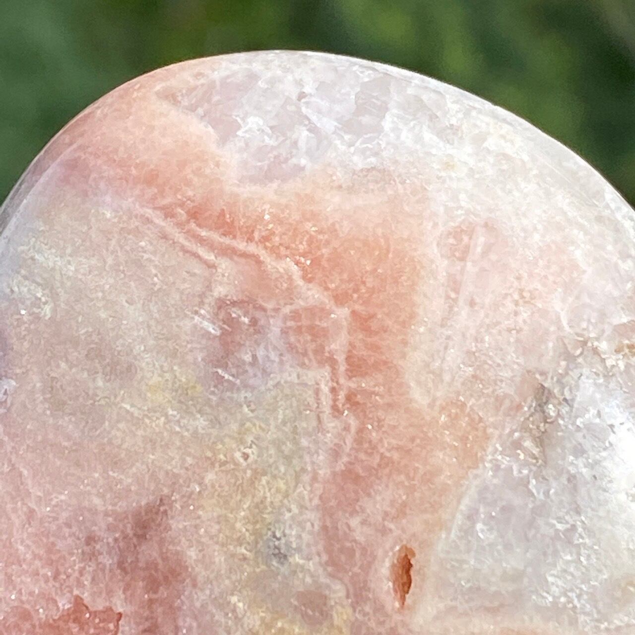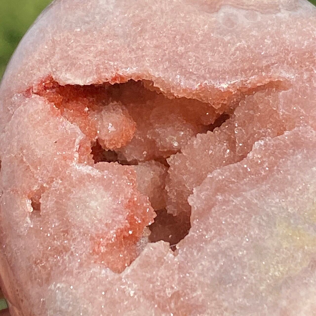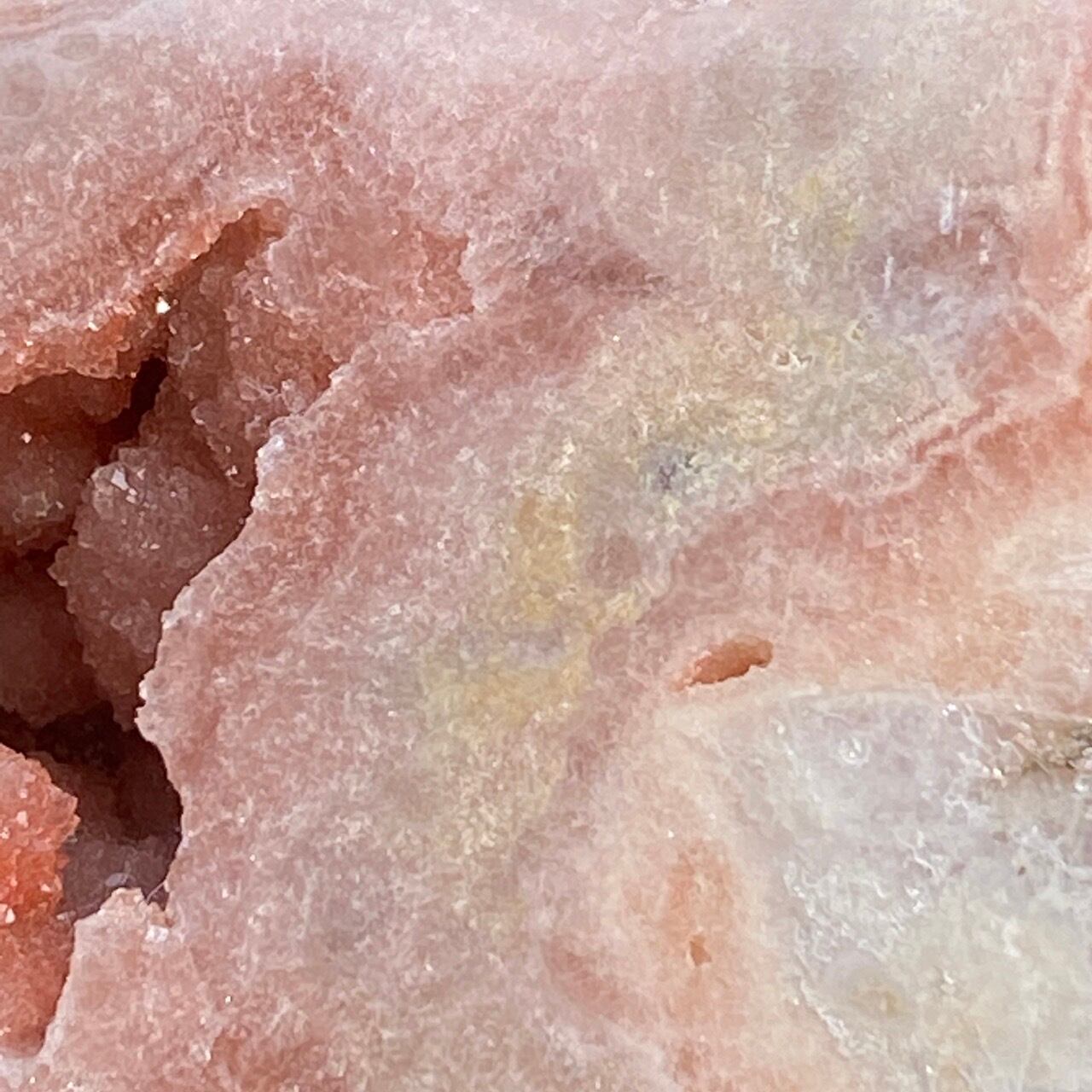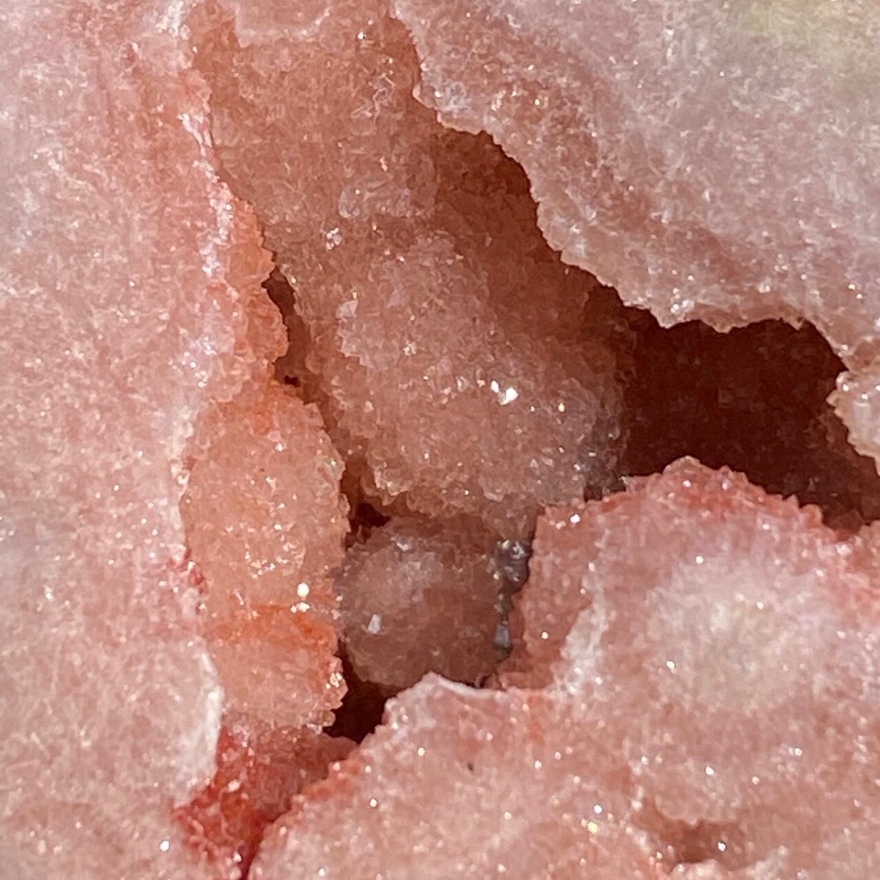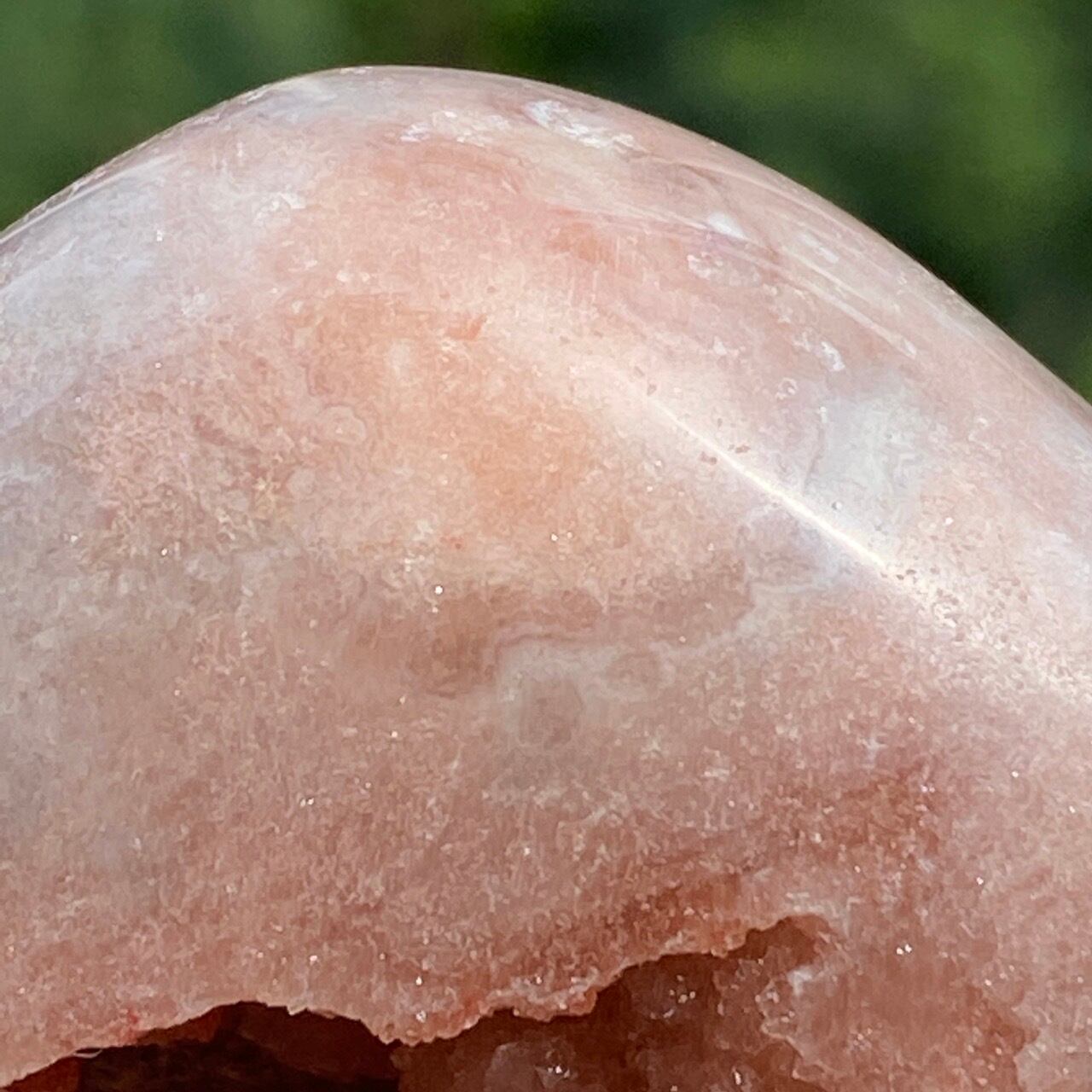 波打つ三角形のポケットからアプリコット系ピンクのころころしたドゥルージーが顔を覗かせている可愛い子です。煌めくドゥルージーと表面に浮き出たアプリコットの蜜の様な粒子、そして片側のサイドに見られるクォーツの組み合わせがとても美しい子です。厚みや重量もあるので、存在感があります。