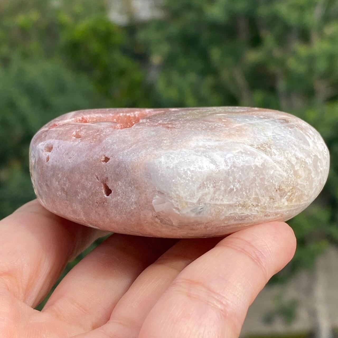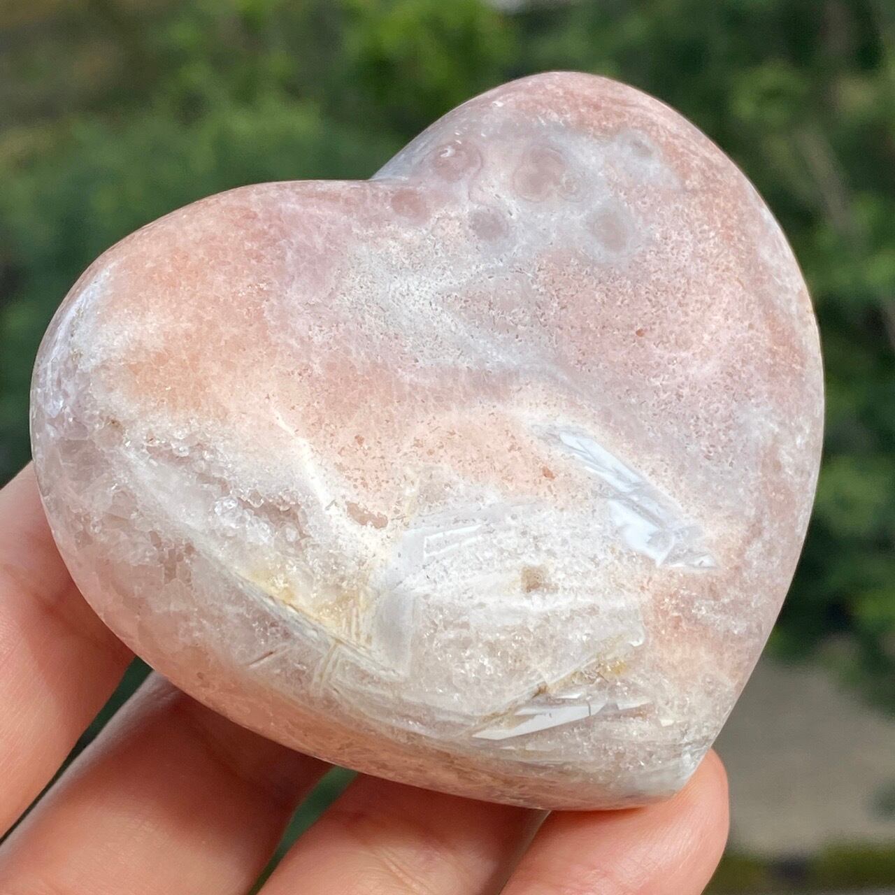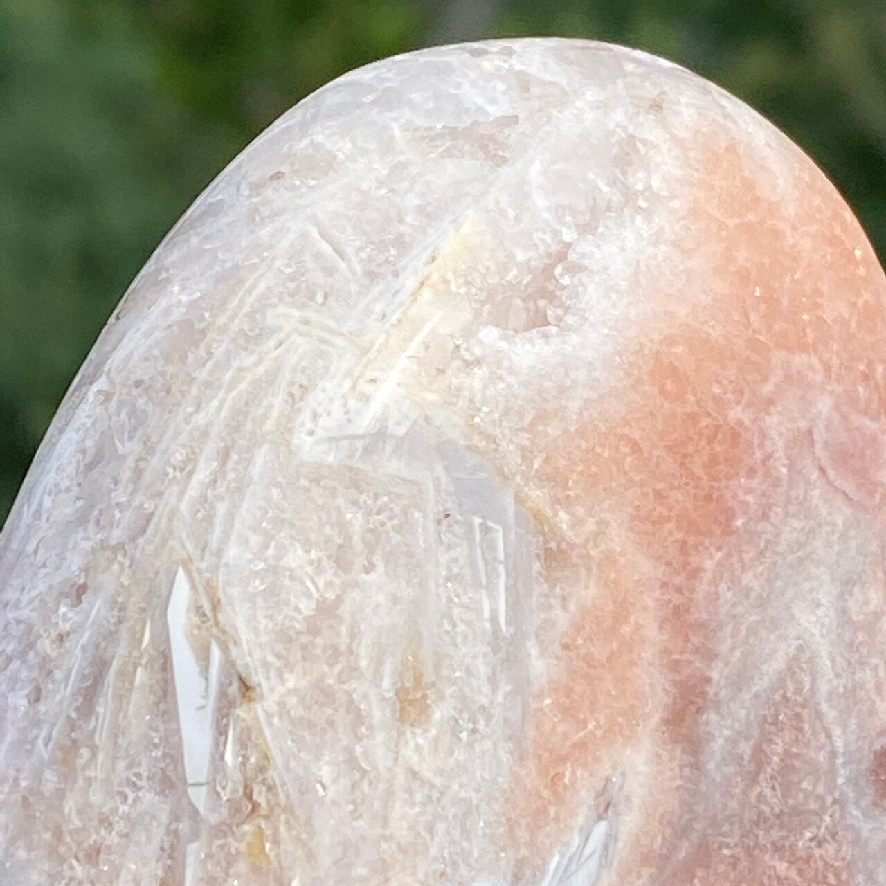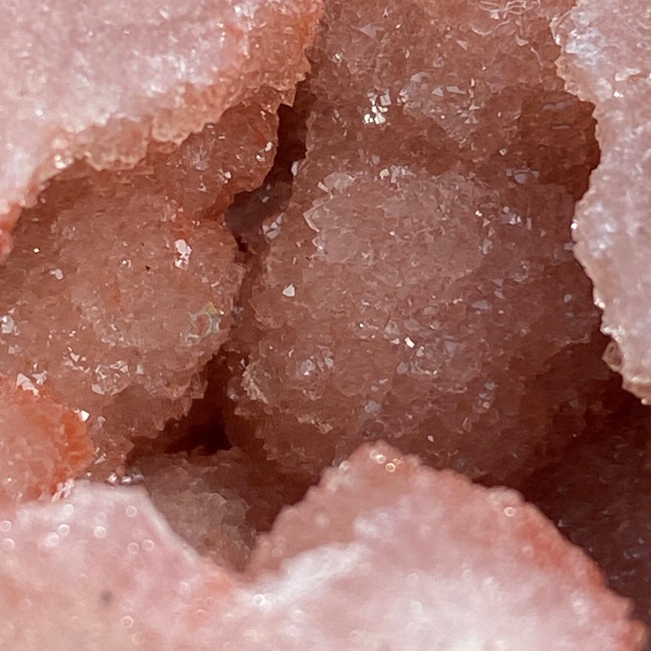 波打つ三角形のポケットからアプリコット系ピンクのころころしたドゥルージーが顔を覗かせている可愛い子です。煌めくドゥルージーと表面に浮き出たアプリコットの蜜の様な粒子、そして片側のサイドに見られるクォーツの組み合わせがとても美しい子です。厚みや重量もあるので、存在感があります。