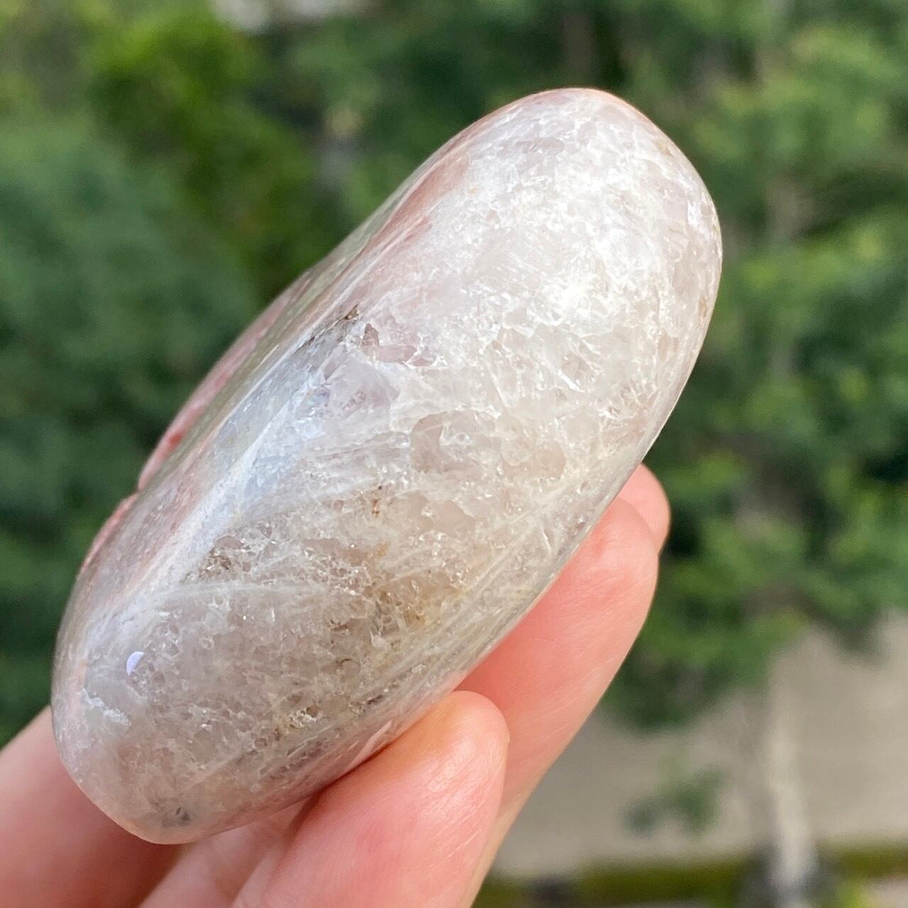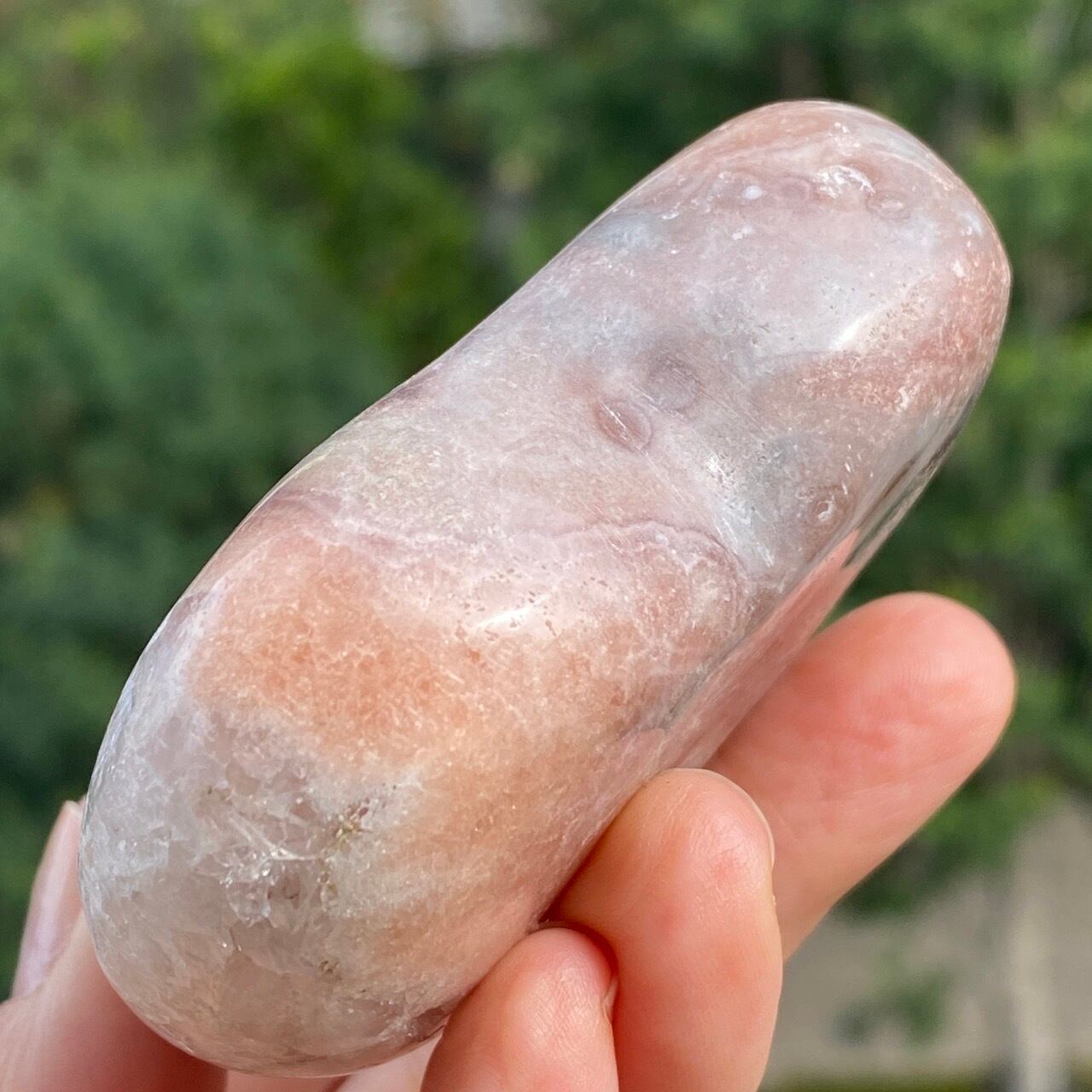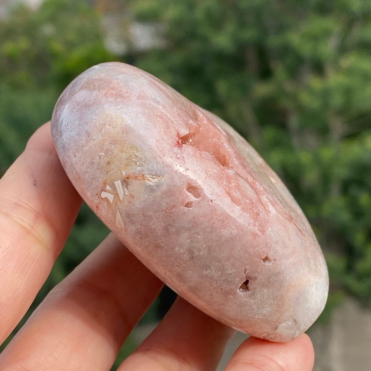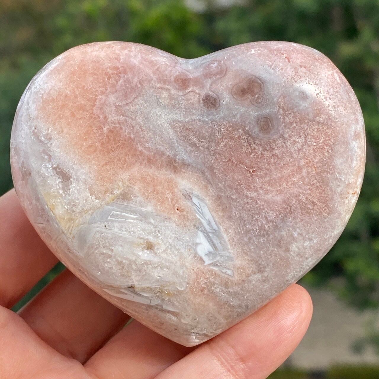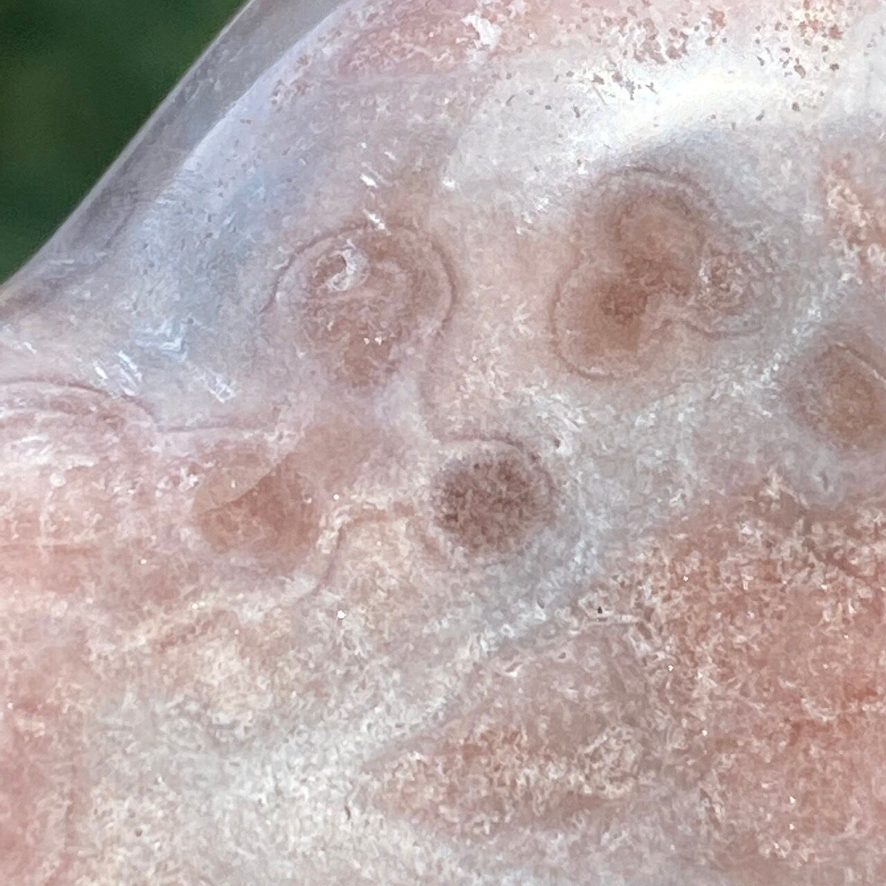 波打つ三角形のポケットからアプリコット系ピンクのころころしたドゥルージーが顔を覗かせている可愛い子です。煌めくドゥルージーと表面に浮き出たアプリコットの蜜の様な粒子、そして片側のサイドに見られるクォーツの組み合わせがとても美しい子です。厚みや重量もあるので、存在感があります。