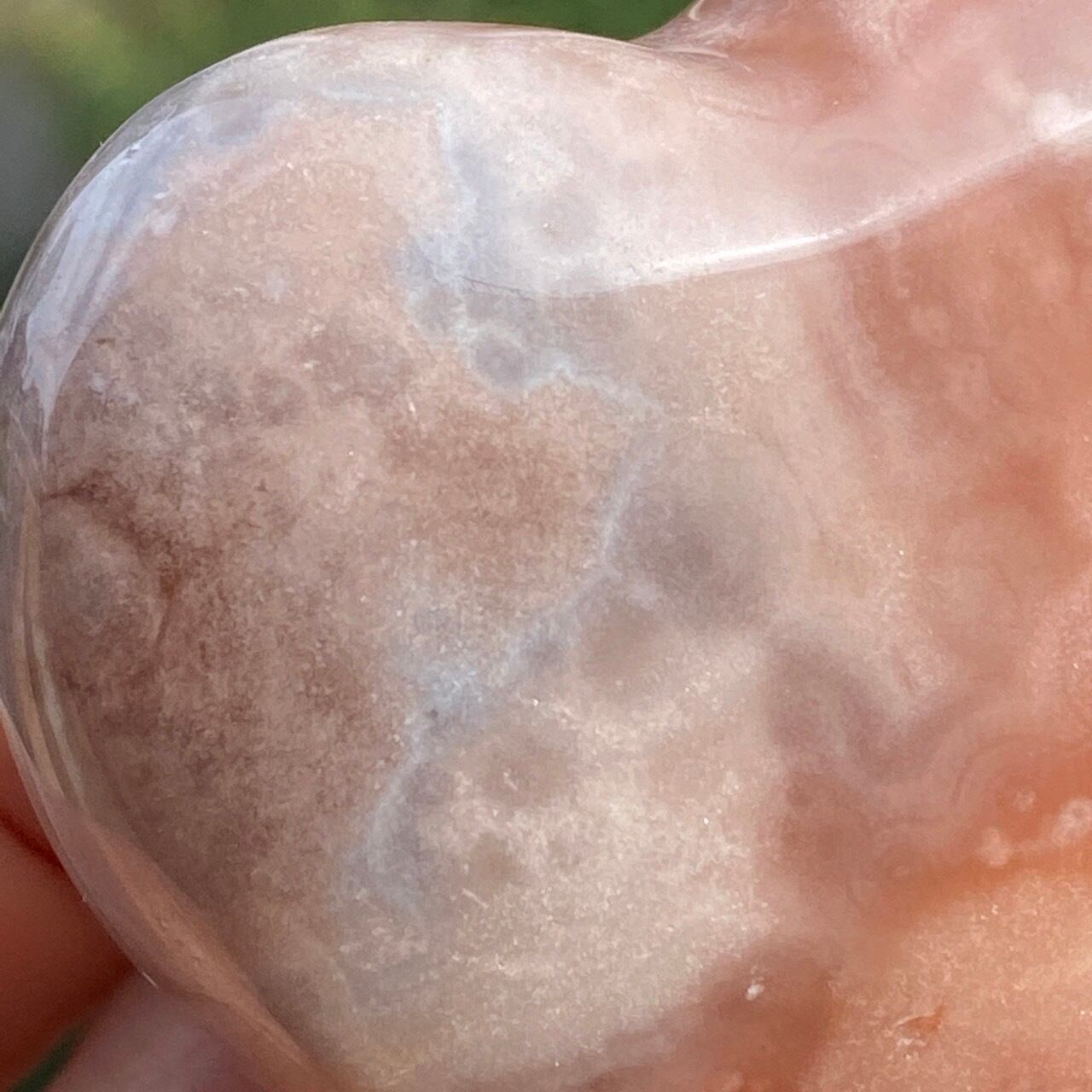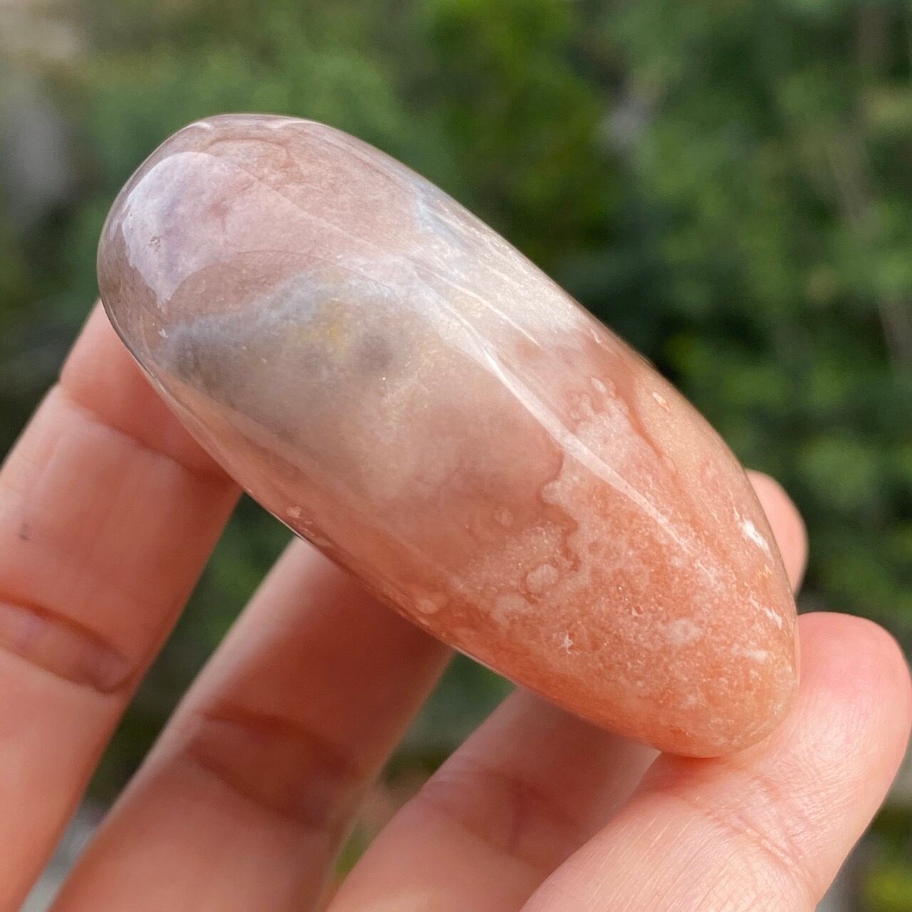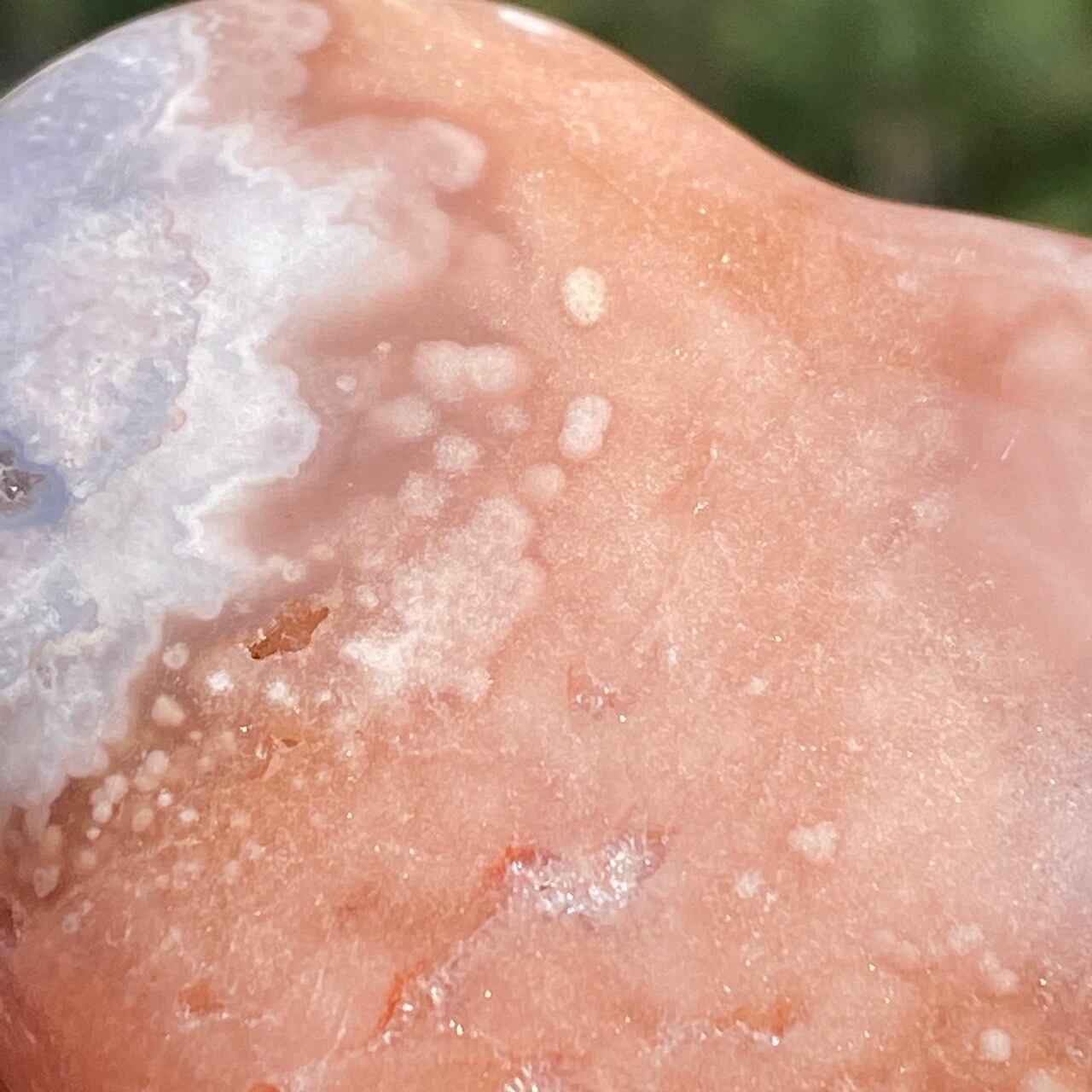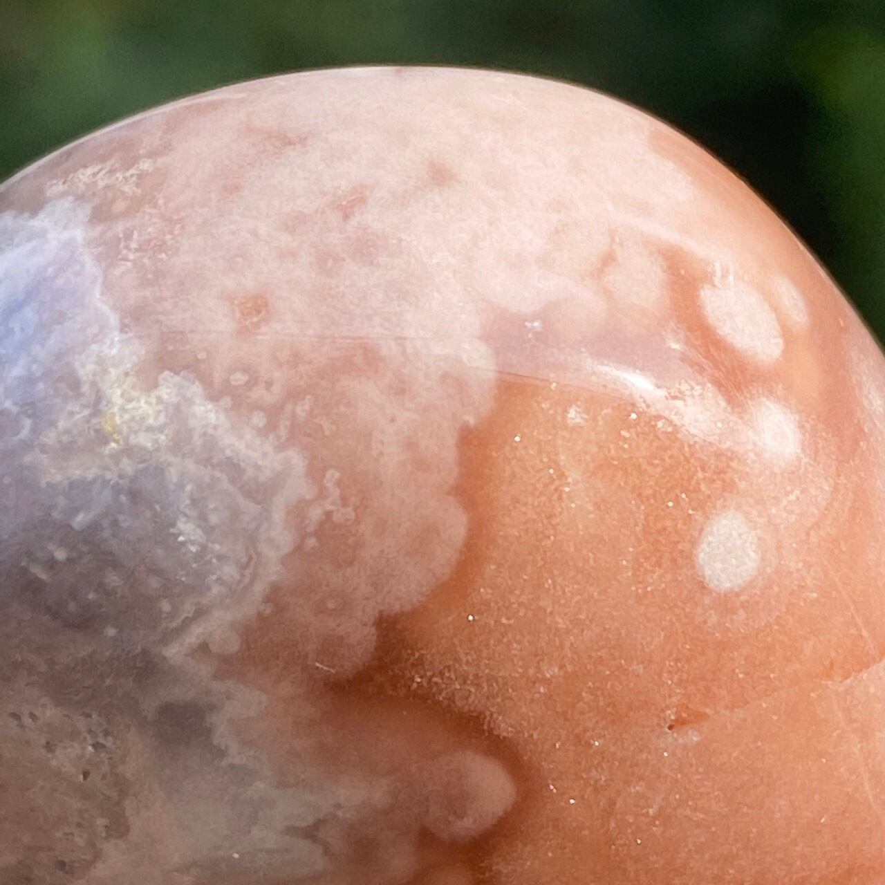 アプリコット系の濃淡に加え、淡いピンク、そしてミルキーな藤色の差し色のコンビネーションが素敵な子です。上部に小さなポケットがあり、その周りにアゲート特有のバンディング(帯状の模様)が見られます。前面は淡いピンクのオーブが可愛らしく、裏面は抽象画の様で、両面ともアプリコット系の色味がとろけ出しそうな蜜を思わせます。