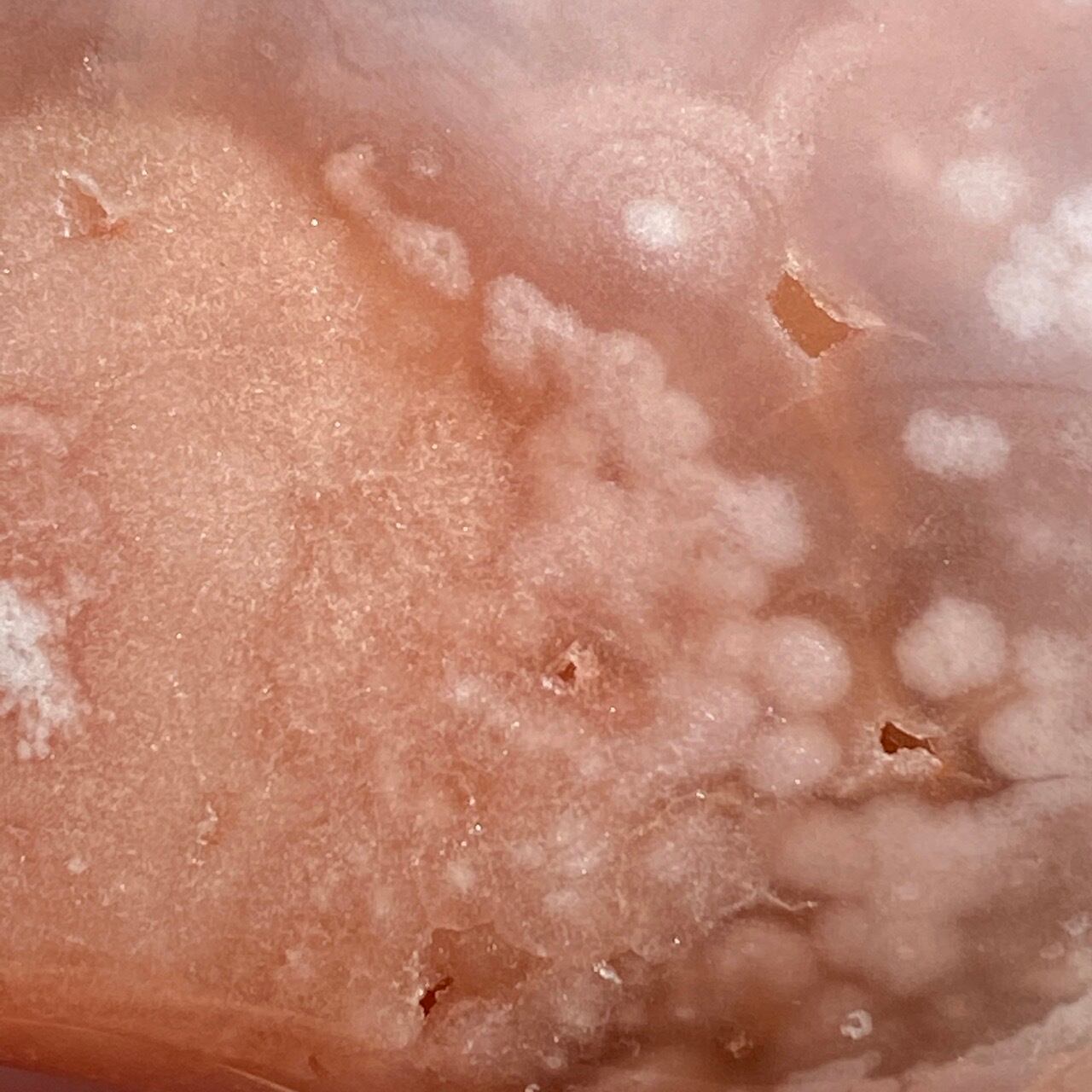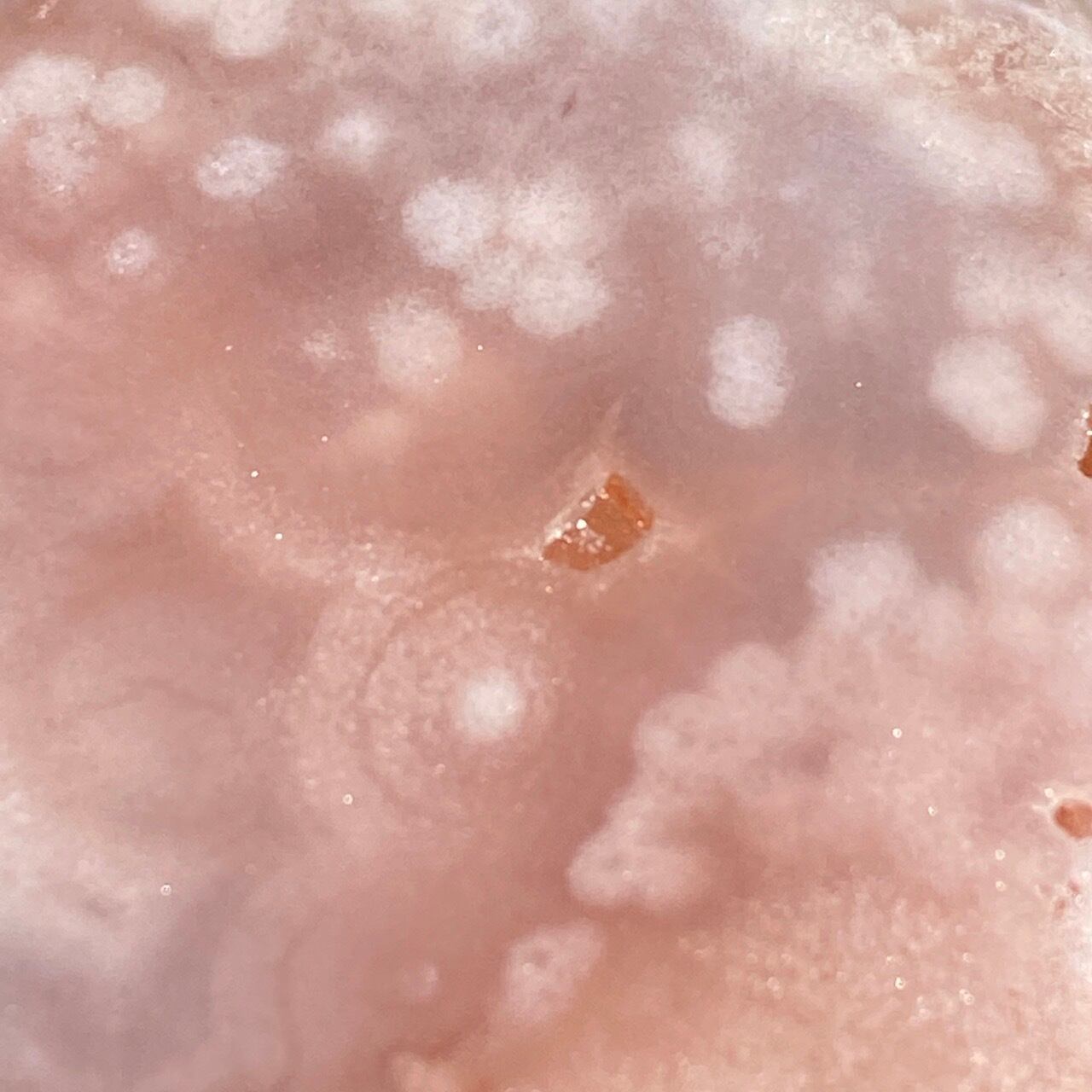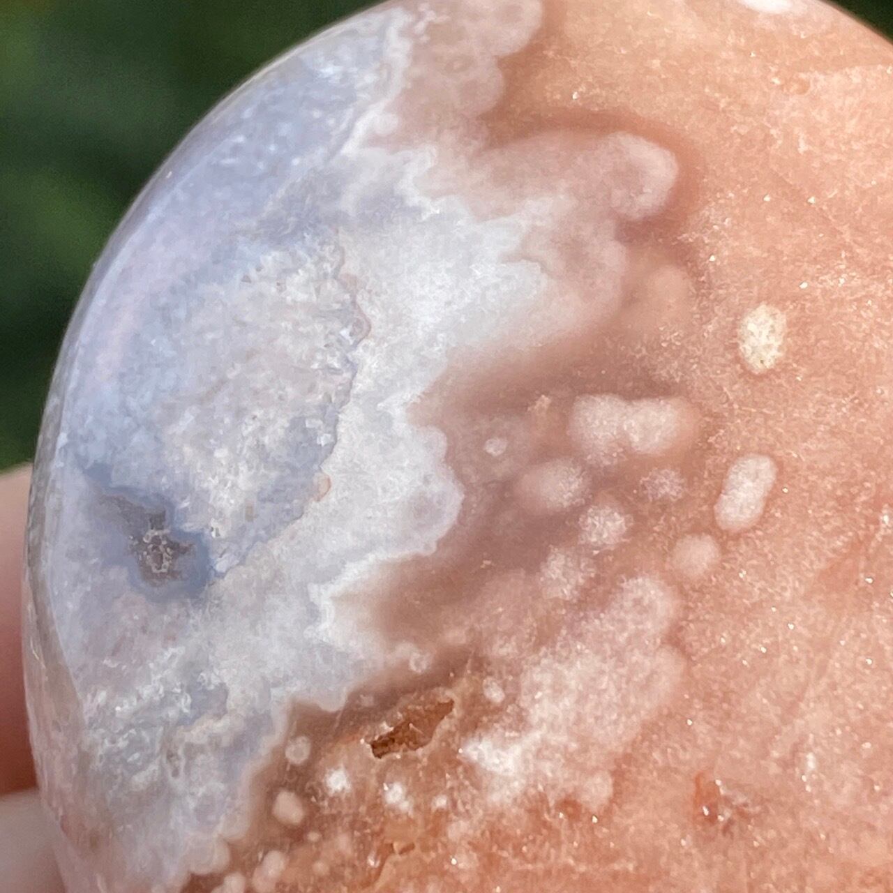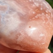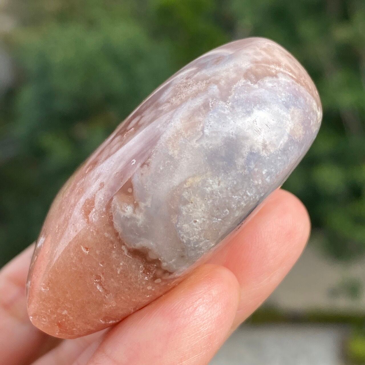 アプリコット系の濃淡に加え、淡いピンク、そしてミルキーな藤色の差し色のコンビネーションが素敵な子です。上部に小さなポケットがあり、その周りにアゲート特有のバンディング(帯状の模様)が見られます。前面は淡いピンクのオーブが可愛らしく、裏面は抽象画の様で、両面ともアプリコット系の色味がとろけ出しそうな蜜を思わせます。