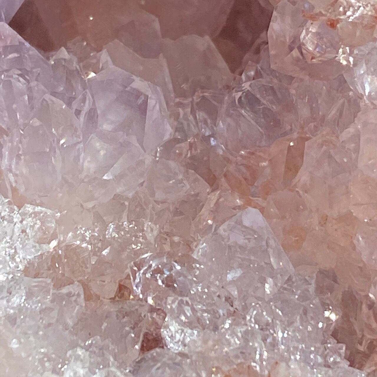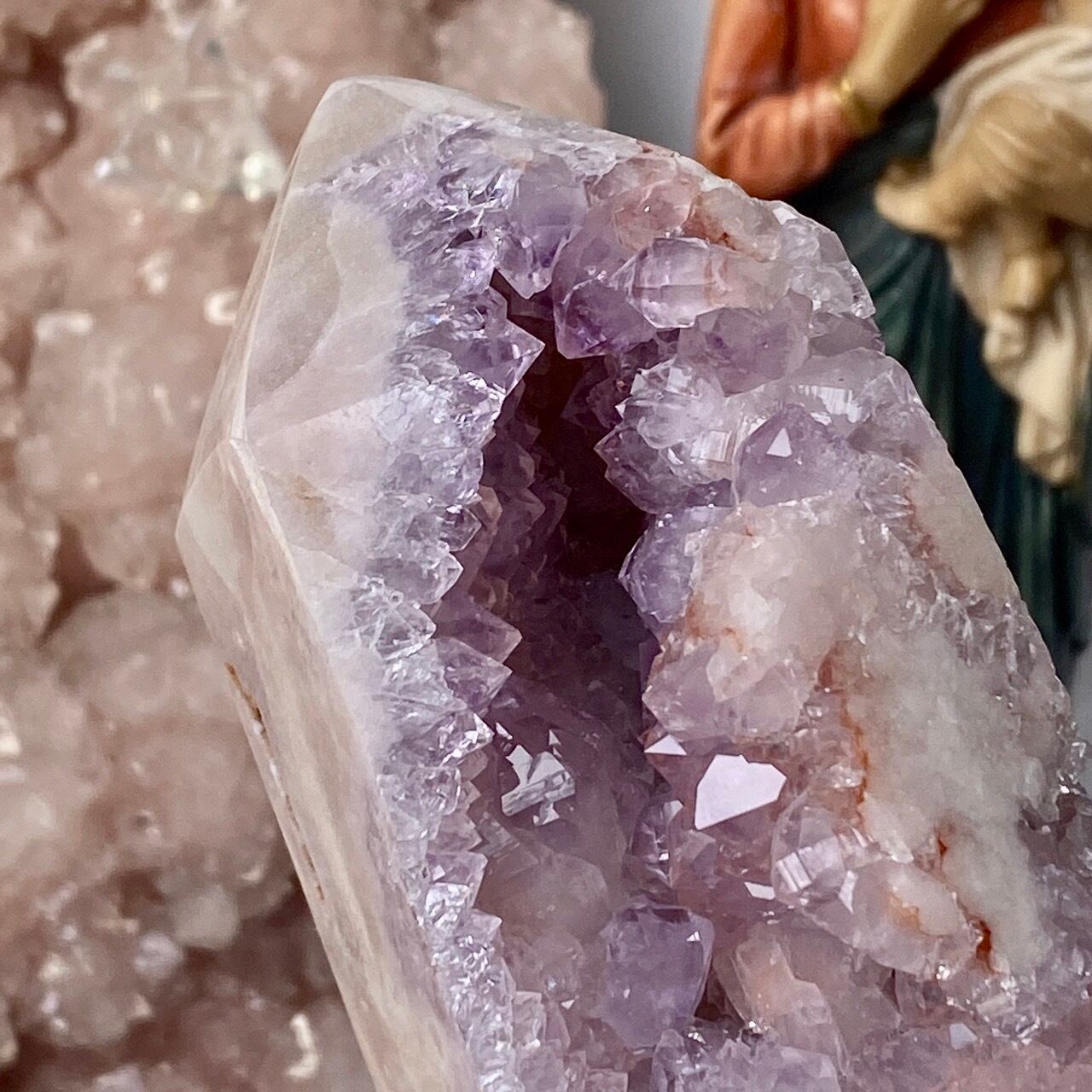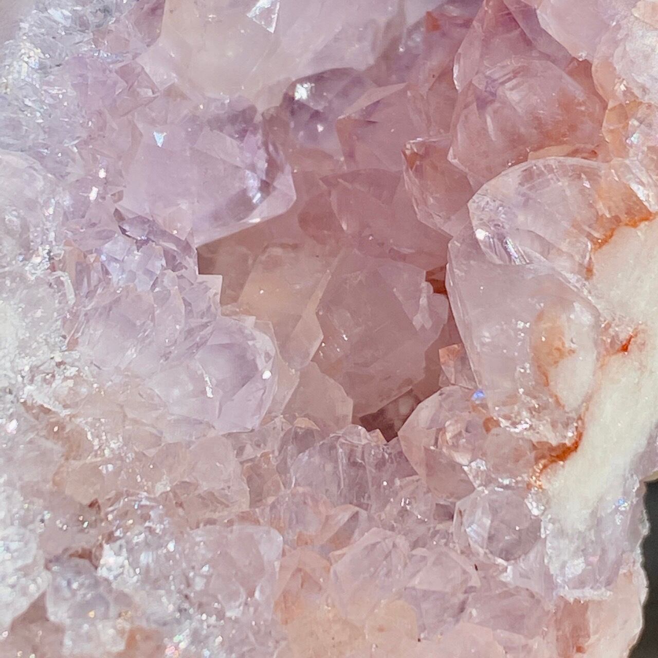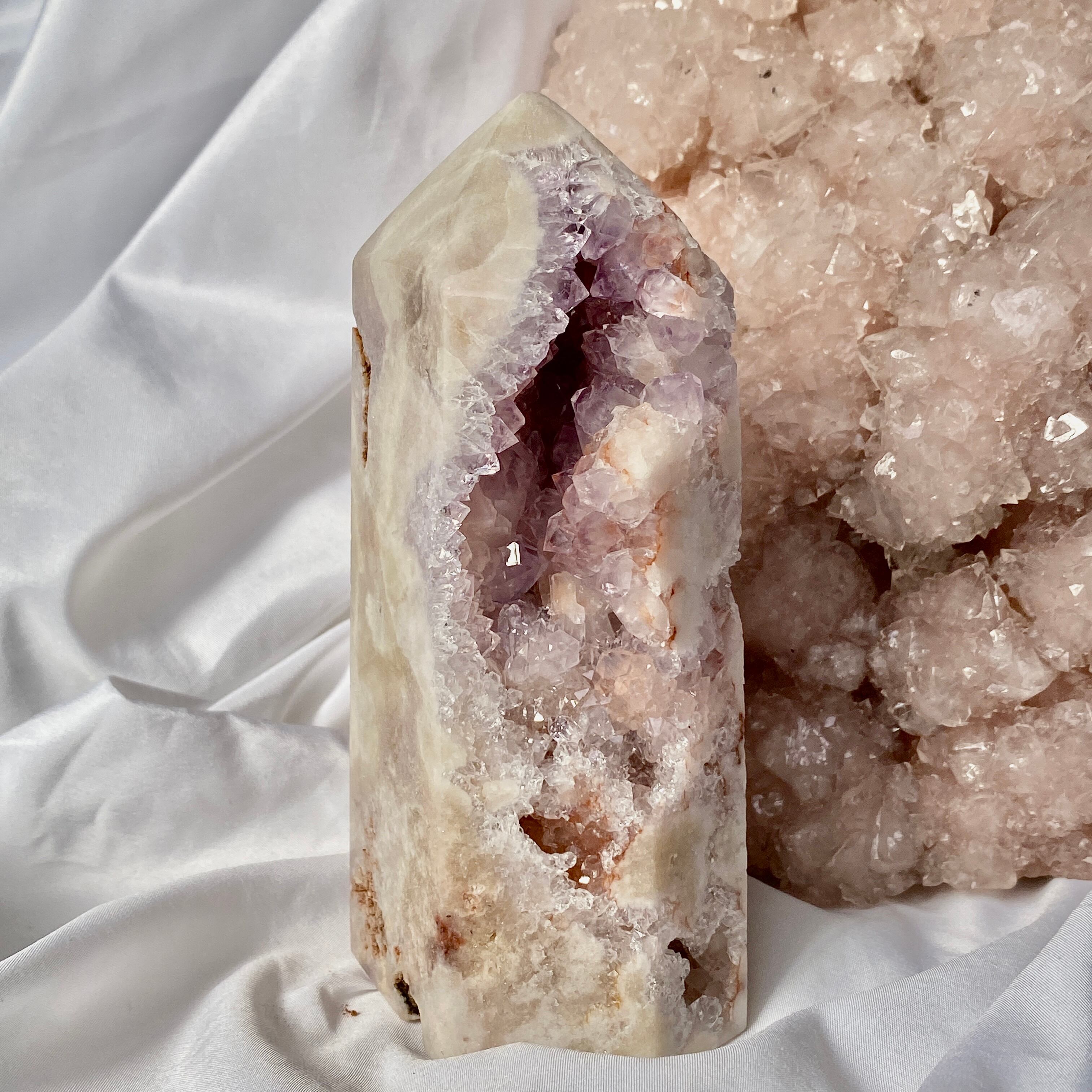 ゴ、ゴ、ゴージャスなドゥルージー!動画や写真を撮影していた際に、あまりに神がかった美しさに心拍数が急上昇した子です。パープルとピンク、そして若干カーネリアン系の色味が加わった見事で可憐なカラーコンビネーションのドゥルージーはスパイキーなだけで無く、お花の様な形状のクラスターが見られたり、また透明感も抜群です。ベースは若干黄身がかったアイボリー(エクリュ)系の色味で、インテリアに馴染みます。