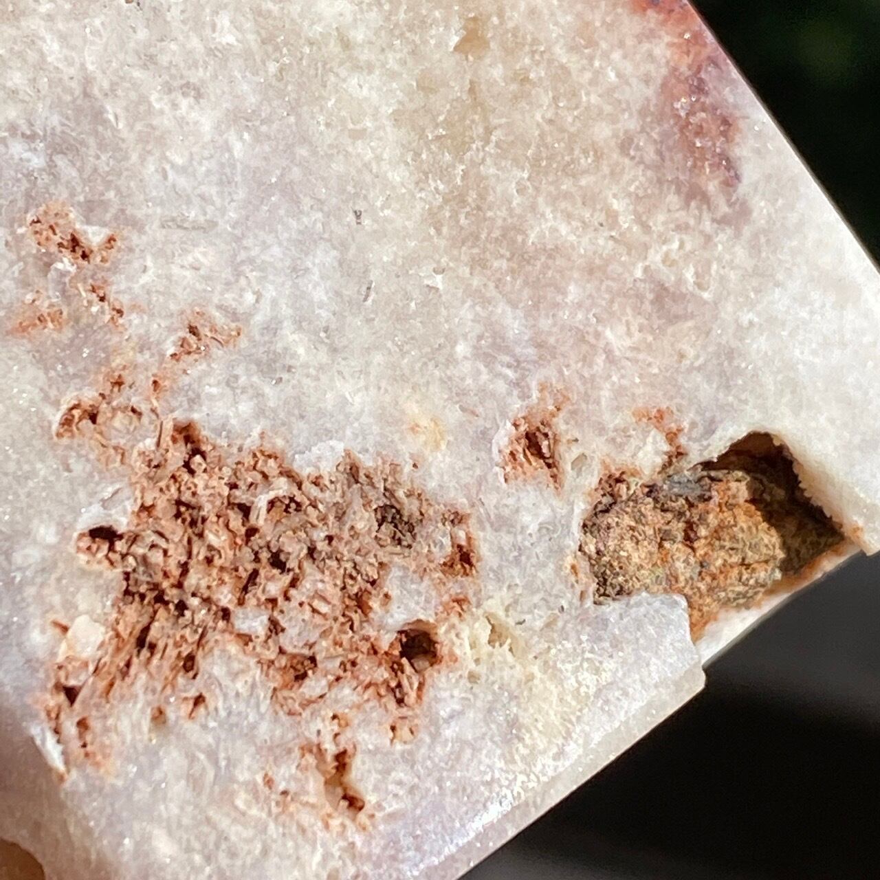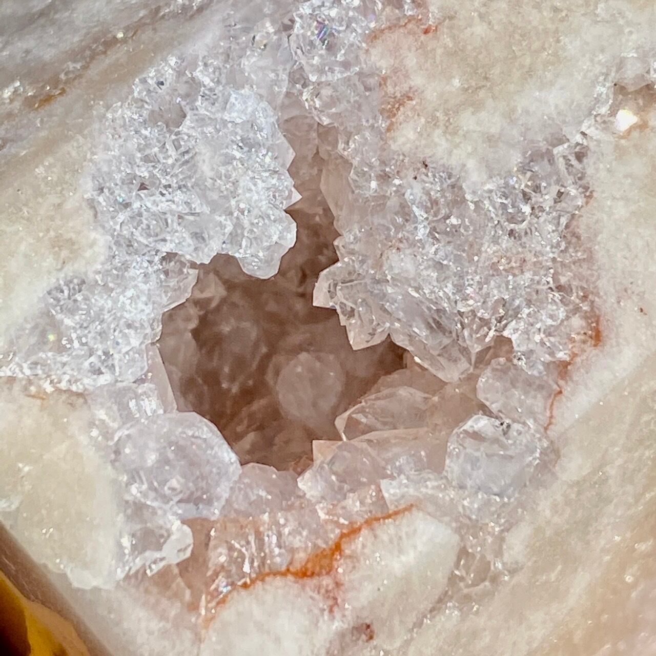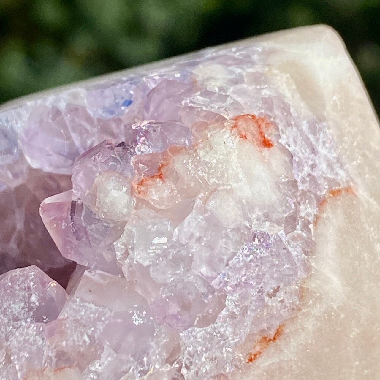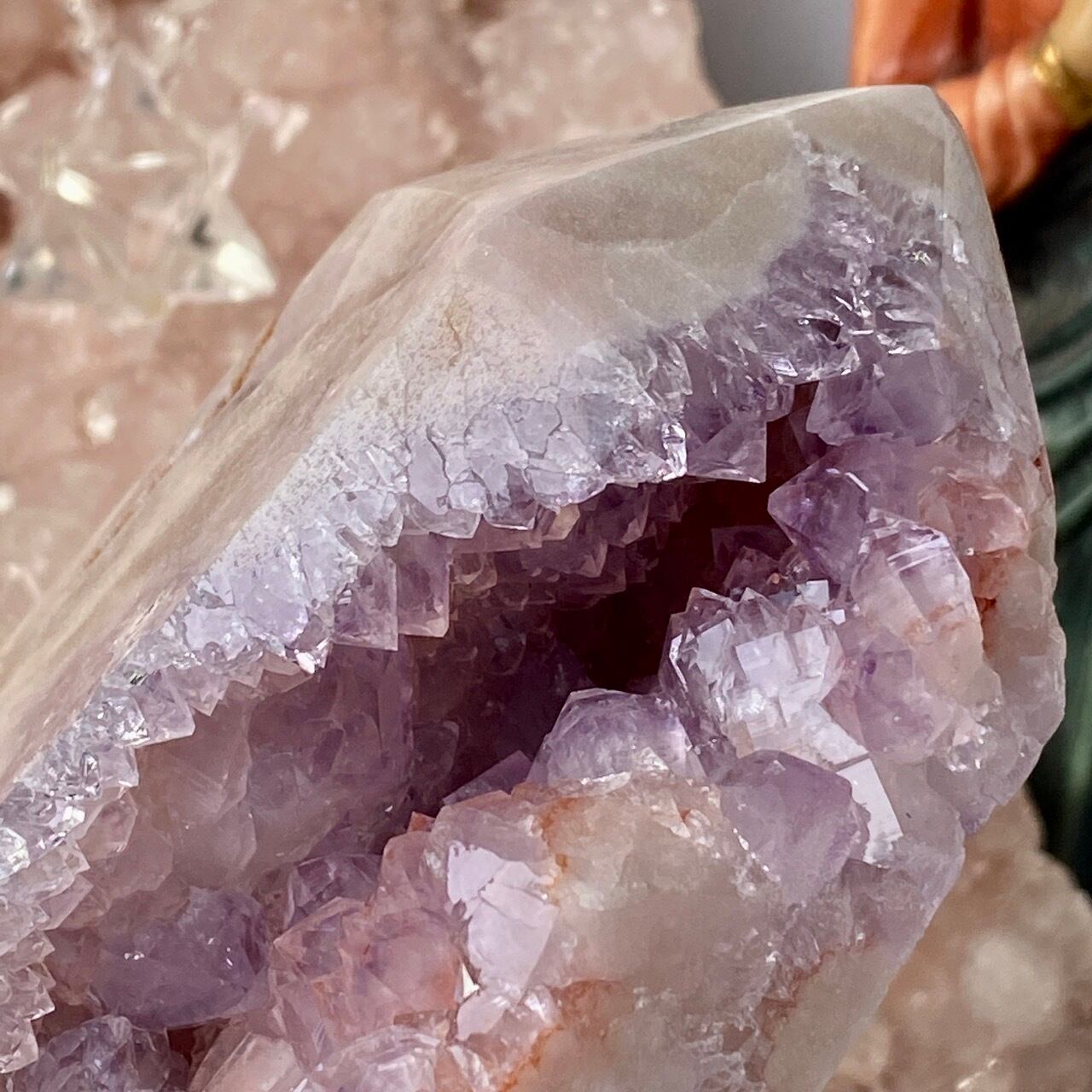 ゴ、ゴ、ゴージャスなドゥルージー!動画や写真を撮影していた際に、あまりに神がかった美しさに心拍数が急上昇した子です。パープルとピンク、そして若干カーネリアン系の色味が加わった見事で可憐なカラーコンビネーションのドゥルージーはスパイキーなだけで無く、お花の様な形状のクラスターが見られたり、また透明感も抜群です。ベースは若干黄身がかったアイボリー(エクリュ)系の色味で、インテリアに馴染みます。