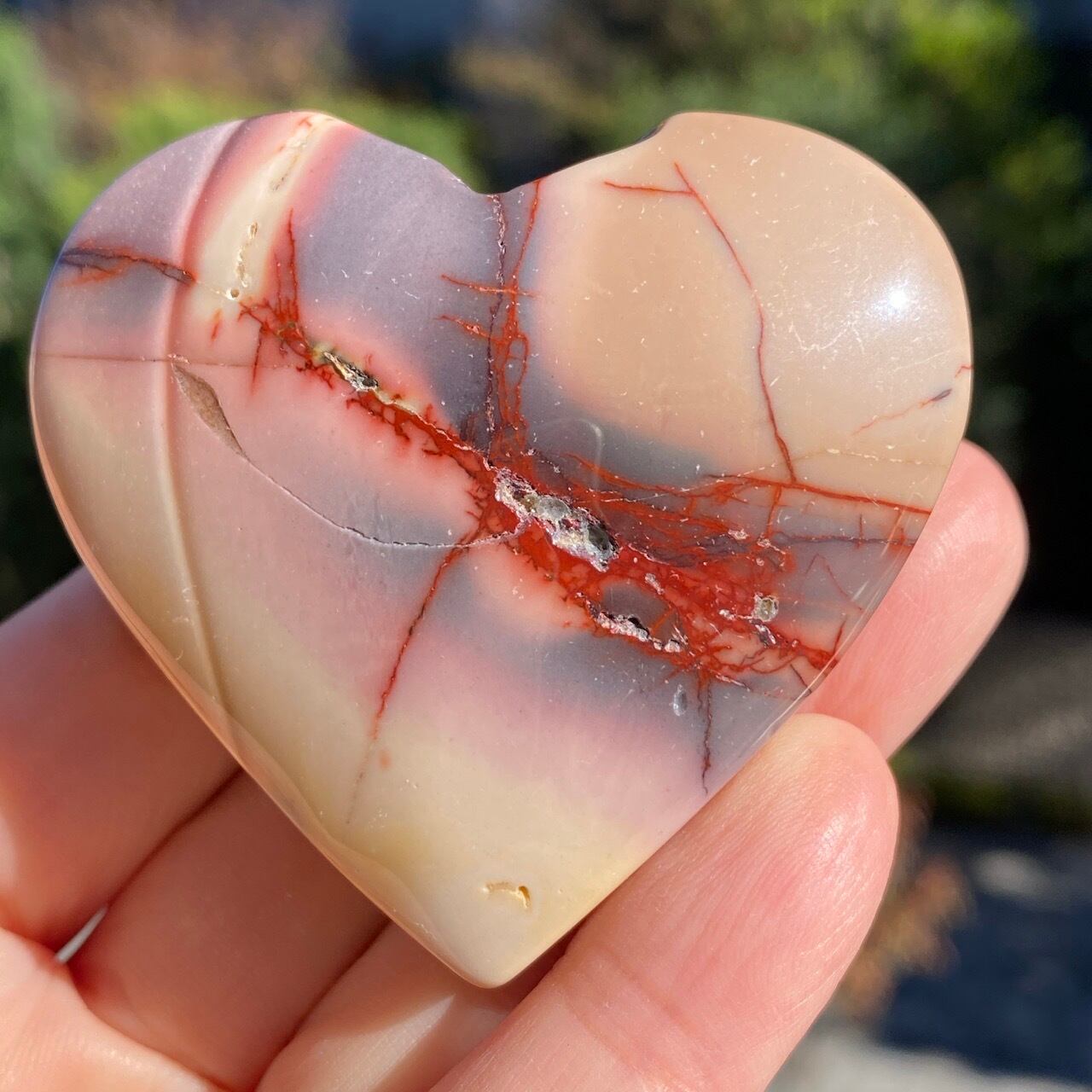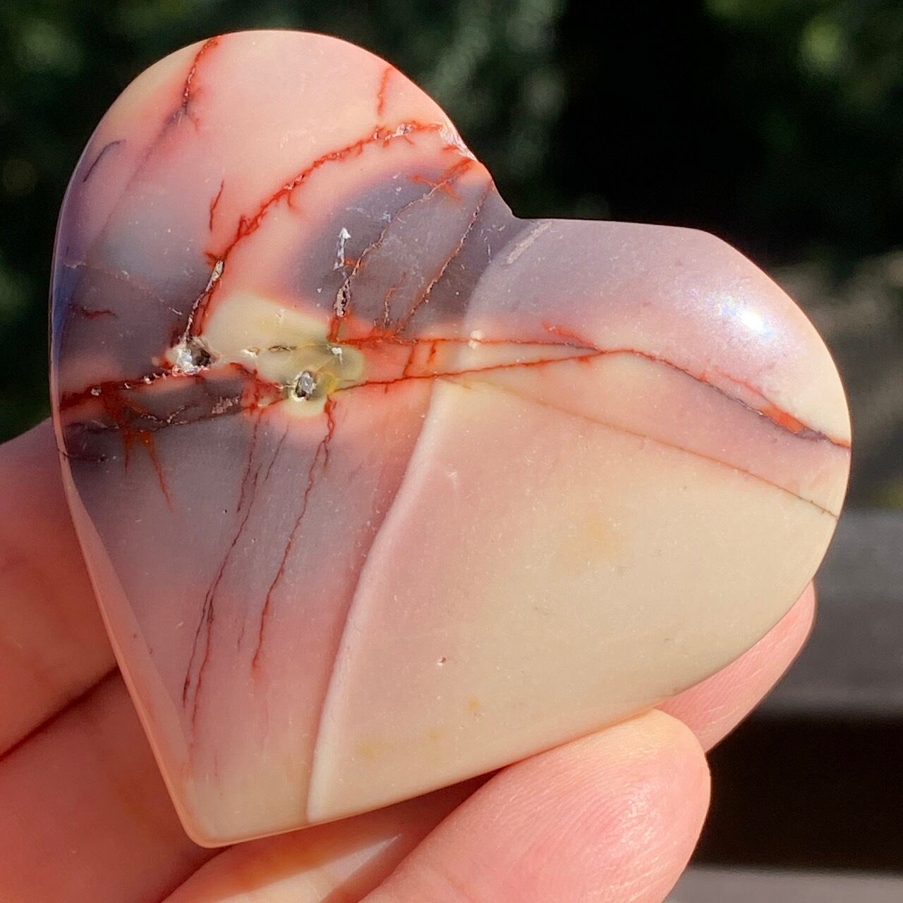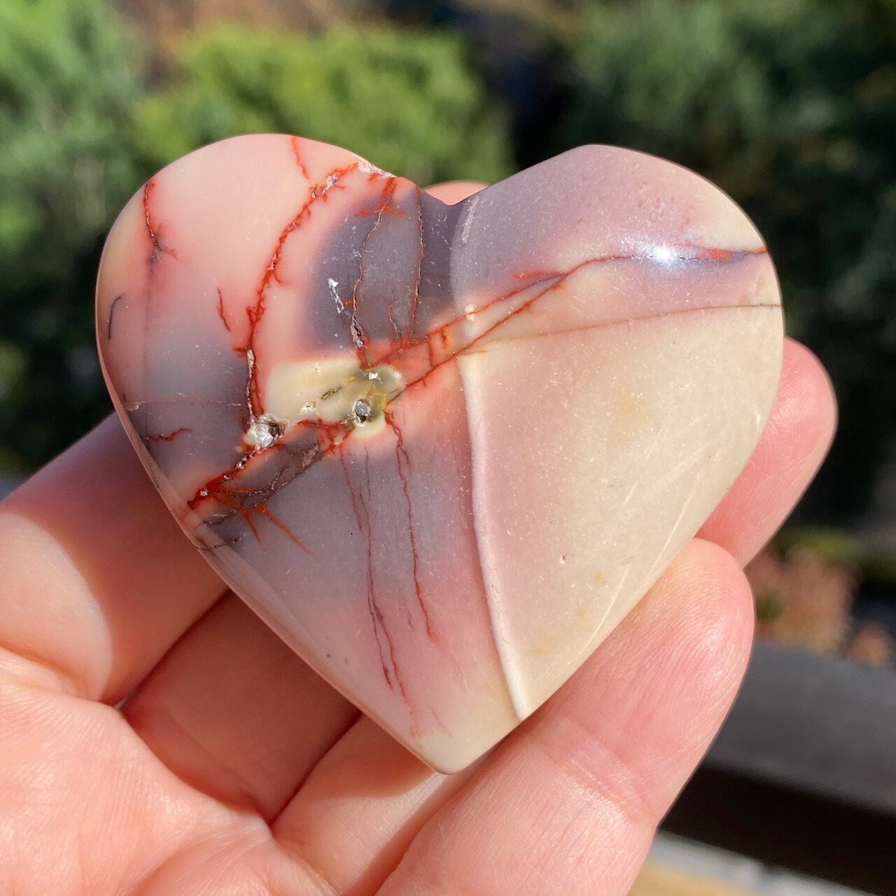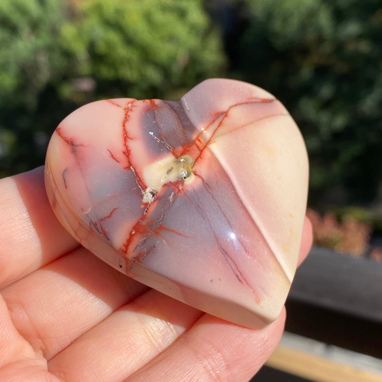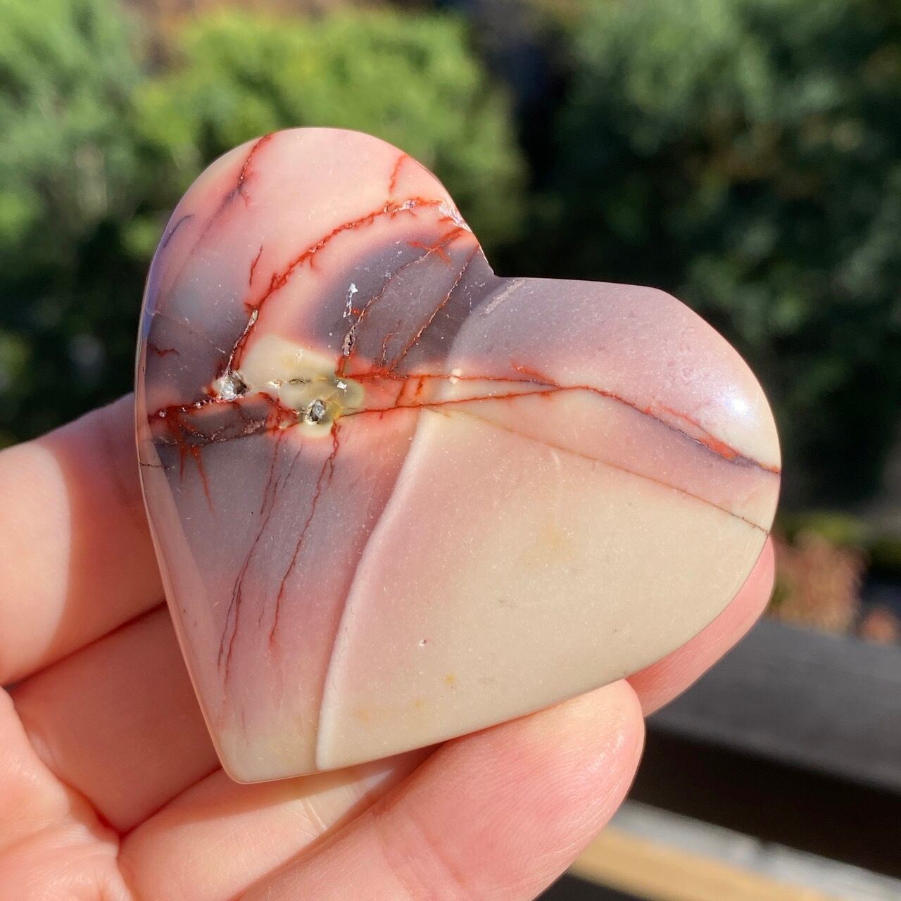 ほんのりピンクに色付いたベージュのベースに、パープルの模様とムーカイト特有の赤紫の線が映える、ぷっくりとしたキュートなハートです。