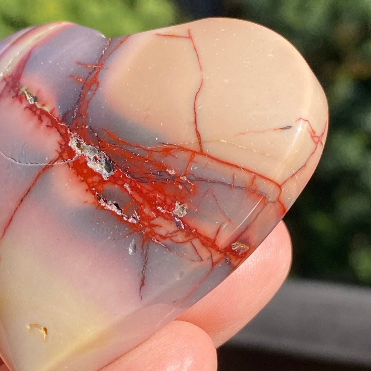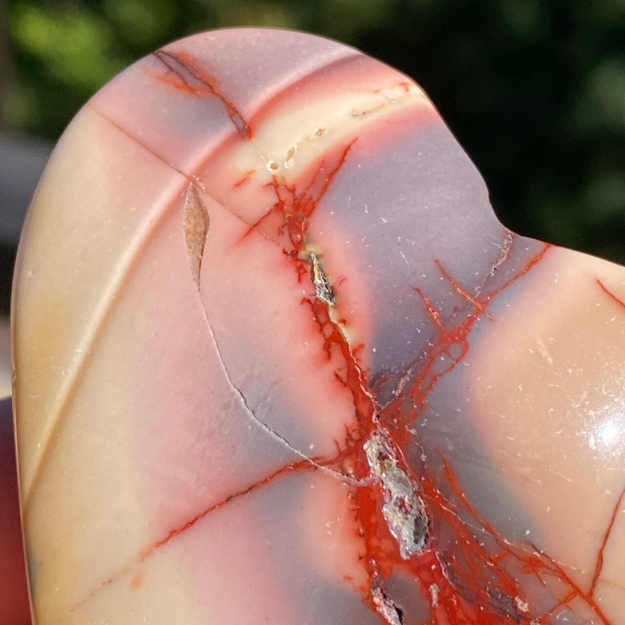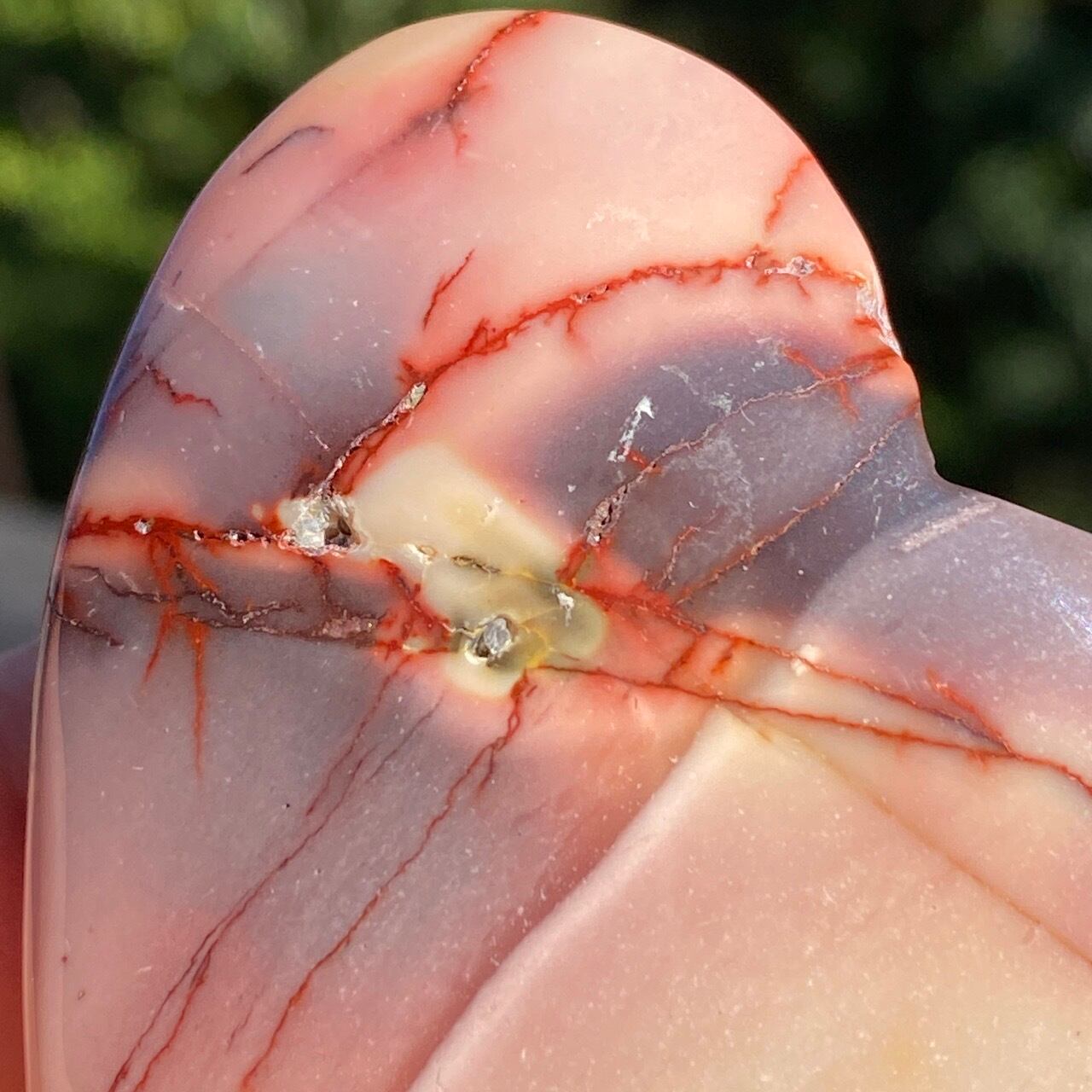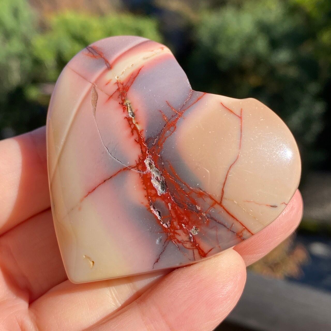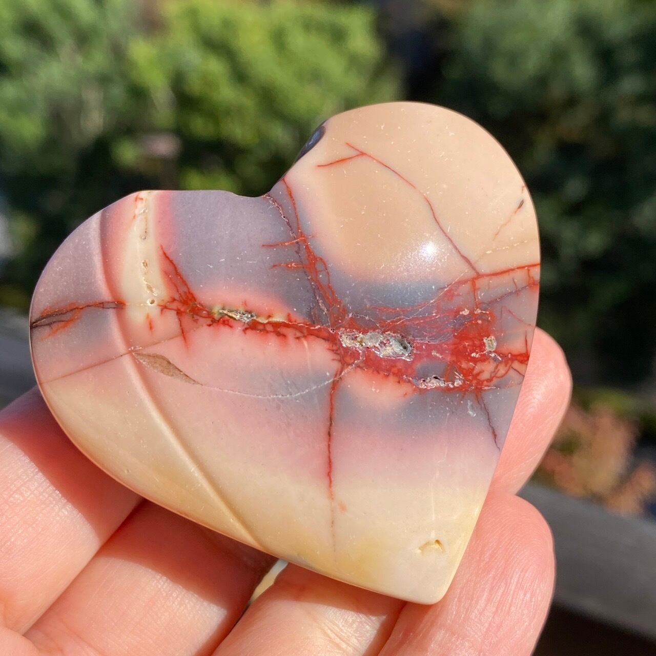 ほんのりピンクに色付いたベージュのベースに、パープルの模様とムーカイト特有の赤紫の線が映える、ぷっくりとしたキュートなハートです。
