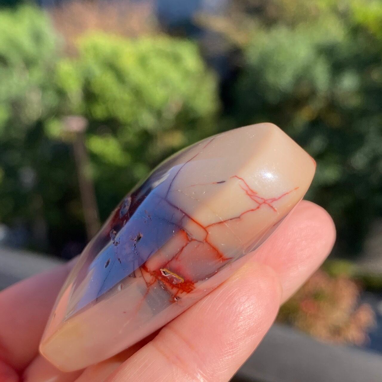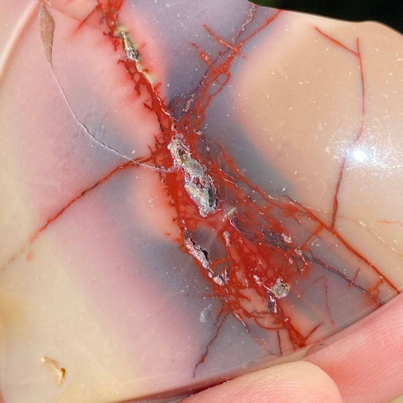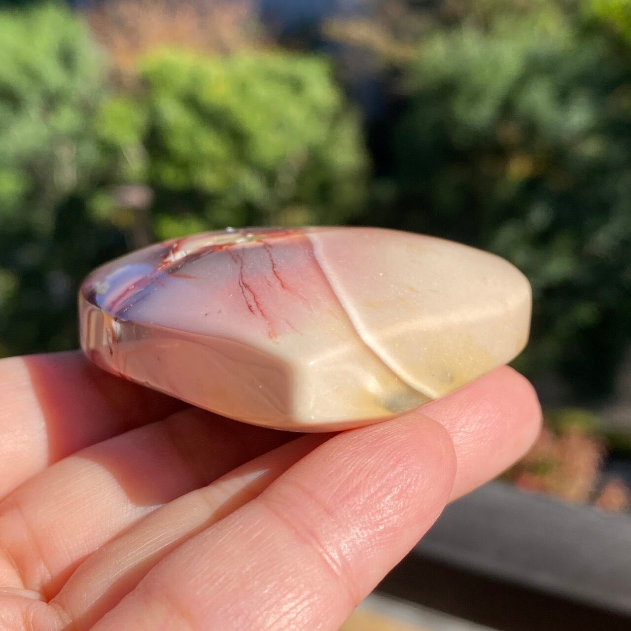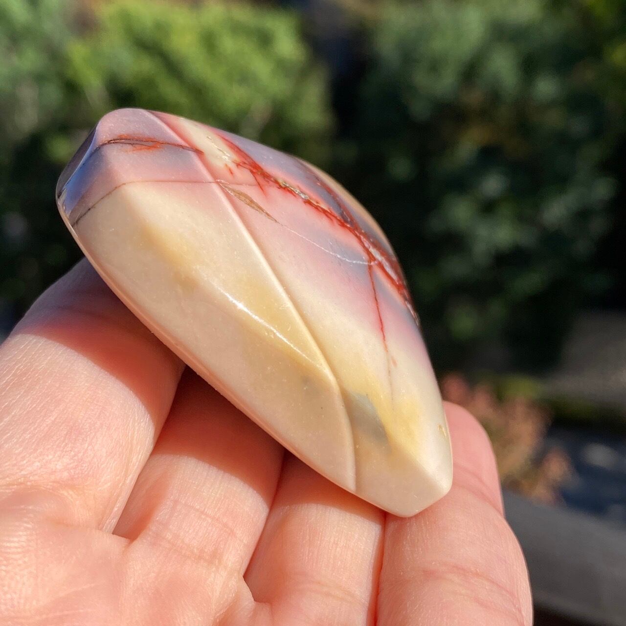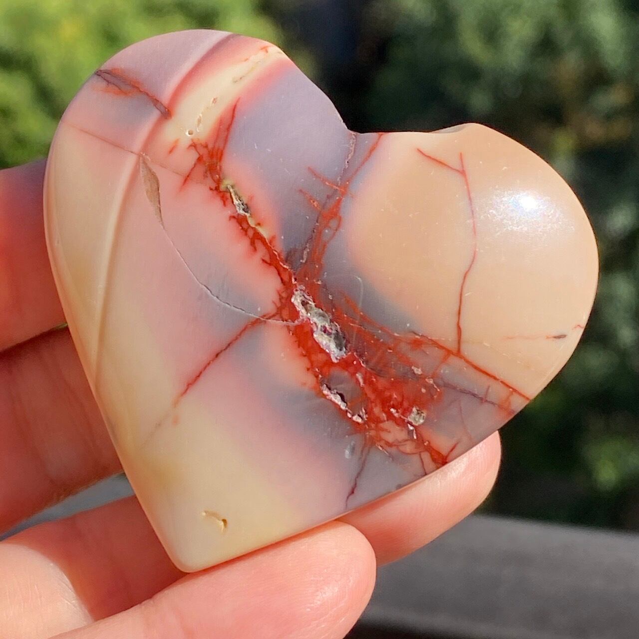 ほんのりピンクに色付いたベージュのベースに、パープルの模様とムーカイト特有の赤紫の線が映える、ぷっくりとしたキュートなハートです。