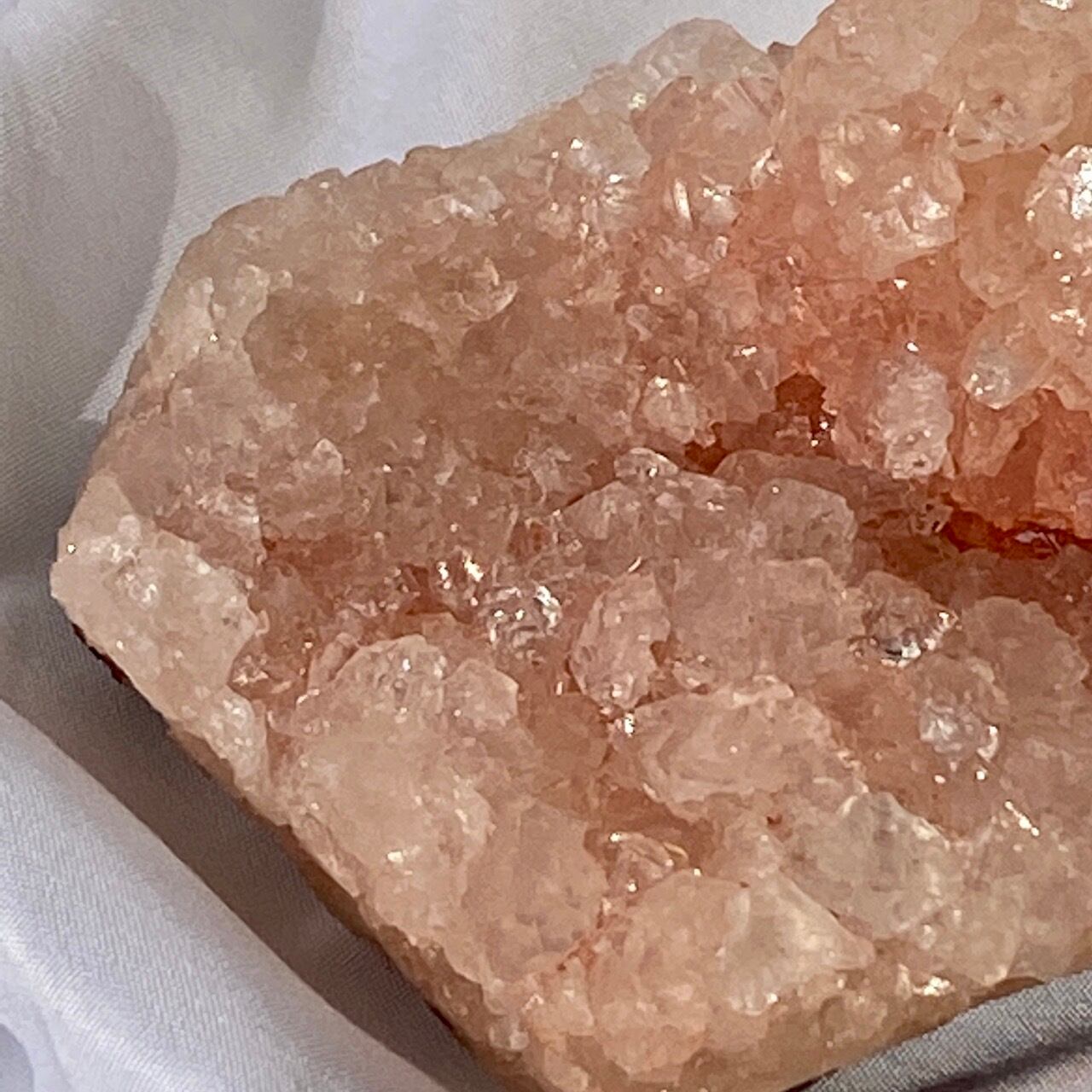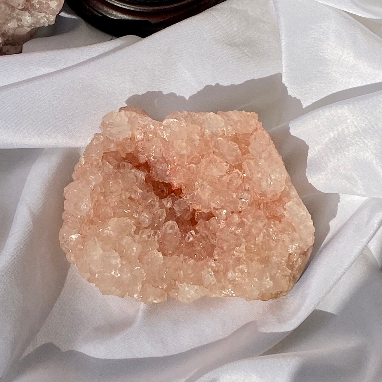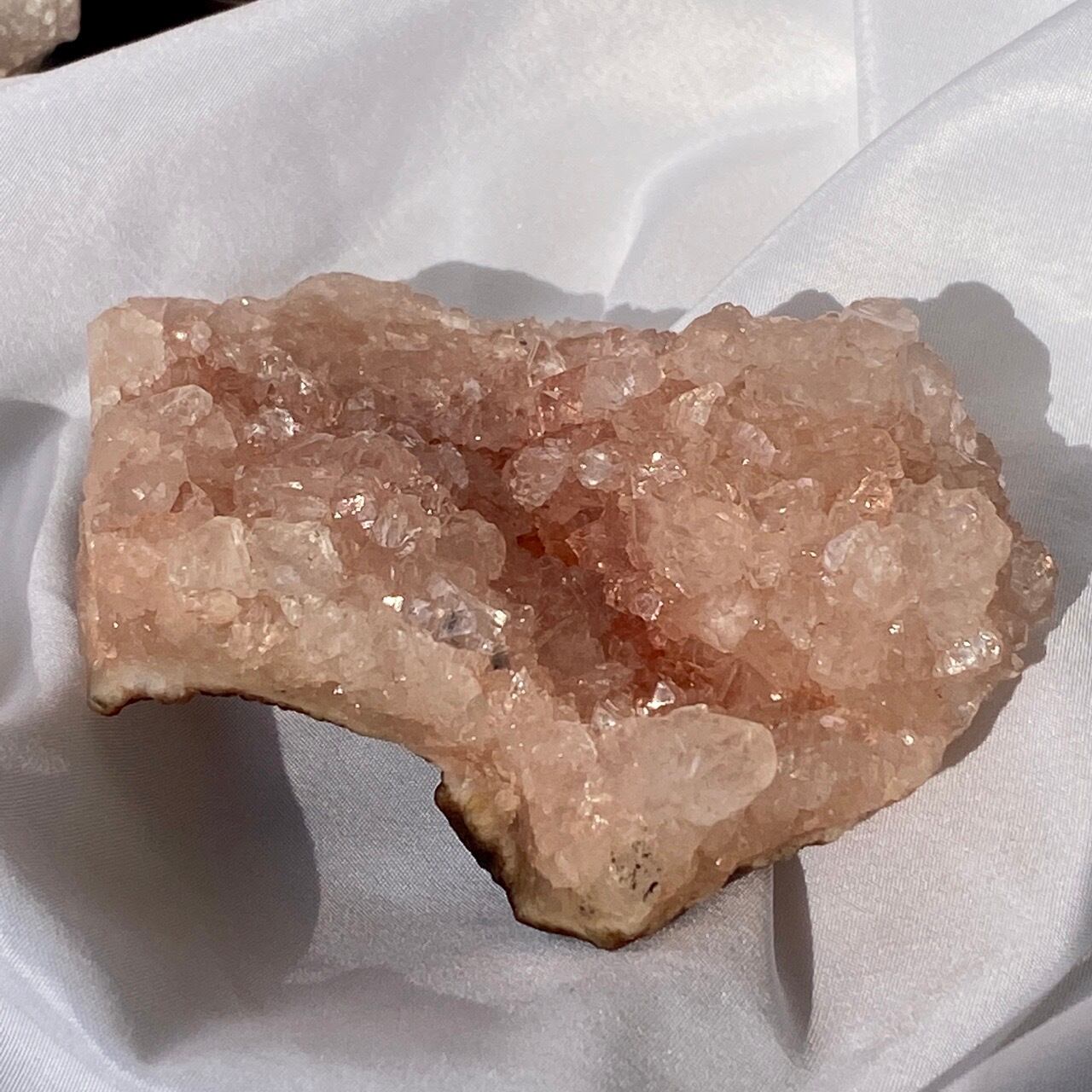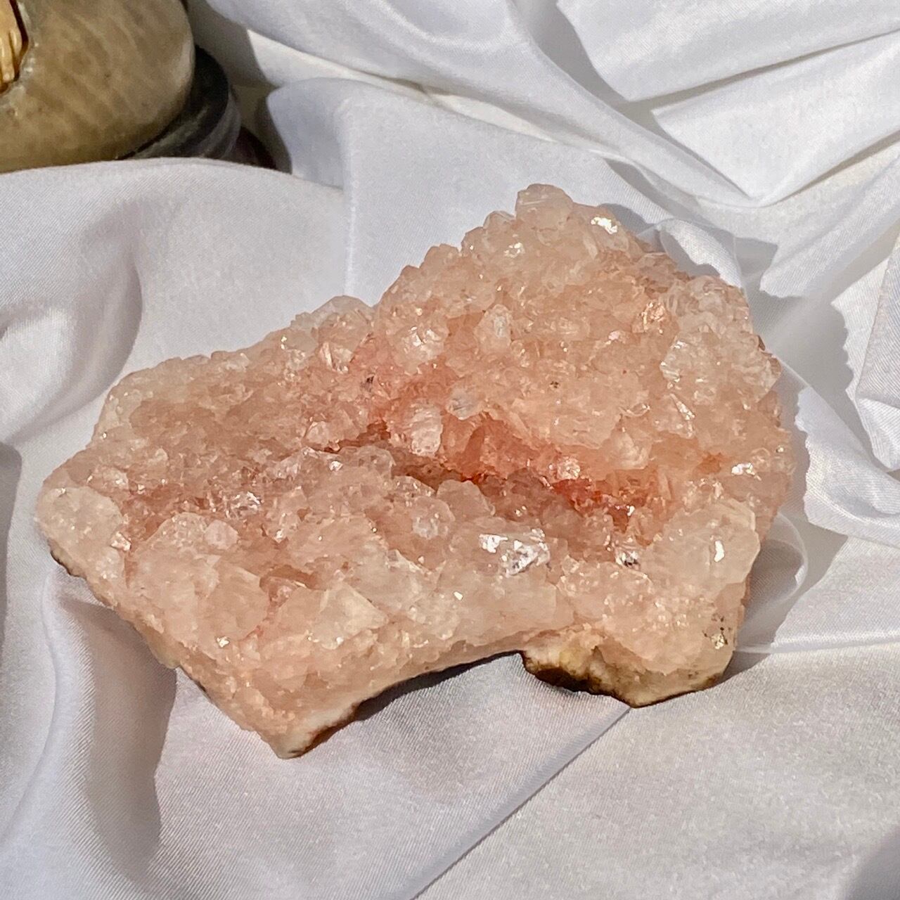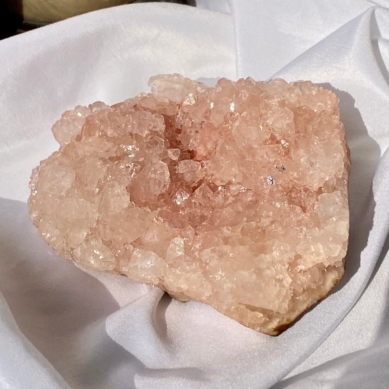 アポフィライトの中でも産出量が少ないため希少性が高い、インド産のピンクアポフィライトのクラスターです。希少なグリーンアポフィライトよりも流通量が極めて少なく、見つける事ができたとしても、色やクオリティにばらつきがあります。