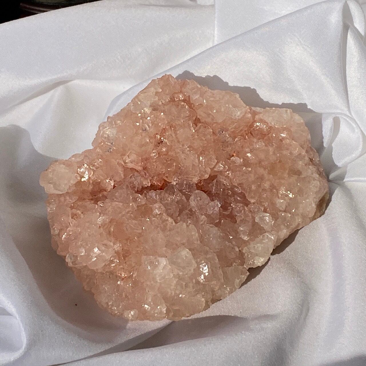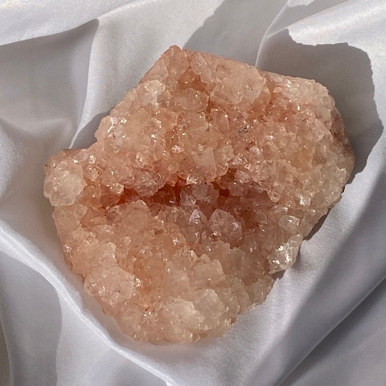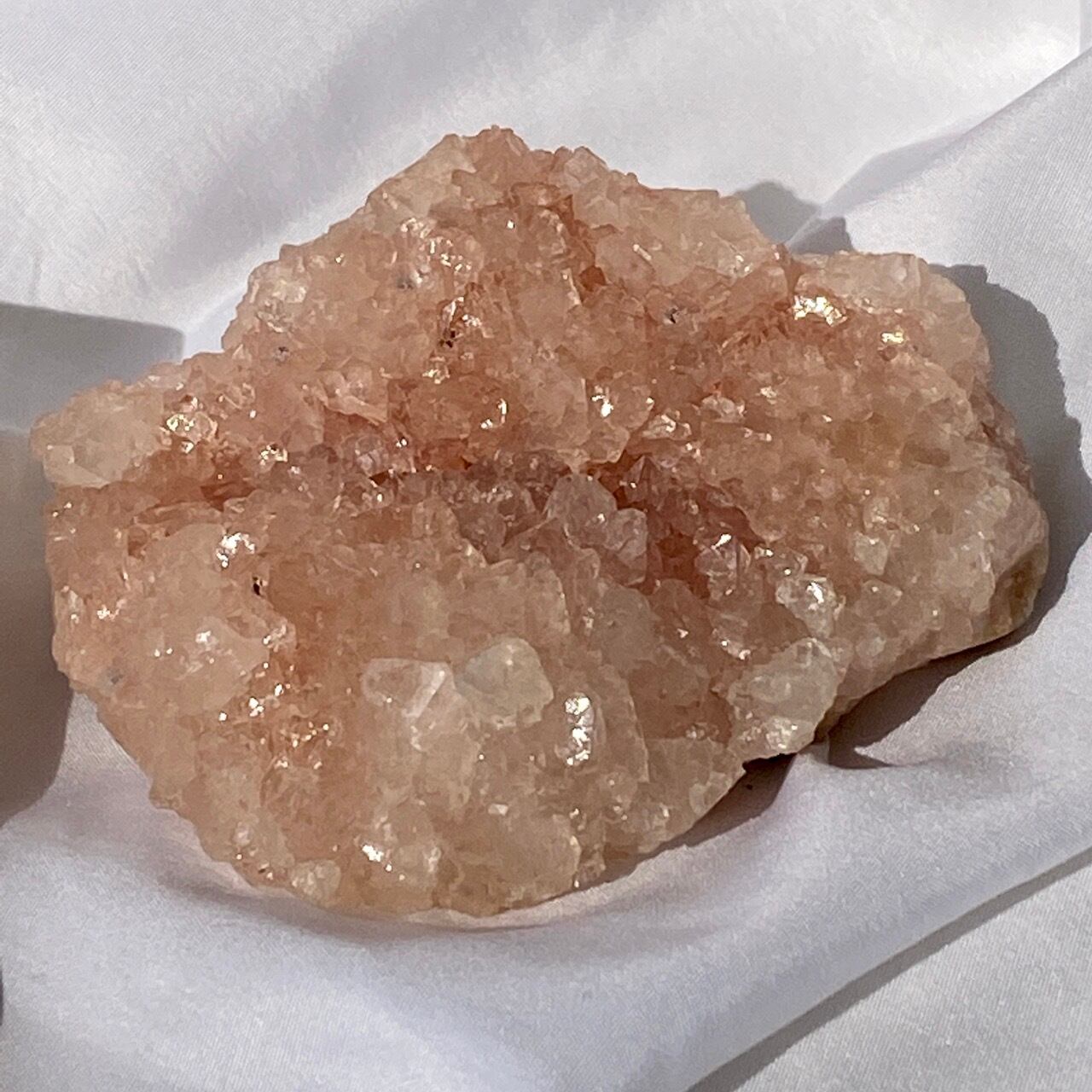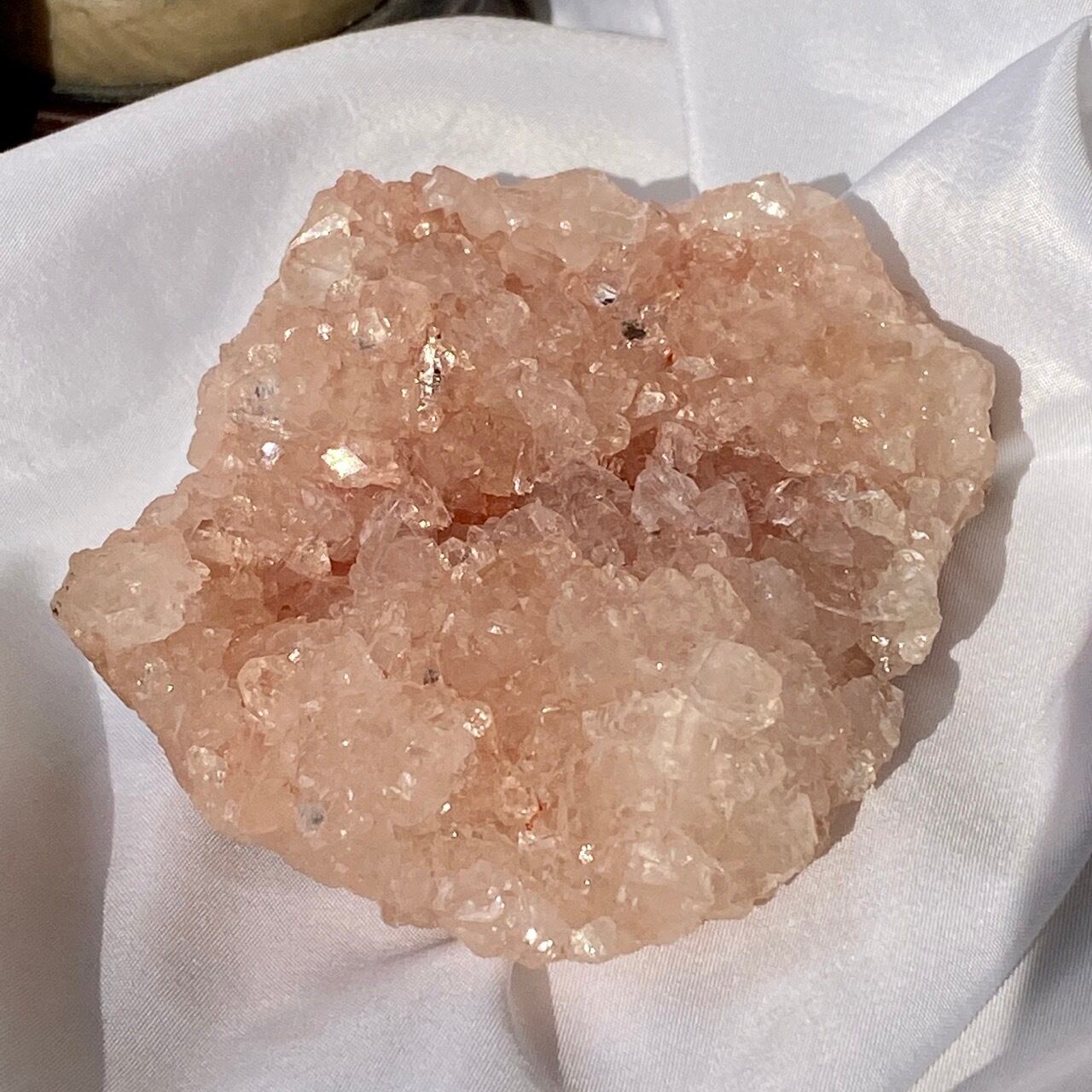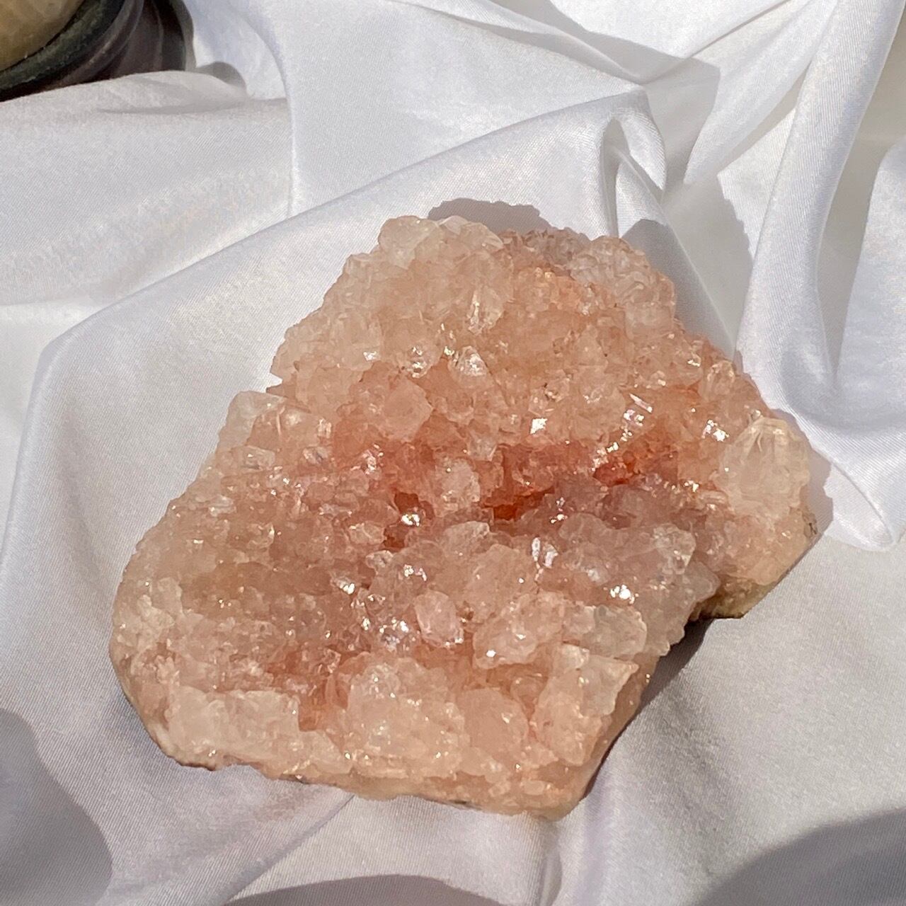 アポフィライトの中でも産出量が少ないため希少性が高い、インド産のピンクアポフィライトのクラスターです。希少なグリーンアポフィライトよりも流通量が極めて少なく、見つける事ができたとしても、色やクオリティにばらつきがあります。