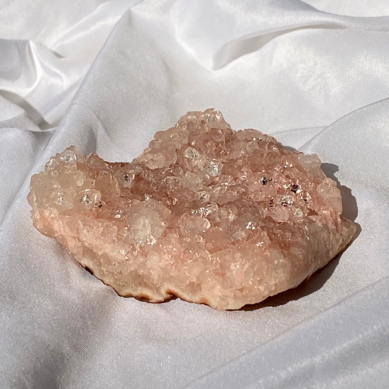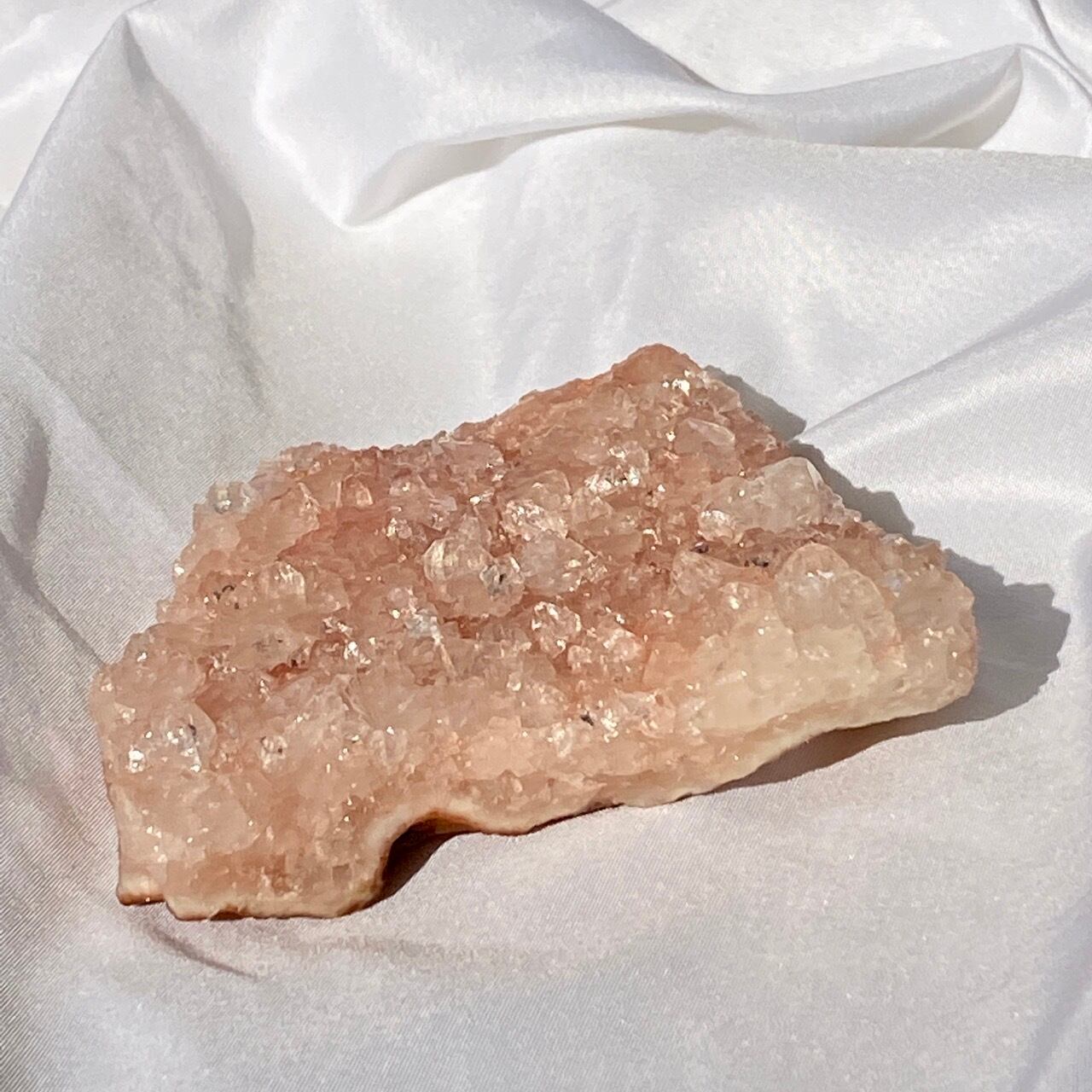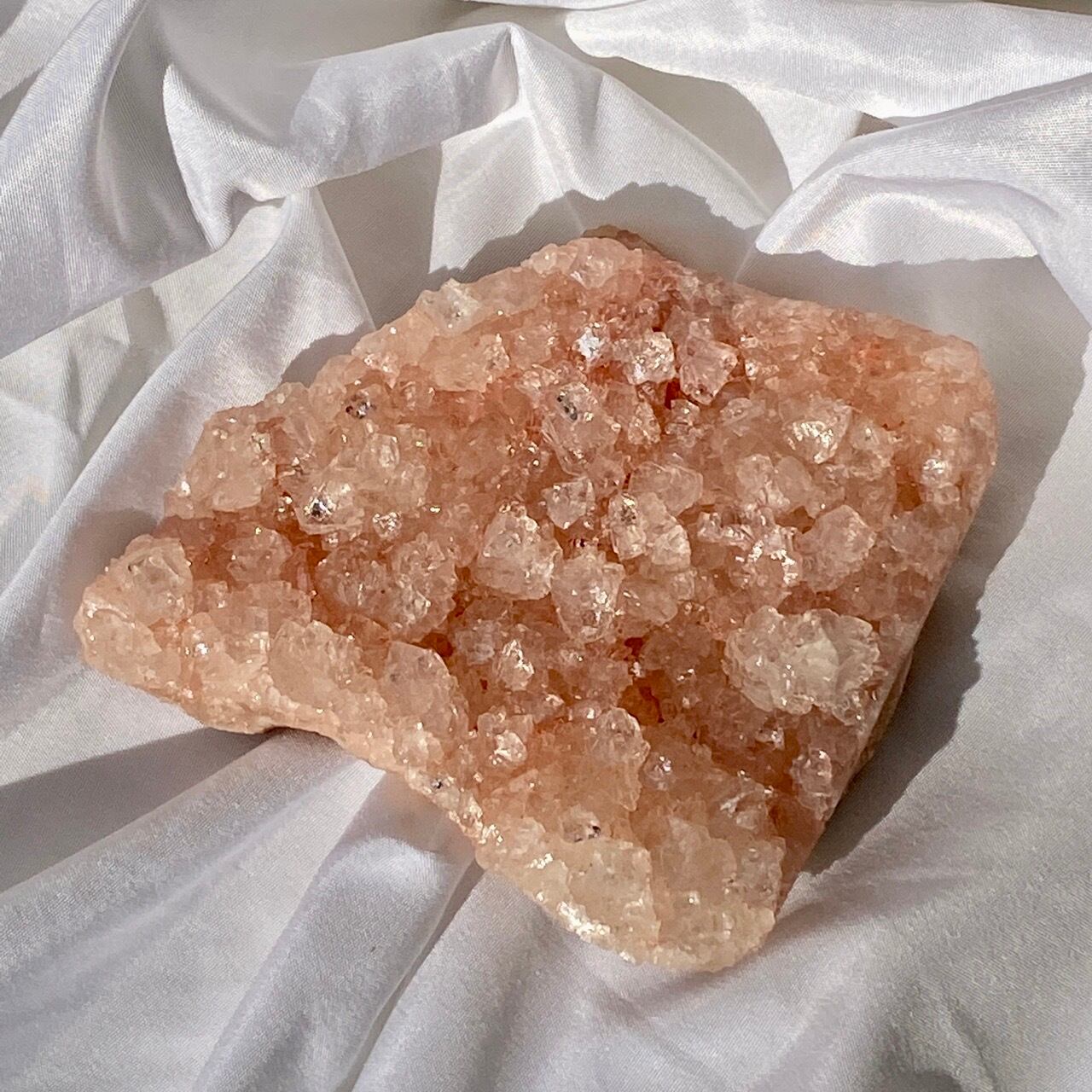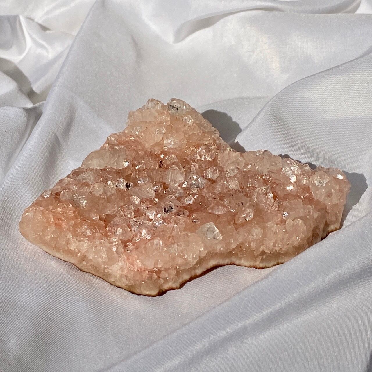 アポフィライトの中でも産出量が少ないため希少性が高い、インド産のピンクアポフィライトのクラスターです。希少なグリーンアポフィライトよりも流通量が極めて少なく、見つける事ができたとしても、色やクオリティにばらつきがあります。