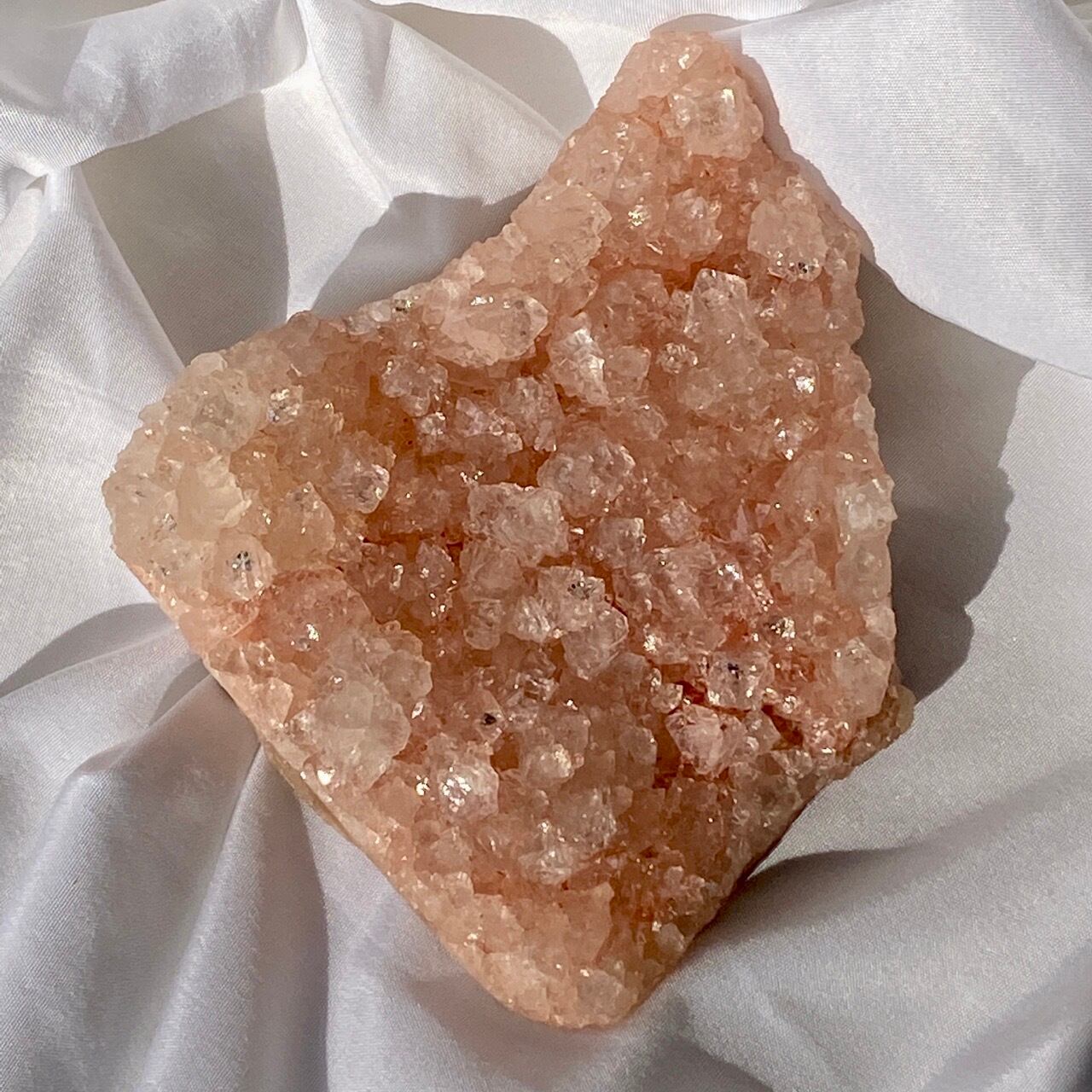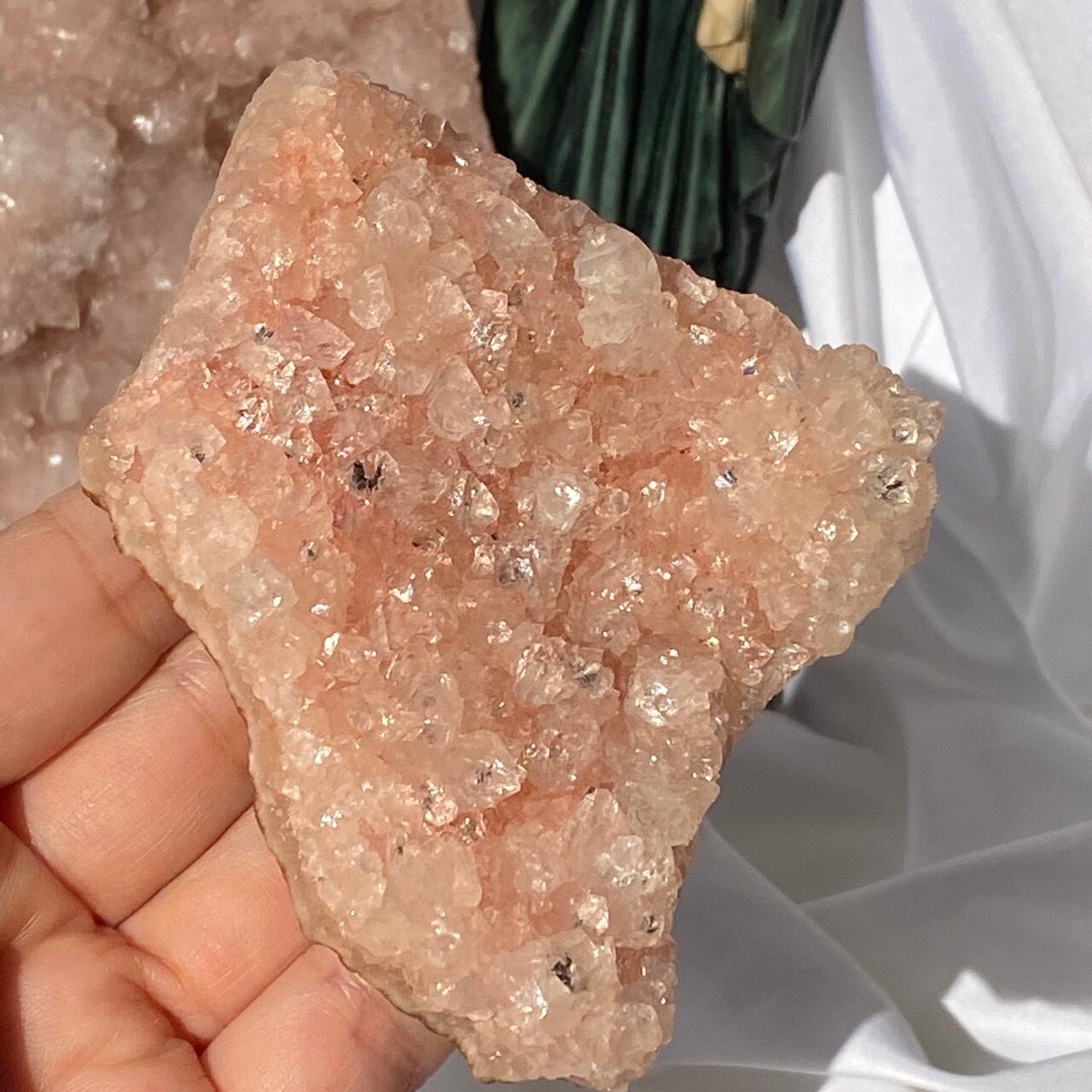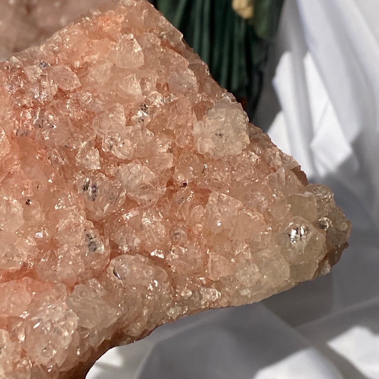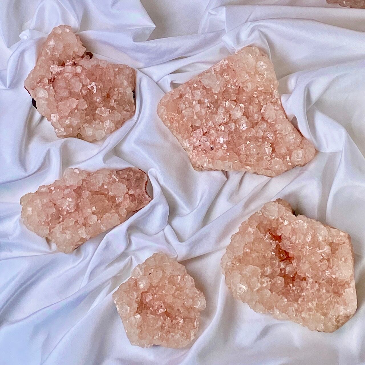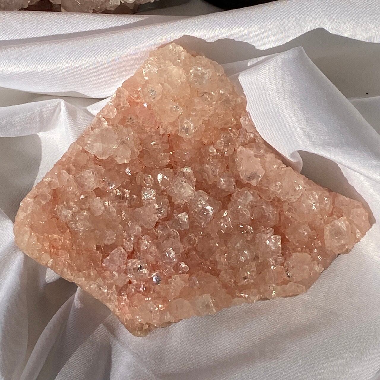 アポフィライトの中でも産出量が少ないため希少性が高い、インド産のピンクアポフィライトのクラスターです。希少なグリーンアポフィライトよりも流通量が極めて少なく、見つける事ができたとしても、色やクオリティにばらつきがあります。