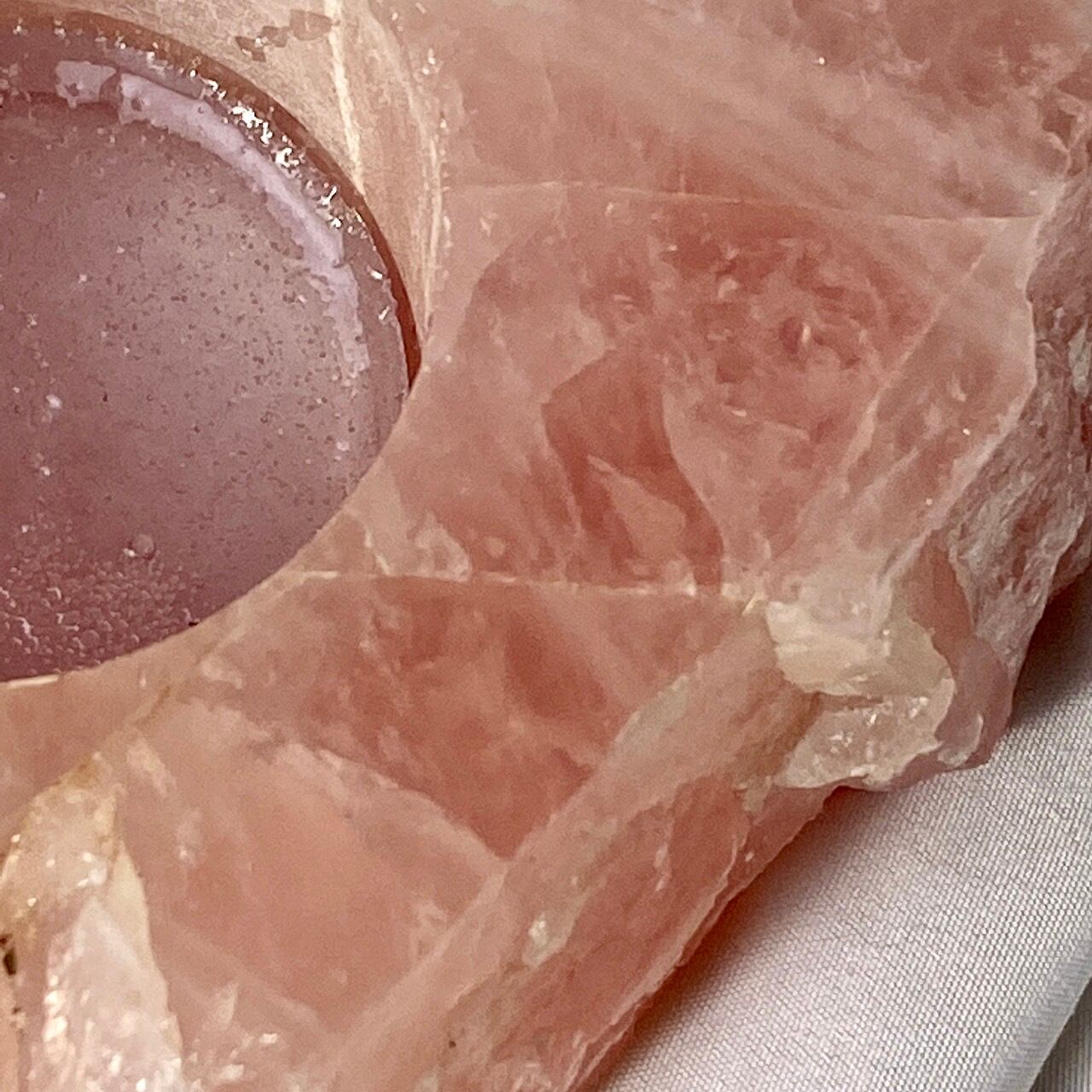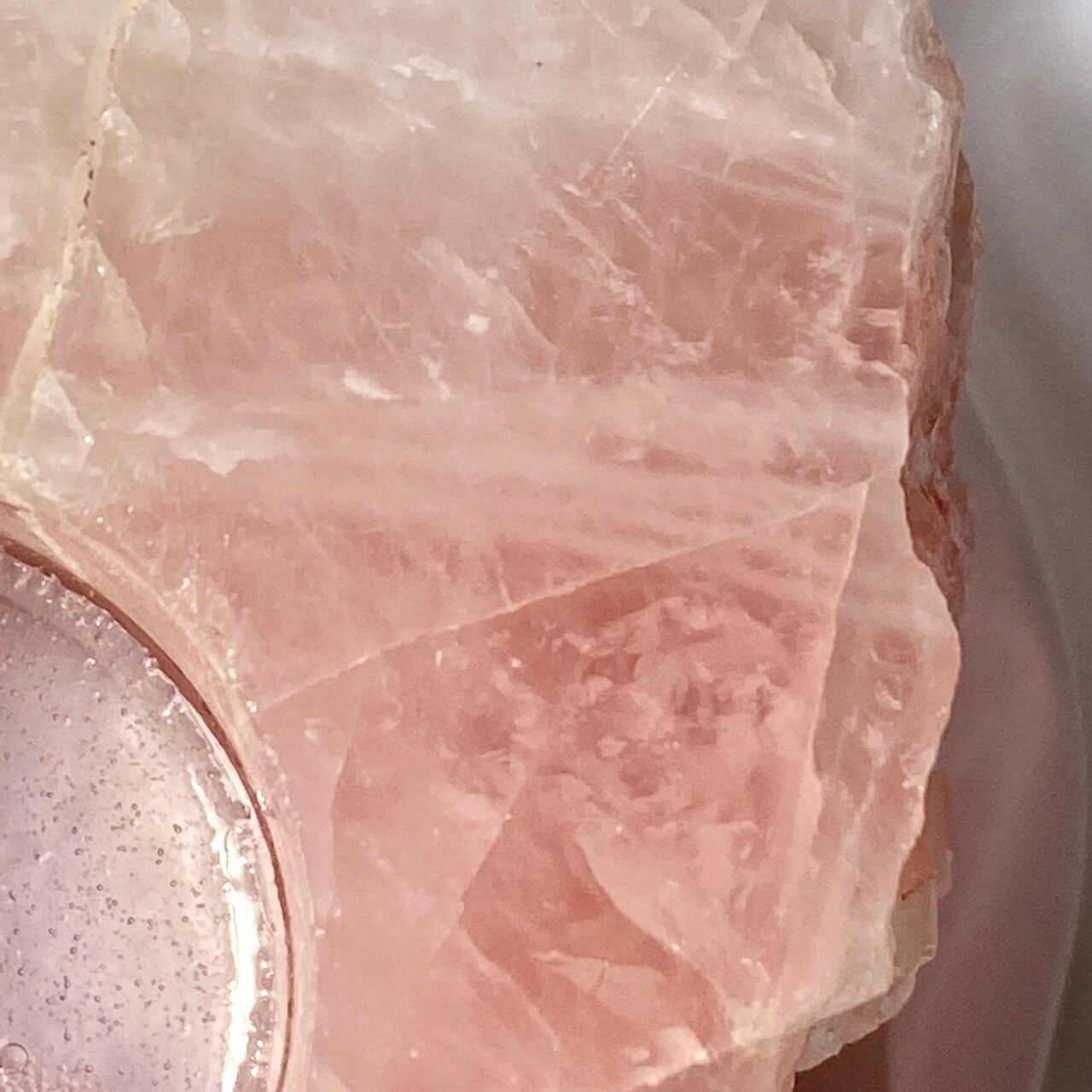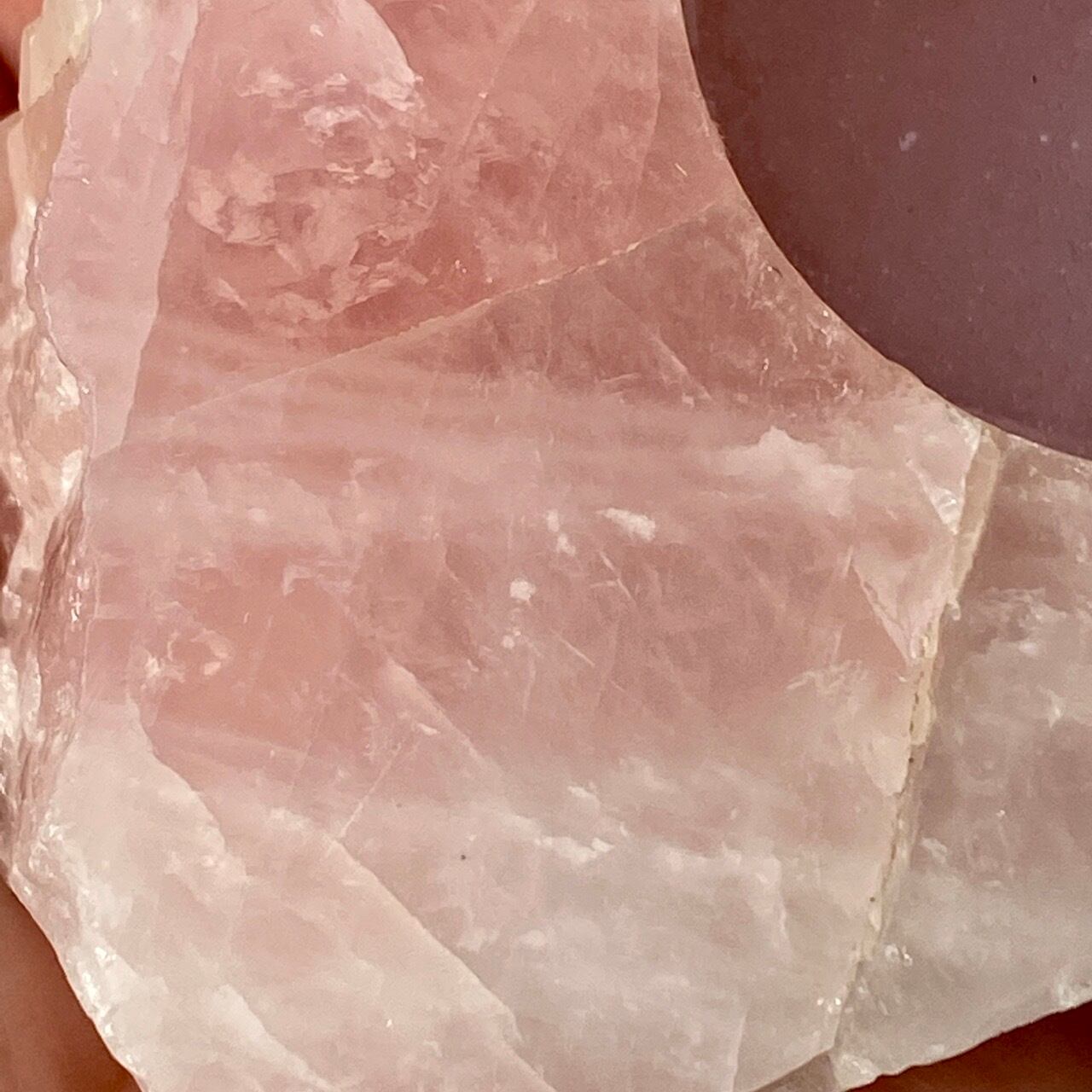 撮影すると、どうしてもオレンジっぽい色味に写っていますが、実物はローズクォーツ特有のピンクっぽい(一部白っぽい)色味になります。