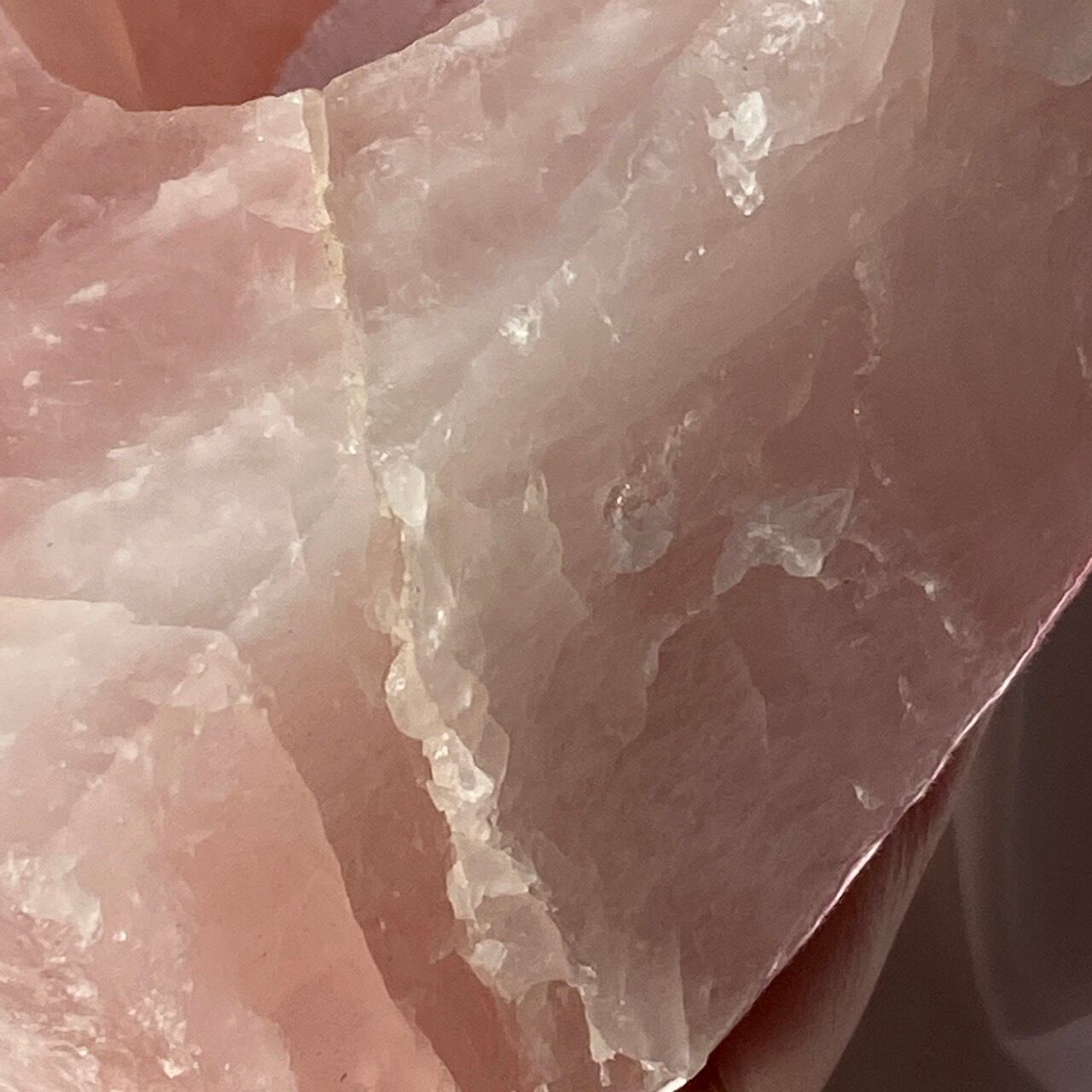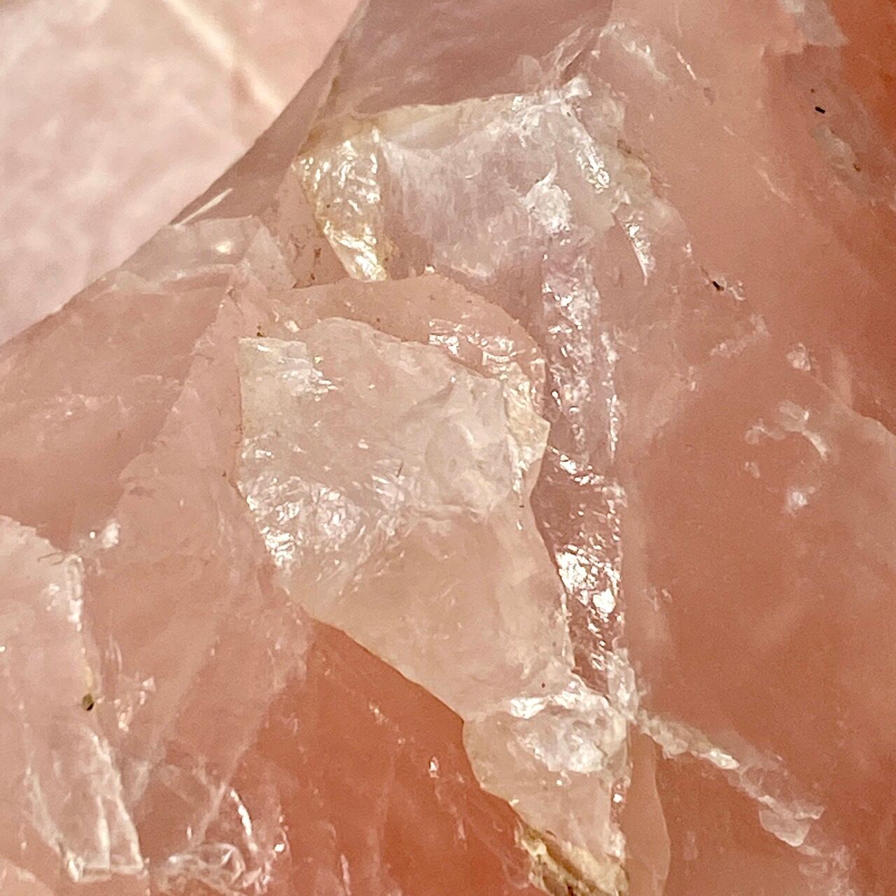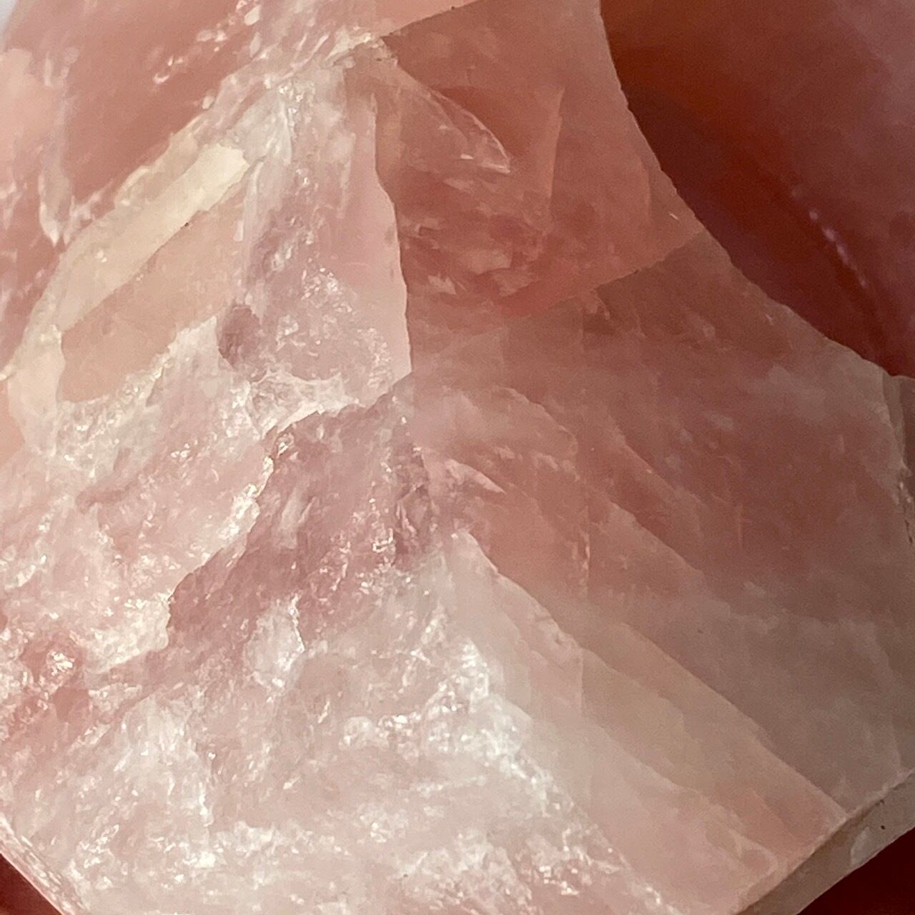 撮影すると、どうしてもオレンジっぽい色味に写っていますが、実物はローズクォーツ特有のピンクっぽい(一部白っぽい)色味になります。