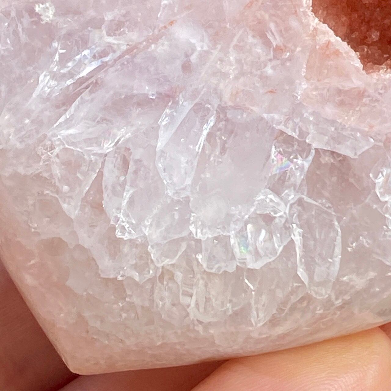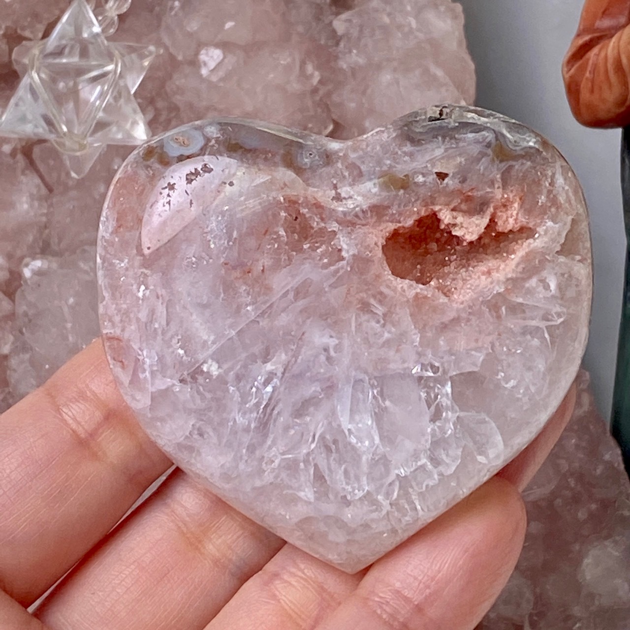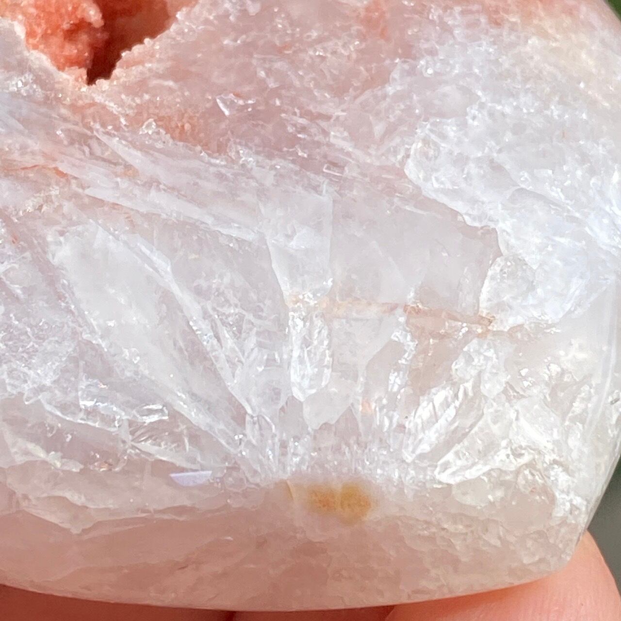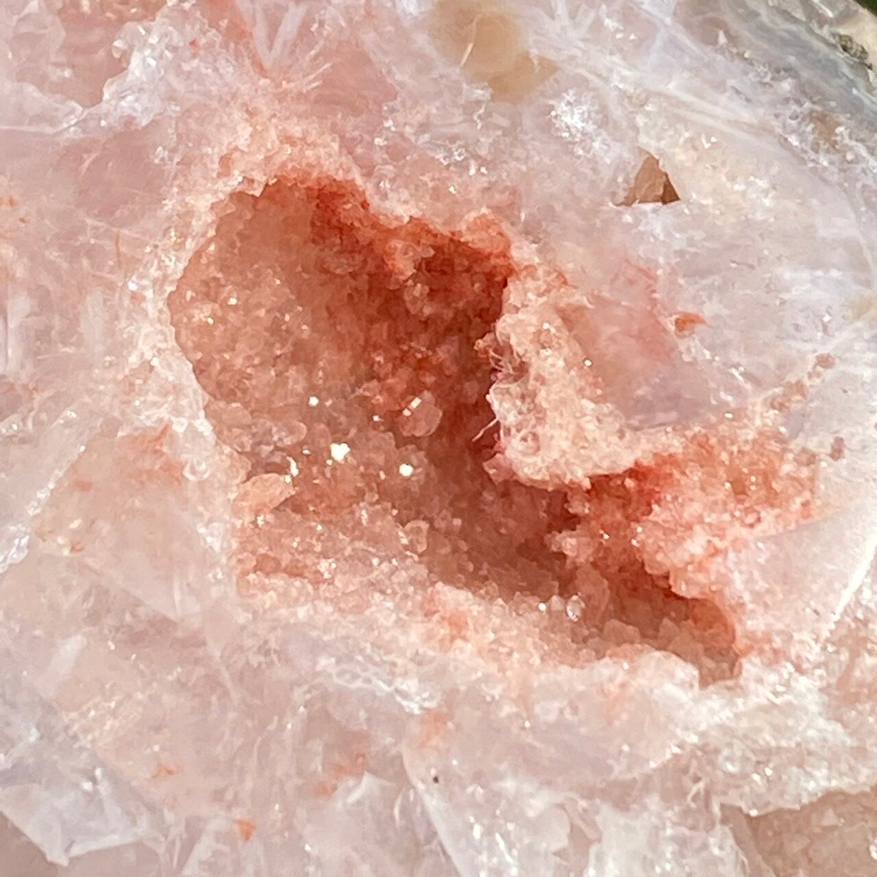 両面にアプリコット系色味のドゥルージー(片方は人魚や金魚の様な形をしています)があり、殆どの部分が結晶化したクォーツで覆われている素敵な子です。上部におそらく若干グリーンジャスパーの母岩的なものが透けて見えます。